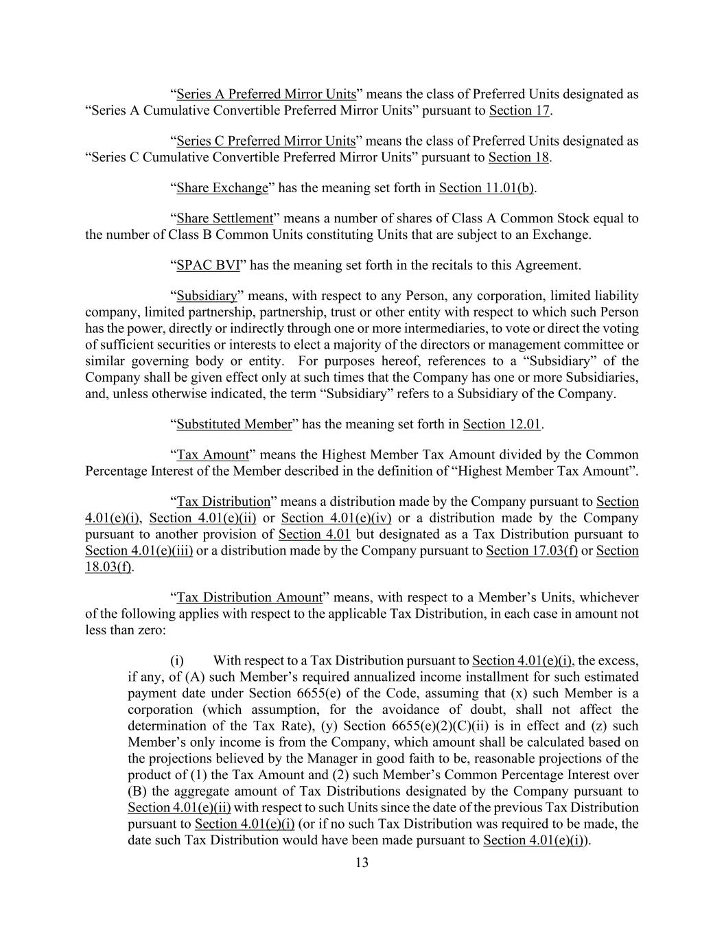 13 “Series A Preferred Mirror Units” means the class of Preferred Units designated as “Series A Cumulative Convertible Preferred Mirror Units” pursuant to Section 17. “Series C Preferred Mirror Units” means the class of Preferred Units designated as “Series C Cumulative Convertible Preferred Mirror Units” pursuant to Section 18. “Share Exchange” has the meaning set forth in Section 11.01(b). “Share Settlement” means a number of shares of Class A Common Stock equal to the number of Class B Common Units constituting Units that are subject to an Exchange. “SPAC BVI” has the meaning set forth in the recitals to this Agreement. “Subsidiary” means, with respect to any Person, any corporation, limited liability company, limited partnership, partnership, trust or other entity with respect to which such Person has the power, directly or indirectly through one or more intermediaries, to vote or direct the voting of sufficient securities or interests to elect a majority of the directors or management committee or similar governing body or entity. For purposes hereof, references to a “Subsidiary” of the Company shall be given effect only at such times that the Company has one or more Subsidiaries, and, unless otherwise indicated, the term “Subsidiary” refers to a Subsidiary of the Company. “Substituted Member” has the meaning set forth in Section 12.01. “Tax Amount” means the Highest Member Tax Amount divided by the Common Percentage Interest of the Member described in the definition of “Highest Member Tax Amount”. “Tax Distribution” means a distribution made by the Company pursuant to Section 4.01(e)(i), Section 4.01(e)(ii) or Section 4.01(e)(iv) or a distribution made by the Company pursuant to another provision of Section 4.01 but designated as a Tax Distribution pursuant to Section 4.01(e)(iii) or a distribution made by the Company pursuant to Section 17.03(f) or Section 18.03(f). “Tax Distribution Amount” means, with respect to a Member’s Units, whichever of the following applies with respect to the applicable Tax Distribution, in each case in amount not less than zero: (i) With respect to a Tax Distribution pursuant to Section 4.01(e)(i), the excess, if any, of (A) such Member’s required annualized income installment for such estimated payment date under Section 6655(e) of the Code, assuming that (x) such Member is a corporation (which assumption, for the avoidance of doubt, shall not affect the determination of the Tax Rate), (y) Section 6655(e)(2)(C)(ii) is in effect and (z) such Member’s only income is from the Company, which amount shall be calculated based on the projections believed by the Manager in good faith to be, reasonable projections of the product of (1) the Tax Amount and (2) such Member’s Common Percentage Interest over (B) the aggregate amount of Tax Distributions designated by the Company pursuant to Section 4.01(e)(ii) with respect to such Units since the date of the previous Tax Distribution pursuant to Section 4.01(e)(i) (or if no such Tax Distribution was required to be made, the date such Tax Distribution would have been made pursuant to Section 4.01(e)(i)).