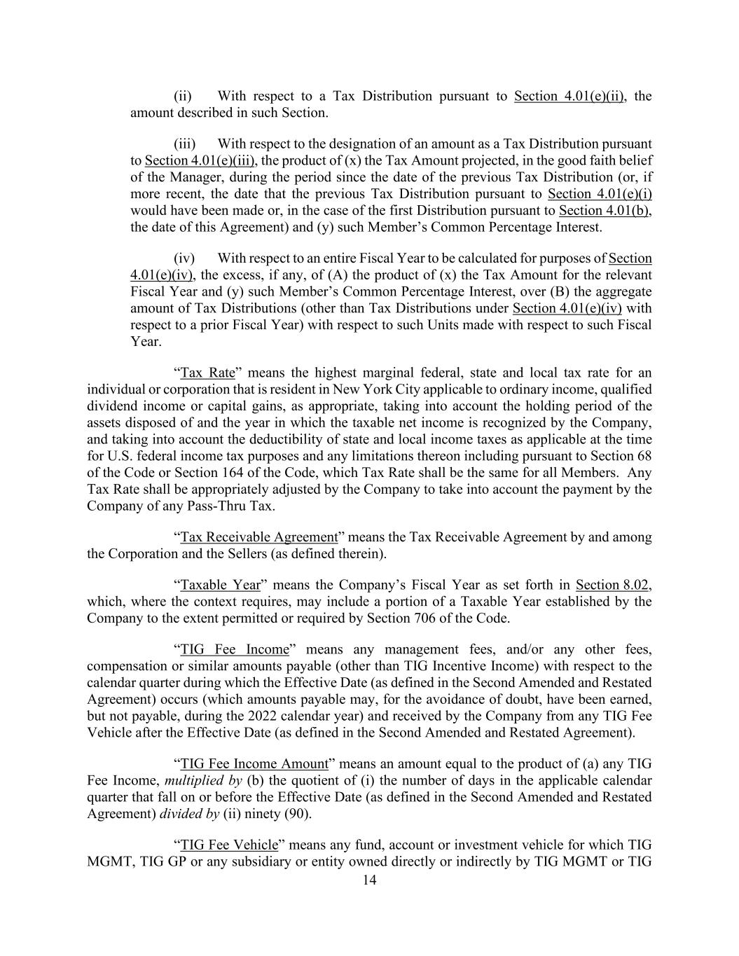 14 (ii) With respect to a Tax Distribution pursuant to Section 4.01(e)(ii), the amount described in such Section. (iii) With respect to the designation of an amount as a Tax Distribution pursuant to Section 4.01(e)(iii), the product of (x) the Tax Amount projected, in the good faith belief of the Manager, during the period since the date of the previous Tax Distribution (or, if more recent, the date that the previous Tax Distribution pursuant to Section 4.01(e)(i) would have been made or, in the case of the first Distribution pursuant to Section 4.01(b), the date of this Agreement) and (y) such Member’s Common Percentage Interest. (iv) With respect to an entire Fiscal Year to be calculated for purposes of Section 4.01(e)(iv), the excess, if any, of (A) the product of (x) the Tax Amount for the relevant Fiscal Year and (y) such Member’s Common Percentage Interest, over (B) the aggregate amount of Tax Distributions (other than Tax Distributions under Section 4.01(e)(iv) with respect to a prior Fiscal Year) with respect to such Units made with respect to such Fiscal Year. “Tax Rate” means the highest marginal federal, state and local tax rate for an individual or corporation that is resident in New York City applicable to ordinary income, qualified dividend income or capital gains, as appropriate, taking into account the holding period of the assets disposed of and the year in which the taxable net income is recognized by the Company, and taking into account the deductibility of state and local income taxes as applicable at the time for U.S. federal income tax purposes and any limitations thereon including pursuant to Section 68 of the Code or Section 164 of the Code, which Tax Rate shall be the same for all Members. Any Tax Rate shall be appropriately adjusted by the Company to take into account the payment by the Company of any Pass-Thru Tax. “Tax Receivable Agreement” means the Tax Receivable Agreement by and among the Corporation and the Sellers (as defined therein). “Taxable Year” means the Company’s Fiscal Year as set forth in Section 8.02, which, where the context requires, may include a portion of a Taxable Year established by the Company to the extent permitted or required by Section 706 of the Code. “TIG Fee Income” means any management fees, and/or any other fees, compensation or similar amounts payable (other than TIG Incentive Income) with respect to the calendar quarter during which the Effective Date (as defined in the Second Amended and Restated Agreement) occurs (which amounts payable may, for the avoidance of doubt, have been earned, but not payable, during the 2022 calendar year) and received by the Company from any TIG Fee Vehicle after the Effective Date (as defined in the Second Amended and Restated Agreement). “TIG Fee Income Amount” means an amount equal to the product of (a) any TIG Fee Income, multiplied by (b) the quotient of (i) the number of days in the applicable calendar quarter that fall on or before the Effective Date (as defined in the Second Amended and Restated Agreement) divided by (ii) ninety (90). “TIG Fee Vehicle” means any fund, account or investment vehicle for which TIG MGMT, TIG GP or any subsidiary or entity owned directly or indirectly by TIG MGMT or TIG