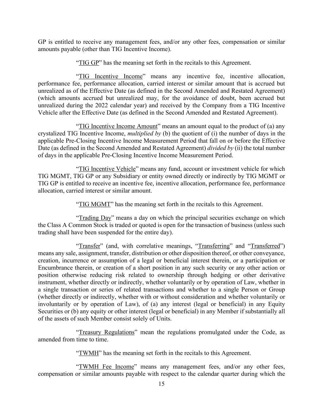 15 GP is entitled to receive any management fees, and/or any other fees, compensation or similar amounts payable (other than TIG Incentive Income). “TIG GP” has the meaning set forth in the recitals to this Agreement. “TIG Incentive Income” means any incentive fee, incentive allocation, performance fee, performance allocation, carried interest or similar amount that is accrued but unrealized as of the Effective Date (as defined in the Second Amended and Restated Agreement) (which amounts accrued but unrealized may, for the avoidance of doubt, been accrued but unrealized during the 2022 calendar year) and received by the Company from a TIG Incentive Vehicle after the Effective Date (as defined in the Second Amended and Restated Agreement). “TIG Incentive Income Amount” means an amount equal to the product of (a) any crystalized TIG Incentive Income, multiplied by (b) the quotient of (i) the number of days in the applicable Pre-Closing Incentive Income Measurement Period that fall on or before the Effective Date (as defined in the Second Amended and Restated Agreement) divided by (ii) the total number of days in the applicable Pre-Closing Incentive Income Measurement Period. “TIG Incentive Vehicle” means any fund, account or investment vehicle for which TIG MGMT, TIG GP or any Subsidiary or entity owned directly or indirectly by TIG MGMT or TIG GP is entitled to receive an incentive fee, incentive allocation, performance fee, performance allocation, carried interest or similar amount. “TIG MGMT” has the meaning set forth in the recitals to this Agreement. “Trading Day” means a day on which the principal securities exchange on which the Class A Common Stock is traded or quoted is open for the transaction of business (unless such trading shall have been suspended for the entire day). “Transfer” (and, with correlative meanings, “Transferring” and “Transferred”) means any sale, assignment, transfer, distribution or other disposition thereof, or other conveyance, creation, incurrence or assumption of a legal or beneficial interest therein, or a participation or Encumbrance therein, or creation of a short position in any such security or any other action or position otherwise reducing risk related to ownership through hedging or other derivative instrument, whether directly or indirectly, whether voluntarily or by operation of Law, whether in a single transaction or series of related transactions and whether to a single Person or Group (whether directly or indirectly, whether with or without consideration and whether voluntarily or involuntarily or by operation of Law), of (a) any interest (legal or beneficial) in any Equity Securities or (b) any equity or other interest (legal or beneficial) in any Member if substantially all of the assets of such Member consist solely of Units. “Treasury Regulations” mean the regulations promulgated under the Code, as amended from time to time. “TWMH” has the meaning set forth in the recitals to this Agreement. “TWMH Fee Income” means any management fees, and/or any other fees, compensation or similar amounts payable with respect to the calendar quarter during which the