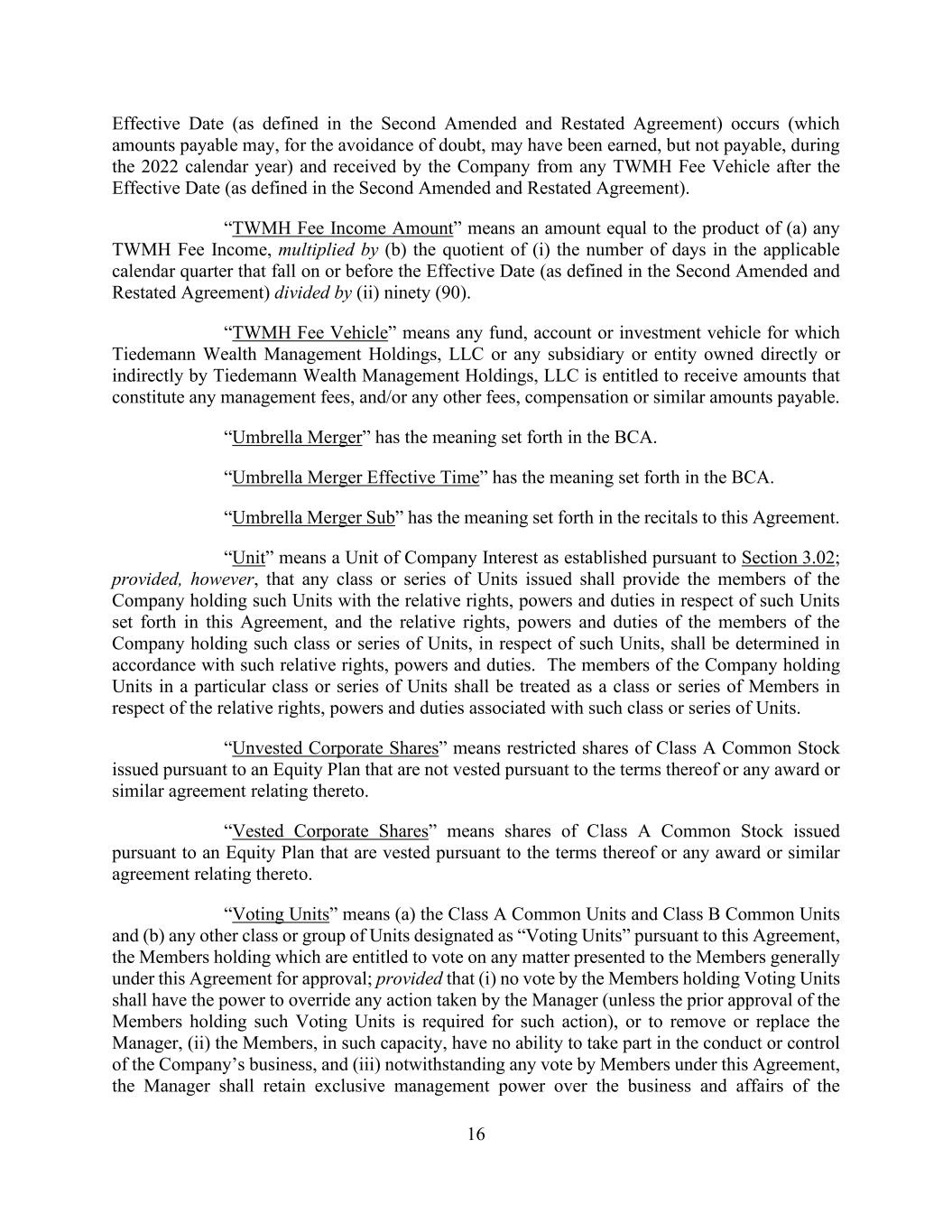 16 Effective Date (as defined in the Second Amended and Restated Agreement) occurs (which amounts payable may, for the avoidance of doubt, may have been earned, but not payable, during the 2022 calendar year) and received by the Company from any TWMH Fee Vehicle after the Effective Date (as defined in the Second Amended and Restated Agreement). “TWMH Fee Income Amount” means an amount equal to the product of (a) any TWMH Fee Income, multiplied by (b) the quotient of (i) the number of days in the applicable calendar quarter that fall on or before the Effective Date (as defined in the Second Amended and Restated Agreement) divided by (ii) ninety (90). “TWMH Fee Vehicle” means any fund, account or investment vehicle for which Tiedemann Wealth Management Holdings, LLC or any subsidiary or entity owned directly or indirectly by Tiedemann Wealth Management Holdings, LLC is entitled to receive amounts that constitute any management fees, and/or any other fees, compensation or similar amounts payable. “Umbrella Merger” has the meaning set forth in the BCA. “Umbrella Merger Effective Time” has the meaning set forth in the BCA. “Umbrella Merger Sub” has the meaning set forth in the recitals to this Agreement. “Unit” means a Unit of Company Interest as established pursuant to Section 3.02; provided, however, that any class or series of Units issued shall provide the members of the Company holding such Units with the relative rights, powers and duties in respect of such Units set forth in this Agreement, and the relative rights, powers and duties of the members of the Company holding such class or series of Units, in respect of such Units, shall be determined in accordance with such relative rights, powers and duties. The members of the Company holding Units in a particular class or series of Units shall be treated as a class or series of Members in respect of the relative rights, powers and duties associated with such class or series of Units. “Unvested Corporate Shares” means restricted shares of Class A Common Stock issued pursuant to an Equity Plan that are not vested pursuant to the terms thereof or any award or similar agreement relating thereto. “Vested Corporate Shares” means shares of Class A Common Stock issued pursuant to an Equity Plan that are vested pursuant to the terms thereof or any award or similar agreement relating thereto. “Voting Units” means (a) the Class A Common Units and Class B Common Units and (b) any other class or group of Units designated as “Voting Units” pursuant to this Agreement, the Members holding which are entitled to vote on any matter presented to the Members generally under this Agreement for approval; provided that (i) no vote by the Members holding Voting Units shall have the power to override any action taken by the Manager (unless the prior approval of the Members holding such Voting Units is required for such action), or to remove or replace the Manager, (ii) the Members, in such capacity, have no ability to take part in the conduct or control of the Company’s business, and (iii) notwithstanding any vote by Members under this Agreement, the Manager shall retain exclusive management power over the business and affairs of the