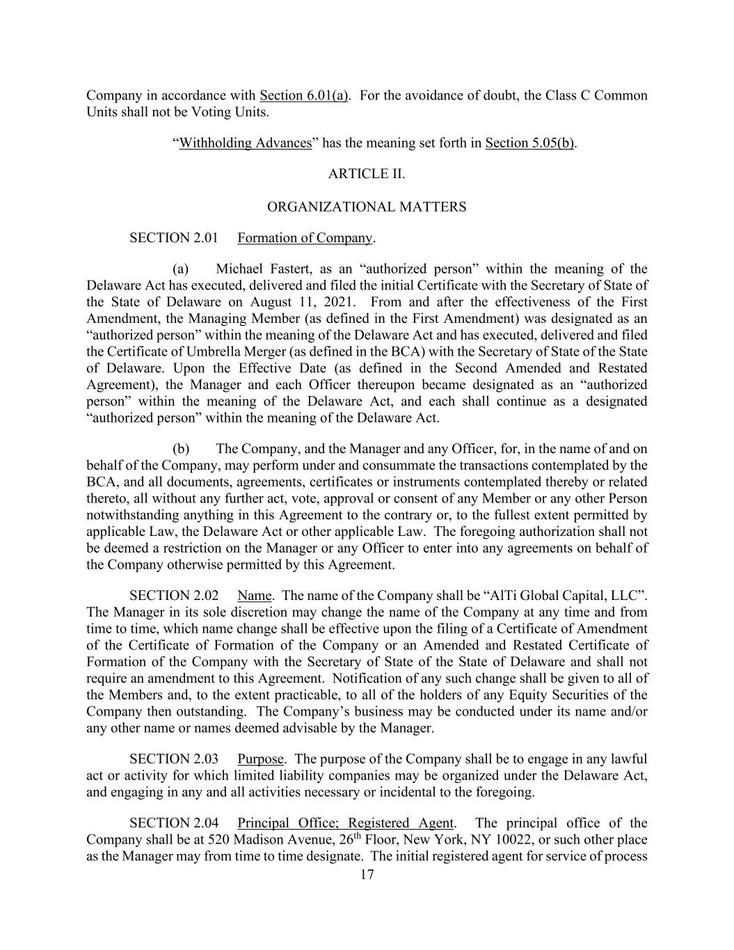 17 Company in accordance with Section 6.01(a). For the avoidance of doubt, the Class C Common Units shall not be Voting Units. “Withholding Advances” has the meaning set forth in Section 5.05(b). ARTICLE II. ORGANIZATIONAL MATTERS SECTION 2.01 Formation of Company. (a) Michael Fastert, as an “authorized person” within the meaning of the Delaware Act has executed, delivered and filed the initial Certificate with the Secretary of State of the State of Delaware on August 11, 2021. From and after the effectiveness of the First Amendment, the Managing Member (as defined in the First Amendment) was designated as an “authorized person” within the meaning of the Delaware Act and has executed, delivered and filed the Certificate of Umbrella Merger (as defined in the BCA) with the Secretary of State of the State of Delaware. Upon the Effective Date (as defined in the Second Amended and Restated Agreement), the Manager and each Officer thereupon became designated as an “authorized person” within the meaning of the Delaware Act, and each shall continue as a designated “authorized person” within the meaning of the Delaware Act. (b) The Company, and the Manager and any Officer, for, in the name of and on behalf of the Company, may perform under and consummate the transactions contemplated by the BCA, and all documents, agreements, certificates or instruments contemplated thereby or related thereto, all without any further act, vote, approval or consent of any Member or any other Person notwithstanding anything in this Agreement to the contrary or, to the fullest extent permitted by applicable Law, the Delaware Act or other applicable Law. The foregoing authorization shall not be deemed a restriction on the Manager or any Officer to enter into any agreements on behalf of the Company otherwise permitted by this Agreement. SECTION 2.02 Name. The name of the Company shall be “AlTi Global Capital, LLC”. The Manager in its sole discretion may change the name of the Company at any time and from time to time, which name change shall be effective upon the filing of a Certificate of Amendment of the Certificate of Formation of the Company or an Amended and Restated Certificate of Formation of the Company with the Secretary of State of the State of Delaware and shall not require an amendment to this Agreement. Notification of any such change shall be given to all of the Members and, to the extent practicable, to all of the holders of any Equity Securities of the Company then outstanding. The Company’s business may be conducted under its name and/or any other name or names deemed advisable by the Manager. SECTION 2.03 Purpose. The purpose of the Company shall be to engage in any lawful act or activity for which limited liability companies may be organized under the Delaware Act, and engaging in any and all activities necessary or incidental to the foregoing. SECTION 2.04 Principal Office; Registered Agent. The principal office of the Company shall be at 520 Madison Avenue, 26th Floor, New York, NY 10022, or such other place as the Manager may from time to time designate. The initial registered agent for service of process