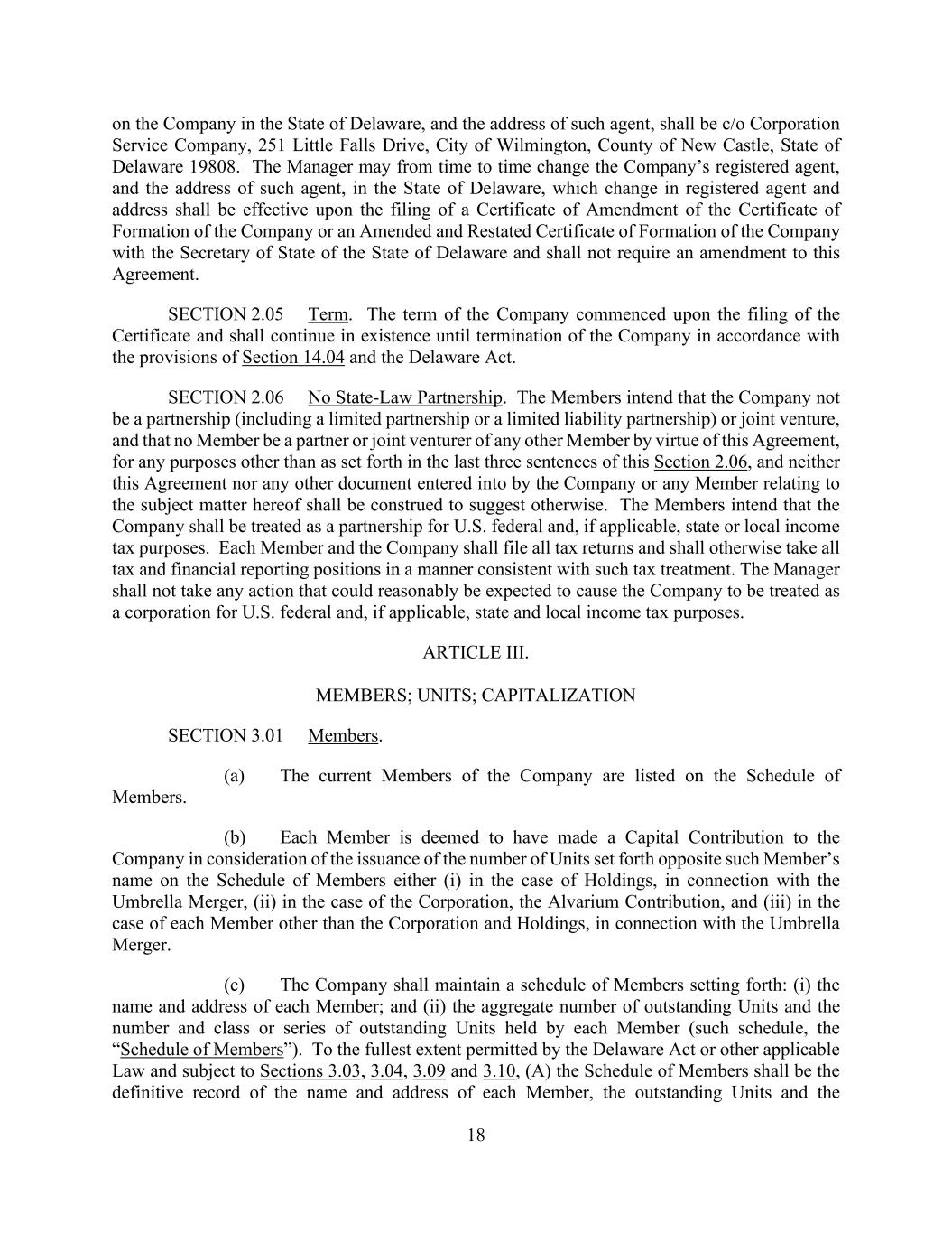 18 on the Company in the State of Delaware, and the address of such agent, shall be c/o Corporation Service Company, 251 Little Falls Drive, City of Wilmington, County of New Castle, State of Delaware 19808. The Manager may from time to time change the Company’s registered agent, and the address of such agent, in the State of Delaware, which change in registered agent and address shall be effective upon the filing of a Certificate of Amendment of the Certificate of Formation of the Company or an Amended and Restated Certificate of Formation of the Company with the Secretary of State of the State of Delaware and shall not require an amendment to this Agreement. SECTION 2.05 Term. The term of the Company commenced upon the filing of the Certificate and shall continue in existence until termination of the Company in accordance with the provisions of Section 14.04 and the Delaware Act. SECTION 2.06 No State-Law Partnership. The Members intend that the Company not be a partnership (including a limited partnership or a limited liability partnership) or joint venture, and that no Member be a partner or joint venturer of any other Member by virtue of this Agreement, for any purposes other than as set forth in the last three sentences of this Section 2.06, and neither this Agreement nor any other document entered into by the Company or any Member relating to the subject matter hereof shall be construed to suggest otherwise. The Members intend that the Company shall be treated as a partnership for U.S. federal and, if applicable, state or local income tax purposes. Each Member and the Company shall file all tax returns and shall otherwise take all tax and financial reporting positions in a manner consistent with such tax treatment. The Manager shall not take any action that could reasonably be expected to cause the Company to be treated as a corporation for U.S. federal and, if applicable, state and local income tax purposes. ARTICLE III. MEMBERS; UNITS; CAPITALIZATION SECTION 3.01 Members. (a) The current Members of the Company are listed on the Schedule of Members. (b) Each Member is deemed to have made a Capital Contribution to the Company in consideration of the issuance of the number of Units set forth opposite such Member’s name on the Schedule of Members either (i) in the case of Holdings, in connection with the Umbrella Merger, (ii) in the case of the Corporation, the Alvarium Contribution, and (iii) in the case of each Member other than the Corporation and Holdings, in connection with the Umbrella Merger. (c) The Company shall maintain a schedule of Members setting forth: (i) the name and address of each Member; and (ii) the aggregate number of outstanding Units and the number and class or series of outstanding Units held by each Member (such schedule, the “Schedule of Members”). To the fullest extent permitted by the Delaware Act or other applicable Law and subject to Sections 3.03, 3.04, 3.09 and 3.10, (A) the Schedule of Members shall be the definitive record of the name and address of each Member, the outstanding Units and the