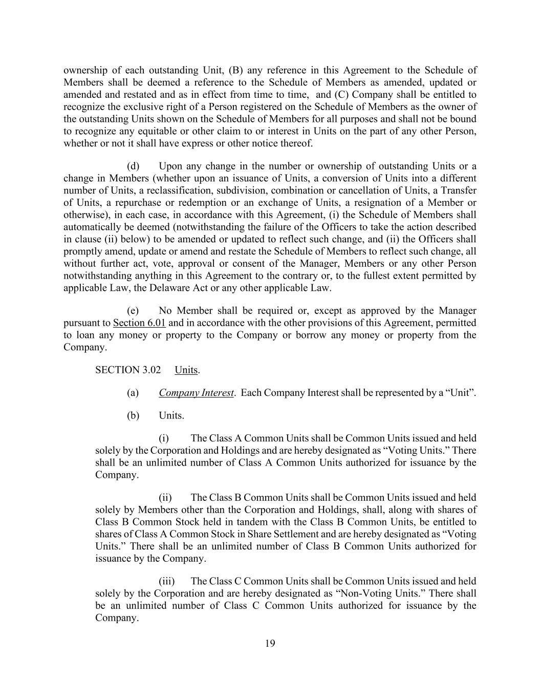 19 ownership of each outstanding Unit, (B) any reference in this Agreement to the Schedule of Members shall be deemed a reference to the Schedule of Members as amended, updated or amended and restated and as in effect from time to time, and (C) Company shall be entitled to recognize the exclusive right of a Person registered on the Schedule of Members as the owner of the outstanding Units shown on the Schedule of Members for all purposes and shall not be bound to recognize any equitable or other claim to or interest in Units on the part of any other Person, whether or not it shall have express or other notice thereof. (d) Upon any change in the number or ownership of outstanding Units or a change in Members (whether upon an issuance of Units, a conversion of Units into a different number of Units, a reclassification, subdivision, combination or cancellation of Units, a Transfer of Units, a repurchase or redemption or an exchange of Units, a resignation of a Member or otherwise), in each case, in accordance with this Agreement, (i) the Schedule of Members shall automatically be deemed (notwithstanding the failure of the Officers to take the action described in clause (ii) below) to be amended or updated to reflect such change, and (ii) the Officers shall promptly amend, update or amend and restate the Schedule of Members to reflect such change, all without further act, vote, approval or consent of the Manager, Members or any other Person notwithstanding anything in this Agreement to the contrary or, to the fullest extent permitted by applicable Law, the Delaware Act or any other applicable Law. (e) No Member shall be required or, except as approved by the Manager pursuant to Section 6.01 and in accordance with the other provisions of this Agreement, permitted to loan any money or property to the Company or borrow any money or property from the Company. SECTION 3.02 Units. (a) Company Interest. Each Company Interest shall be represented by a “Unit”. (b) Units. (i) The Class A Common Units shall be Common Units issued and held solely by the Corporation and Holdings and are hereby designated as “Voting Units.” There shall be an unlimited number of Class A Common Units authorized for issuance by the Company. (ii) The Class B Common Units shall be Common Units issued and held solely by Members other than the Corporation and Holdings, shall, along with shares of Class B Common Stock held in tandem with the Class B Common Units, be entitled to shares of Class A Common Stock in Share Settlement and are hereby designated as “Voting Units.” There shall be an unlimited number of Class B Common Units authorized for issuance by the Company. (iii) The Class C Common Units shall be Common Units issued and held solely by the Corporation and are hereby designated as “Non-Voting Units.” There shall be an unlimited number of Class C Common Units authorized for issuance by the Company.