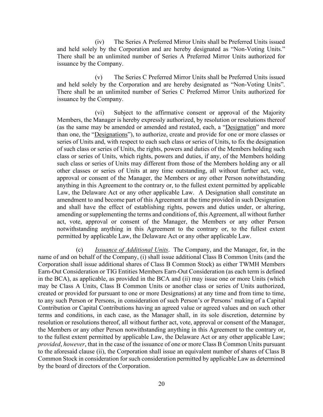 20 (iv) The Series A Preferred Mirror Units shall be Preferred Units issued and held solely by the Corporation and are hereby designated as “Non-Voting Units.” There shall be an unlimited number of Series A Preferred Mirror Units authorized for issuance by the Company. (v) The Series C Preferred Mirror Units shall be Preferred Units issued and held solely by the Corporation and are hereby designated as “Non-Voting Units”. There shall be an unlimited number of Series C Preferred Mirror Units authorized for issuance by the Company. (vi) Subject to the affirmative consent or approval of the Majority Members, the Manager is hereby expressly authorized, by resolution or resolutions thereof (as the same may be amended or amended and restated, each, a “Designation” and more than one, the “Designations”), to authorize, create and provide for one or more classes or series of Units and, with respect to each such class or series of Units, to fix the designation of such class or series of Units, the rights, powers and duties of the Members holding such class or series of Units, which rights, powers and duties, if any, of the Members holding such class or series of Units may different from those of the Members holding any or all other classes or series of Units at any time outstanding, all without further act, vote, approval or consent of the Manager, the Members or any other Person notwithstanding anything in this Agreement to the contrary or, to the fullest extent permitted by applicable Law, the Delaware Act or any other applicable Law. A Designation shall constitute an amendment to and become part of this Agreement at the time provided in such Designation and shall have the effect of establishing rights, powers and duties under, or altering, amending or supplementing the terms and conditions of, this Agreement, all without further act, vote, approval or consent of the Manager, the Members or any other Person notwithstanding anything in this Agreement to the contrary or, to the fullest extent permitted by applicable Law, the Delaware Act or any other applicable Law. (c) Issuance of Additional Units. The Company, and the Manager, for, in the name of and on behalf of the Company, (i) shall issue additional Class B Common Units (and the Corporation shall issue additional shares of Class B Common Stock) as either TWMH Members Earn-Out Consideration or TIG Entities Members Earn-Out Consideration (as each term is defined in the BCA), as applicable, as provided in the BCA and (ii) may issue one or more Units (which may be Class A Units, Class B Common Units or another class or series of Units authorized, created or provided for pursuant to one or more Designations) at any time and from time to time, to any such Person or Persons, in consideration of such Person’s or Persons’ making of a Capital Contribution or Capital Contributions having an agreed value or agreed values and on such other terms and conditions, in each case, as the Manager shall, in its sole discretion, determine by resolution or resolutions thereof, all without further act, vote, approval or consent of the Manager, the Members or any other Person notwithstanding anything in this Agreement to the contrary or, to the fullest extent permitted by applicable Law, the Delaware Act or any other applicable Law; provided, however, that in the case of the issuance of one or more Class B Common Units pursuant to the aforesaid clause (ii), the Corporation shall issue an equivalent number of shares of Class B Common Stock in consideration for such consideration permitted by applicable Law as determined by the board of directors of the Corporation.