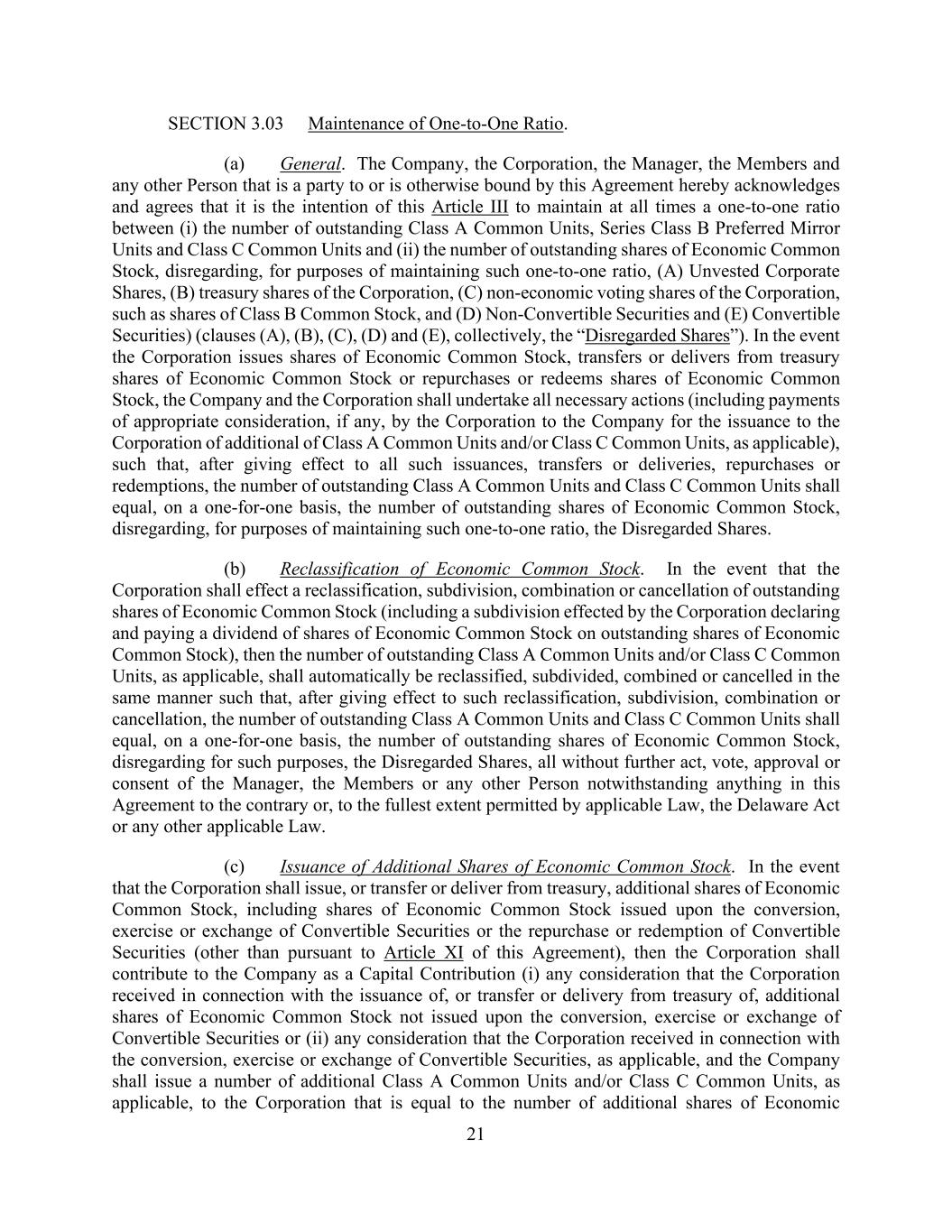 21 SECTION 3.03 Maintenance of One-to-One Ratio. (a) General. The Company, the Corporation, the Manager, the Members and any other Person that is a party to or is otherwise bound by this Agreement hereby acknowledges and agrees that it is the intention of this Article III to maintain at all times a one-to-one ratio between (i) the number of outstanding Class A Common Units, Series Class B Preferred Mirror Units and Class C Common Units and (ii) the number of outstanding shares of Economic Common Stock, disregarding, for purposes of maintaining such one-to-one ratio, (A) Unvested Corporate Shares, (B) treasury shares of the Corporation, (C) non-economic voting shares of the Corporation, such as shares of Class B Common Stock, and (D) Non-Convertible Securities and (E) Convertible Securities) (clauses (A), (B), (C), (D) and (E), collectively, the “Disregarded Shares”). In the event the Corporation issues shares of Economic Common Stock, transfers or delivers from treasury shares of Economic Common Stock or repurchases or redeems shares of Economic Common Stock, the Company and the Corporation shall undertake all necessary actions (including payments of appropriate consideration, if any, by the Corporation to the Company for the issuance to the Corporation of additional of Class A Common Units and/or Class C Common Units, as applicable), such that, after giving effect to all such issuances, transfers or deliveries, repurchases or redemptions, the number of outstanding Class A Common Units and Class C Common Units shall equal, on a one-for-one basis, the number of outstanding shares of Economic Common Stock, disregarding, for purposes of maintaining such one-to-one ratio, the Disregarded Shares. (b) Reclassification of Economic Common Stock. In the event that the Corporation shall effect a reclassification, subdivision, combination or cancellation of outstanding shares of Economic Common Stock (including a subdivision effected by the Corporation declaring and paying a dividend of shares of Economic Common Stock on outstanding shares of Economic Common Stock), then the number of outstanding Class A Common Units and/or Class C Common Units, as applicable, shall automatically be reclassified, subdivided, combined or cancelled in the same manner such that, after giving effect to such reclassification, subdivision, combination or cancellation, the number of outstanding Class A Common Units and Class C Common Units shall equal, on a one-for-one basis, the number of outstanding shares of Economic Common Stock, disregarding for such purposes, the Disregarded Shares, all without further act, vote, approval or consent of the Manager, the Members or any other Person notwithstanding anything in this Agreement to the contrary or, to the fullest extent permitted by applicable Law, the Delaware Act or any other applicable Law. (c) Issuance of Additional Shares of Economic Common Stock. In the event that the Corporation shall issue, or transfer or deliver from treasury, additional shares of Economic Common Stock, including shares of Economic Common Stock issued upon the conversion, exercise or exchange of Convertible Securities or the repurchase or redemption of Convertible Securities (other than pursuant to Article XI of this Agreement), then the Corporation shall contribute to the Company as a Capital Contribution (i) any consideration that the Corporation received in connection with the issuance of, or transfer or delivery from treasury of, additional shares of Economic Common Stock not issued upon the conversion, exercise or exchange of Convertible Securities or (ii) any consideration that the Corporation received in connection with the conversion, exercise or exchange of Convertible Securities, as applicable, and the Company shall issue a number of additional Class A Common Units and/or Class C Common Units, as applicable, to the Corporation that is equal to the number of additional shares of Economic