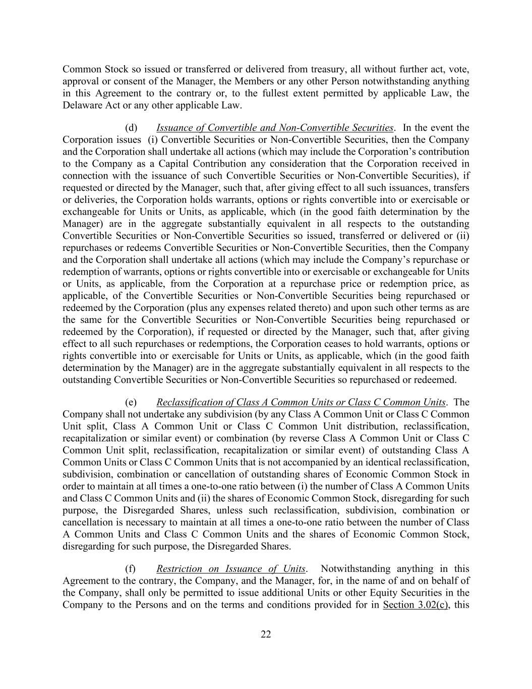 22 Common Stock so issued or transferred or delivered from treasury, all without further act, vote, approval or consent of the Manager, the Members or any other Person notwithstanding anything in this Agreement to the contrary or, to the fullest extent permitted by applicable Law, the Delaware Act or any other applicable Law. (d) Issuance of Convertible and Non-Convertible Securities. In the event the Corporation issues (i) Convertible Securities or Non-Convertible Securities, then the Company and the Corporation shall undertake all actions (which may include the Corporation’s contribution to the Company as a Capital Contribution any consideration that the Corporation received in connection with the issuance of such Convertible Securities or Non-Convertible Securities), if requested or directed by the Manager, such that, after giving effect to all such issuances, transfers or deliveries, the Corporation holds warrants, options or rights convertible into or exercisable or exchangeable for Units or Units, as applicable, which (in the good faith determination by the Manager) are in the aggregate substantially equivalent in all respects to the outstanding Convertible Securities or Non-Convertible Securities so issued, transferred or delivered or (ii) repurchases or redeems Convertible Securities or Non-Convertible Securities, then the Company and the Corporation shall undertake all actions (which may include the Company’s repurchase or redemption of warrants, options or rights convertible into or exercisable or exchangeable for Units or Units, as applicable, from the Corporation at a repurchase price or redemption price, as applicable, of the Convertible Securities or Non-Convertible Securities being repurchased or redeemed by the Corporation (plus any expenses related thereto) and upon such other terms as are the same for the Convertible Securities or Non-Convertible Securities being repurchased or redeemed by the Corporation), if requested or directed by the Manager, such that, after giving effect to all such repurchases or redemptions, the Corporation ceases to hold warrants, options or rights convertible into or exercisable for Units or Units, as applicable, which (in the good faith determination by the Manager) are in the aggregate substantially equivalent in all respects to the outstanding Convertible Securities or Non-Convertible Securities so repurchased or redeemed. (e) Reclassification of Class A Common Units or Class C Common Units. The Company shall not undertake any subdivision (by any Class A Common Unit or Class C Common Unit split, Class A Common Unit or Class C Common Unit distribution, reclassification, recapitalization or similar event) or combination (by reverse Class A Common Unit or Class C Common Unit split, reclassification, recapitalization or similar event) of outstanding Class A Common Units or Class C Common Units that is not accompanied by an identical reclassification, subdivision, combination or cancellation of outstanding shares of Economic Common Stock in order to maintain at all times a one-to-one ratio between (i) the number of Class A Common Units and Class C Common Units and (ii) the shares of Economic Common Stock, disregarding for such purpose, the Disregarded Shares, unless such reclassification, subdivision, combination or cancellation is necessary to maintain at all times a one-to-one ratio between the number of Class A Common Units and Class C Common Units and the shares of Economic Common Stock, disregarding for such purpose, the Disregarded Shares. (f) Restriction on Issuance of Units. Notwithstanding anything in this Agreement to the contrary, the Company, and the Manager, for, in the name of and on behalf of the Company, shall only be permitted to issue additional Units or other Equity Securities in the Company to the Persons and on the terms and conditions provided for in Section 3.02(c), this