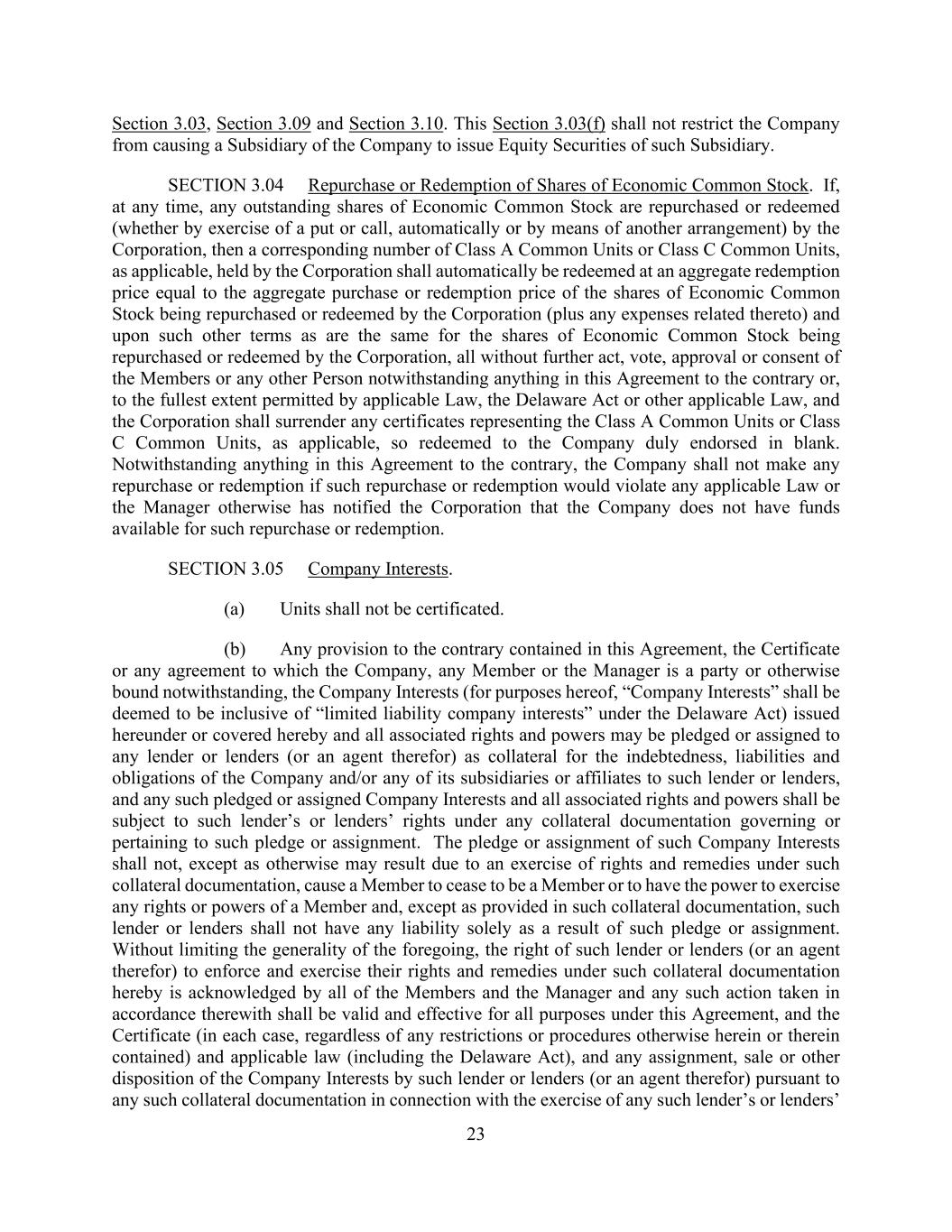23 Section 3.03, Section 3.09 and Section 3.10. This Section 3.03(f) shall not restrict the Company from causing a Subsidiary of the Company to issue Equity Securities of such Subsidiary. SECTION 3.04 Repurchase or Redemption of Shares of Economic Common Stock. If, at any time, any outstanding shares of Economic Common Stock are repurchased or redeemed (whether by exercise of a put or call, automatically or by means of another arrangement) by the Corporation, then a corresponding number of Class A Common Units or Class C Common Units, as applicable, held by the Corporation shall automatically be redeemed at an aggregate redemption price equal to the aggregate purchase or redemption price of the shares of Economic Common Stock being repurchased or redeemed by the Corporation (plus any expenses related thereto) and upon such other terms as are the same for the shares of Economic Common Stock being repurchased or redeemed by the Corporation, all without further act, vote, approval or consent of the Members or any other Person notwithstanding anything in this Agreement to the contrary or, to the fullest extent permitted by applicable Law, the Delaware Act or other applicable Law, and the Corporation shall surrender any certificates representing the Class A Common Units or Class C Common Units, as applicable, so redeemed to the Company duly endorsed in blank. Notwithstanding anything in this Agreement to the contrary, the Company shall not make any repurchase or redemption if such repurchase or redemption would violate any applicable Law or the Manager otherwise has notified the Corporation that the Company does not have funds available for such repurchase or redemption. SECTION 3.05 Company Interests. (a) Units shall not be certificated. (b) Any provision to the contrary contained in this Agreement, the Certificate or any agreement to which the Company, any Member or the Manager is a party or otherwise bound notwithstanding, the Company Interests (for purposes hereof, “Company Interests” shall be deemed to be inclusive of “limited liability company interests” under the Delaware Act) issued hereunder or covered hereby and all associated rights and powers may be pledged or assigned to any lender or lenders (or an agent therefor) as collateral for the indebtedness, liabilities and obligations of the Company and/or any of its subsidiaries or affiliates to such lender or lenders, and any such pledged or assigned Company Interests and all associated rights and powers shall be subject to such lender’s or lenders’ rights under any collateral documentation governing or pertaining to such pledge or assignment. The pledge or assignment of such Company Interests shall not, except as otherwise may result due to an exercise of rights and remedies under such collateral documentation, cause a Member to cease to be a Member or to have the power to exercise any rights or powers of a Member and, except as provided in such collateral documentation, such lender or lenders shall not have any liability solely as a result of such pledge or assignment. Without limiting the generality of the foregoing, the right of such lender or lenders (or an agent therefor) to enforce and exercise their rights and remedies under such collateral documentation hereby is acknowledged by all of the Members and the Manager and any such action taken in accordance therewith shall be valid and effective for all purposes under this Agreement, and the Certificate (in each case, regardless of any restrictions or procedures otherwise herein or therein contained) and applicable law (including the Delaware Act), and any assignment, sale or other disposition of the Company Interests by such lender or lenders (or an agent therefor) pursuant to any such collateral documentation in connection with the exercise of any such lender’s or lenders’