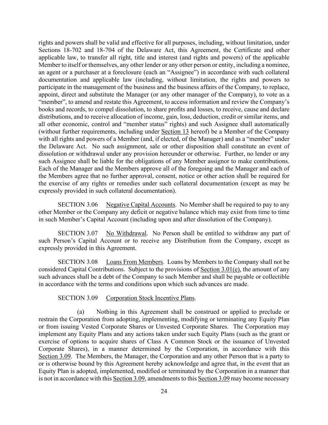 24 rights and powers shall be valid and effective for all purposes, including, without limitation, under Sections 18-702 and 18-704 of the Delaware Act, this Agreement, the Certificate and other applicable law, to transfer all right, title and interest (and rights and powers) of the applicable Member to itself or themselves, any other lender or any other person or entity, including a nominee, an agent or a purchaser at a foreclosure (each an “Assignee”) in accordance with such collateral documentation and applicable law (including, without limitation, the rights and powers to participate in the management of the business and the business affairs of the Company, to replace, appoint, direct and substitute the Manager (or any other manager of the Company), to vote as a “member”, to amend and restate this Agreement, to access information and review the Company’s books and records, to compel dissolution, to share profits and losses, to receive, cause and declare distributions, and to receive allocation of income, gain, loss, deduction, credit or similar items, and all other economic, control and “member status” rights) and such Assignee shall automatically (without further requirements, including under Section 13 hereof) be a Member of the Company with all rights and powers of a Member (and, if elected, of the Manager) and as a “member” under the Delaware Act. No such assignment, sale or other disposition shall constitute an event of dissolution or withdrawal under any provision hereunder or otherwise. Further, no lender or any such Assignee shall be liable for the obligations of any Member assignor to make contributions. Each of the Manager and the Members approve all of the foregoing and the Manager and each of the Members agree that no further approval, consent, notice or other action shall be required for the exercise of any rights or remedies under such collateral documentation (except as may be expressly provided in such collateral documentation). SECTION 3.06 Negative Capital Accounts. No Member shall be required to pay to any other Member or the Company any deficit or negative balance which may exist from time to time in such Member’s Capital Account (including upon and after dissolution of the Company). SECTION 3.07 No Withdrawal. No Person shall be entitled to withdraw any part of such Person’s Capital Account or to receive any Distribution from the Company, except as expressly provided in this Agreement. SECTION 3.08 Loans From Members. Loans by Members to the Company shall not be considered Capital Contributions. Subject to the provisions of Section 3.01(e), the amount of any such advances shall be a debt of the Company to such Member and shall be payable or collectible in accordance with the terms and conditions upon which such advances are made. SECTION 3.09 Corporation Stock Incentive Plans. (a) Nothing in this Agreement shall be construed or applied to preclude or restrain the Corporation from adopting, implementing, modifying or terminating any Equity Plan or from issuing Vested Corporate Shares or Unvested Corporate Shares. The Corporation may implement any Equity Plans and any actions taken under such Equity Plans (such as the grant or exercise of options to acquire shares of Class A Common Stock or the issuance of Unvested Corporate Shares), in a manner determined by the Corporation, in accordance with this Section 3.09. The Members, the Manager, the Corporation and any other Person that is a party to or is otherwise bound by this Agreement hereby acknowledge and agree that, in the event that an Equity Plan is adopted, implemented, modified or terminated by the Corporation in a manner that is not in accordance with this Section 3.09, amendments to this Section 3.09 may become necessary