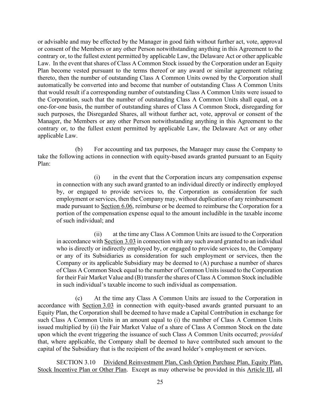 25 or advisable and may be effected by the Manager in good faith without further act, vote, approval or consent of the Members or any other Person notwithstanding anything in this Agreement to the contrary or, to the fullest extent permitted by applicable Law, the Delaware Act or other applicable Law. In the event that shares of Class A Common Stock issued by the Corporation under an Equity Plan become vested pursuant to the terms thereof or any award or similar agreement relating thereto, then the number of outstanding Class A Common Units owned by the Corporation shall automatically be converted into and become that number of outstanding Class A Common Units that would result if a corresponding number of outstanding Class A Common Units were issued to the Corporation, such that the number of outstanding Class A Common Units shall equal, on a one-for-one basis, the number of outstanding shares of Class A Common Stock, disregarding for such purposes, the Disregarded Shares, all without further act, vote, approval or consent of the Manager, the Members or any other Person notwithstanding anything in this Agreement to the contrary or, to the fullest extent permitted by applicable Law, the Delaware Act or any other applicable Law. (b) For accounting and tax purposes, the Manager may cause the Company to take the following actions in connection with equity-based awards granted pursuant to an Equity Plan: (i) in the event that the Corporation incurs any compensation expense in connection with any such award granted to an individual directly or indirectly employed by, or engaged to provide services to, the Corporation as consideration for such employment or services, then the Company may, without duplication of any reimbursement made pursuant to Section 6.06, reimburse or be deemed to reimburse the Corporation for a portion of the compensation expense equal to the amount includible in the taxable income of such individual; and (ii) at the time any Class A Common Units are issued to the Corporation in accordance with Section 3.03 in connection with any such award granted to an individual who is directly or indirectly employed by, or engaged to provide services to, the Company or any of its Subsidiaries as consideration for such employment or services, then the Company or its applicable Subsidiary may be deemed to (A) purchase a number of shares of Class A Common Stock equal to the number of Common Units issued to the Corporation for their Fair Market Value and (B) transfer the shares of Class A Common Stock includible in such individual’s taxable income to such individual as compensation. (c) At the time any Class A Common Units are issued to the Corporation in accordance with Section 3.03 in connection with equity-based awards granted pursuant to an Equity Plan, the Corporation shall be deemed to have made a Capital Contribution in exchange for such Class A Common Units in an amount equal to (i) the number of Class A Common Units issued multiplied by (ii) the Fair Market Value of a share of Class A Common Stock on the date upon which the event triggering the issuance of such Class A Common Units occurred; provided that, where applicable, the Company shall be deemed to have contributed such amount to the capital of the Subsidiary that is the recipient of the award holder’s employment or services. SECTION 3.10 Dividend Reinvestment Plan, Cash Option Purchase Plan, Equity Plan, Stock Incentive Plan or Other Plan. Except as may otherwise be provided in this Article III, all