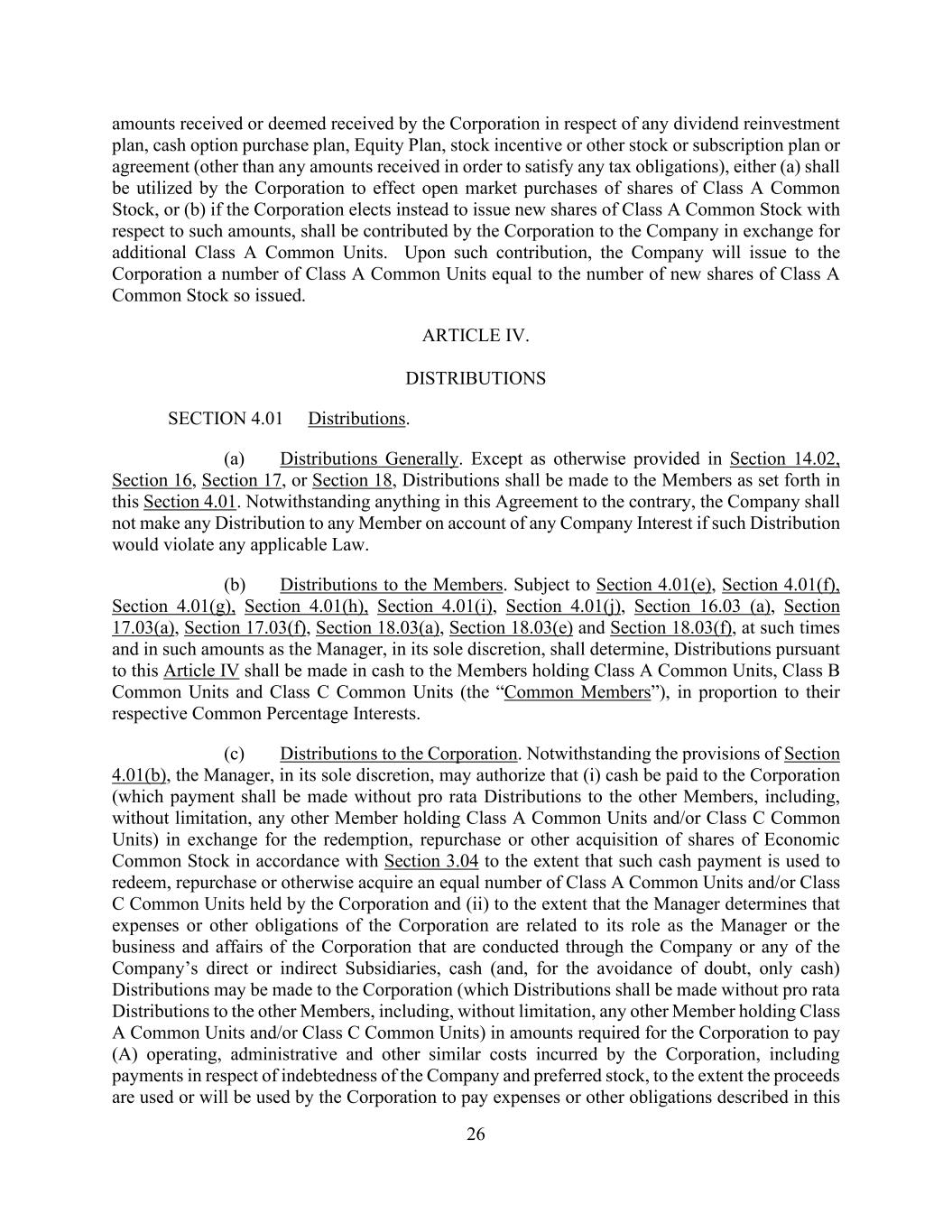 26 amounts received or deemed received by the Corporation in respect of any dividend reinvestment plan, cash option purchase plan, Equity Plan, stock incentive or other stock or subscription plan or agreement (other than any amounts received in order to satisfy any tax obligations), either (a) shall be utilized by the Corporation to effect open market purchases of shares of Class A Common Stock, or (b) if the Corporation elects instead to issue new shares of Class A Common Stock with respect to such amounts, shall be contributed by the Corporation to the Company in exchange for additional Class A Common Units. Upon such contribution, the Company will issue to the Corporation a number of Class A Common Units equal to the number of new shares of Class A Common Stock so issued. ARTICLE IV. DISTRIBUTIONS SECTION 4.01 Distributions. (a) Distributions Generally. Except as otherwise provided in Section 14.02, Section 16, Section 17, or Section 18, Distributions shall be made to the Members as set forth in this Section 4.01. Notwithstanding anything in this Agreement to the contrary, the Company shall not make any Distribution to any Member on account of any Company Interest if such Distribution would violate any applicable Law. (b) Distributions to the Members. Subject to Section 4.01(e), Section 4.01(f), Section 4.01(g), Section 4.01(h), Section 4.01(i), Section 4.01(j), Section 16.03 (a), Section 17.03(a), Section 17.03(f), Section 18.03(a), Section 18.03(e) and Section 18.03(f), at such times and in such amounts as the Manager, in its sole discretion, shall determine, Distributions pursuant to this Article IV shall be made in cash to the Members holding Class A Common Units, Class B Common Units and Class C Common Units (the “Common Members”), in proportion to their respective Common Percentage Interests. (c) Distributions to the Corporation. Notwithstanding the provisions of Section 4.01(b), the Manager, in its sole discretion, may authorize that (i) cash be paid to the Corporation (which payment shall be made without pro rata Distributions to the other Members, including, without limitation, any other Member holding Class A Common Units and/or Class C Common Units) in exchange for the redemption, repurchase or other acquisition of shares of Economic Common Stock in accordance with Section 3.04 to the extent that such cash payment is used to redeem, repurchase or otherwise acquire an equal number of Class A Common Units and/or Class C Common Units held by the Corporation and (ii) to the extent that the Manager determines that expenses or other obligations of the Corporation are related to its role as the Manager or the business and affairs of the Corporation that are conducted through the Company or any of the Company’s direct or indirect Subsidiaries, cash (and, for the avoidance of doubt, only cash) Distributions may be made to the Corporation (which Distributions shall be made without pro rata Distributions to the other Members, including, without limitation, any other Member holding Class A Common Units and/or Class C Common Units) in amounts required for the Corporation to pay (A) operating, administrative and other similar costs incurred by the Corporation, including payments in respect of indebtedness of the Company and preferred stock, to the extent the proceeds are used or will be used by the Corporation to pay expenses or other obligations described in this