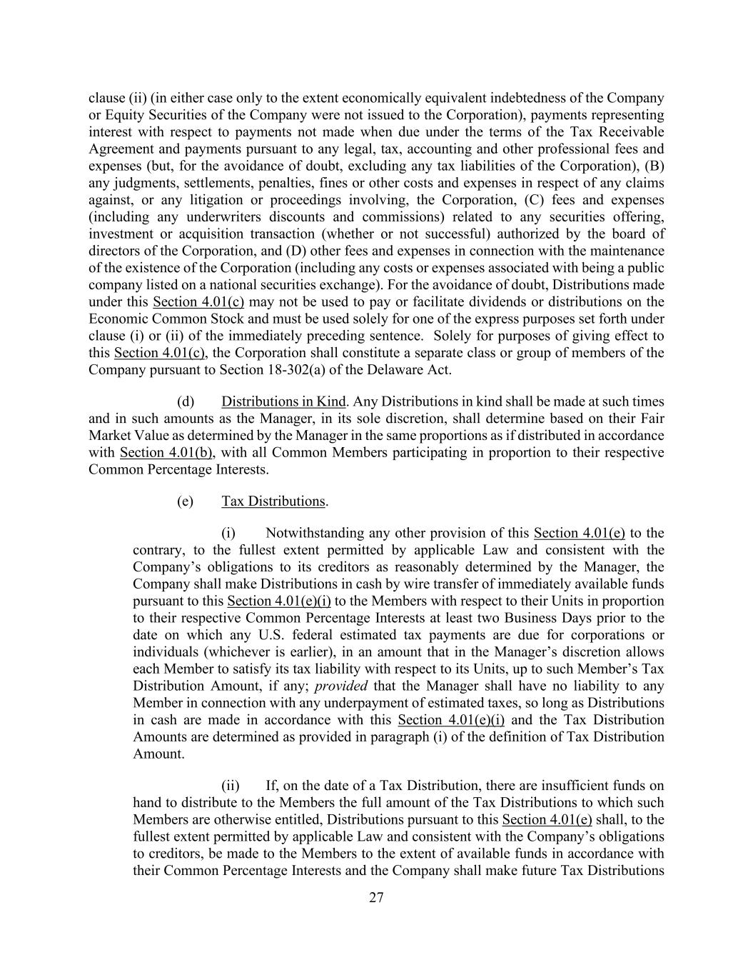 27 clause (ii) (in either case only to the extent economically equivalent indebtedness of the Company or Equity Securities of the Company were not issued to the Corporation), payments representing interest with respect to payments not made when due under the terms of the Tax Receivable Agreement and payments pursuant to any legal, tax, accounting and other professional fees and expenses (but, for the avoidance of doubt, excluding any tax liabilities of the Corporation), (B) any judgments, settlements, penalties, fines or other costs and expenses in respect of any claims against, or any litigation or proceedings involving, the Corporation, (C) fees and expenses (including any underwriters discounts and commissions) related to any securities offering, investment or acquisition transaction (whether or not successful) authorized by the board of directors of the Corporation, and (D) other fees and expenses in connection with the maintenance of the existence of the Corporation (including any costs or expenses associated with being a public company listed on a national securities exchange). For the avoidance of doubt, Distributions made under this Section 4.01(c) may not be used to pay or facilitate dividends or distributions on the Economic Common Stock and must be used solely for one of the express purposes set forth under clause (i) or (ii) of the immediately preceding sentence. Solely for purposes of giving effect to this Section 4.01(c), the Corporation shall constitute a separate class or group of members of the Company pursuant to Section 18-302(a) of the Delaware Act. (d) Distributions in Kind. Any Distributions in kind shall be made at such times and in such amounts as the Manager, in its sole discretion, shall determine based on their Fair Market Value as determined by the Manager in the same proportions as if distributed in accordance with Section 4.01(b), with all Common Members participating in proportion to their respective Common Percentage Interests. (e) Tax Distributions. (i) Notwithstanding any other provision of this Section 4.01(e) to the contrary, to the fullest extent permitted by applicable Law and consistent with the Company’s obligations to its creditors as reasonably determined by the Manager, the Company shall make Distributions in cash by wire transfer of immediately available funds pursuant to this Section 4.01(e)(i) to the Members with respect to their Units in proportion to their respective Common Percentage Interests at least two Business Days prior to the date on which any U.S. federal estimated tax payments are due for corporations or individuals (whichever is earlier), in an amount that in the Manager’s discretion allows each Member to satisfy its tax liability with respect to its Units, up to such Member’s Tax Distribution Amount, if any; provided that the Manager shall have no liability to any Member in connection with any underpayment of estimated taxes, so long as Distributions in cash are made in accordance with this Section 4.01(e)(i) and the Tax Distribution Amounts are determined as provided in paragraph (i) of the definition of Tax Distribution Amount. (ii) If, on the date of a Tax Distribution, there are insufficient funds on hand to distribute to the Members the full amount of the Tax Distributions to which such Members are otherwise entitled, Distributions pursuant to this Section 4.01(e) shall, to the fullest extent permitted by applicable Law and consistent with the Company’s obligations to creditors, be made to the Members to the extent of available funds in accordance with their Common Percentage Interests and the Company shall make future Tax Distributions