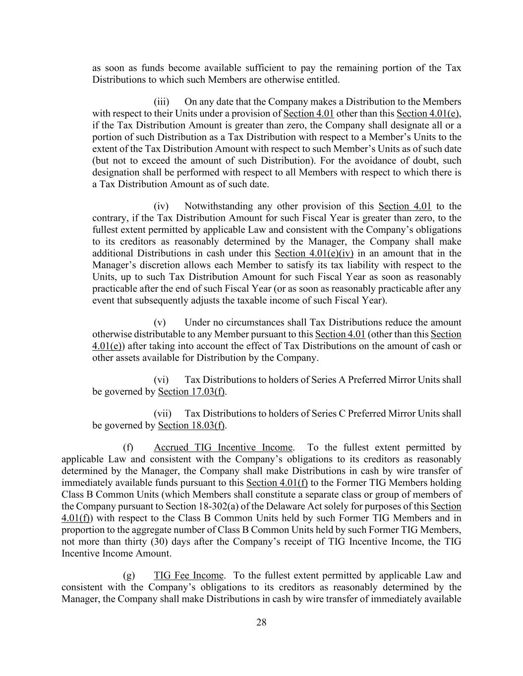 28 as soon as funds become available sufficient to pay the remaining portion of the Tax Distributions to which such Members are otherwise entitled. (iii) On any date that the Company makes a Distribution to the Members with respect to their Units under a provision of Section 4.01 other than this Section 4.01(e), if the Tax Distribution Amount is greater than zero, the Company shall designate all or a portion of such Distribution as a Tax Distribution with respect to a Member’s Units to the extent of the Tax Distribution Amount with respect to such Member’s Units as of such date (but not to exceed the amount of such Distribution). For the avoidance of doubt, such designation shall be performed with respect to all Members with respect to which there is a Tax Distribution Amount as of such date. (iv) Notwithstanding any other provision of this Section 4.01 to the contrary, if the Tax Distribution Amount for such Fiscal Year is greater than zero, to the fullest extent permitted by applicable Law and consistent with the Company’s obligations to its creditors as reasonably determined by the Manager, the Company shall make additional Distributions in cash under this Section 4.01(e)(iv) in an amount that in the Manager’s discretion allows each Member to satisfy its tax liability with respect to the Units, up to such Tax Distribution Amount for such Fiscal Year as soon as reasonably practicable after the end of such Fiscal Year (or as soon as reasonably practicable after any event that subsequently adjusts the taxable income of such Fiscal Year). (v) Under no circumstances shall Tax Distributions reduce the amount otherwise distributable to any Member pursuant to this Section 4.01 (other than this Section 4.01(e)) after taking into account the effect of Tax Distributions on the amount of cash or other assets available for Distribution by the Company. (vi) Tax Distributions to holders of Series A Preferred Mirror Units shall be governed by Section 17.03(f). (vii) Tax Distributions to holders of Series C Preferred Mirror Units shall be governed by Section 18.03(f). (f) Accrued TIG Incentive Income. To the fullest extent permitted by applicable Law and consistent with the Company’s obligations to its creditors as reasonably determined by the Manager, the Company shall make Distributions in cash by wire transfer of immediately available funds pursuant to this Section 4.01(f) to the Former TIG Members holding Class B Common Units (which Members shall constitute a separate class or group of members of the Company pursuant to Section 18-302(a) of the Delaware Act solely for purposes of this Section 4.01(f)) with respect to the Class B Common Units held by such Former TIG Members and in proportion to the aggregate number of Class B Common Units held by such Former TIG Members, not more than thirty (30) days after the Company’s receipt of TIG Incentive Income, the TIG Incentive Income Amount. (g) TIG Fee Income. To the fullest extent permitted by applicable Law and consistent with the Company’s obligations to its creditors as reasonably determined by the Manager, the Company shall make Distributions in cash by wire transfer of immediately available