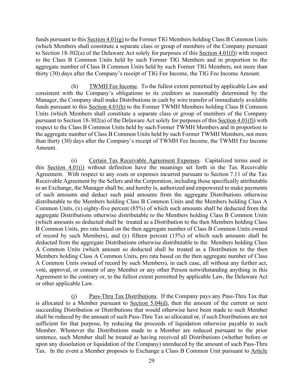 29 funds pursuant to this Section 4.01(g) to the Former TIG Members holding Class B Common Units (which Members shall constitute a separate class or group of members of the Company pursuant to Section 18-302(a) of the Delaware Act solely for purposes of this Section 4.01(f)) with respect to the Class B Common Units held by such Former TIG Members and in proportion to the aggregate number of Class B Common Units held by such Former TIG Members, not more than thirty (30) days after the Company’s receipt of TIG Fee Income, the TIG Fee Income Amount. (h) TWMH Fee Income. To the fullest extent permitted by applicable Law and consistent with the Company’s obligations to its creditors as reasonably determined by the Manager, the Company shall make Distributions in cash by wire transfer of immediately available funds pursuant to this Section 4.01(h) to the Former TWMH Members holding Class B Common Units (which Members shall constitute a separate class or group of members of the Company pursuant to Section 18-302(a) of the Delaware Act solely for purposes of this Section 4.01(f)) with respect to the Class B Common Units held by such Former TWMH Members and in proportion to the aggregate number of Class B Common Units held by such Former TWMH Members, not more than thirty (30) days after the Company’s receipt of TWMH Fee Income, the TWMH Fee Income Amount. (i) Certain Tax Receivable Agreement Expenses. Capitalized terms used in this Section 4.01(i) without definition have the meanings set forth in the Tax Receivable Agreement. With respect to any costs or expenses incurred pursuant to Section 7.11 of the Tax Receivable Agreement by the Sellers and the Corporation, including those specifically attributable to an Exchange, the Manager shall be, and hereby is, authorized and empowered to make payments of such amounts and deduct such paid amounts from the aggregate Distributions otherwise distributable to the Members holding Class B Common Units and the Members holding Class A Common Units, (x) eighty-five percent (85%) of which such amounts shall be deducted from the aggregate Distributions otherwise distributable to the Members holding Class B Common Units (which amounts so deducted shall be treated as a Distribution to the then Members holding Class B Common Units, pro rata based on the then aggregate number of Class B Common Units owned of record by such Members), and (y) fifteen percent (15%) of which such amounts shall be deducted from the aggregate Distributions otherwise distributable to the Members holding Class A Common Units (which amount so deducted shall be treated as a Distribution to the then Members holding Class A Common Units, pro rata based on the then aggregate number of Class A Common Units owned of record by such Members), in each case, all without any further act, vote, approval, or consent of any Member or any other Person notwithstanding anything in this Agreement to the contrary or, to the fullest extent permitted by applicable Law, the Delaware Act or other applicable Law. (j) Pass-Thru Tax Distributions. If the Company pays any Pass-Thru Tax that is allocated to a Member pursuant to Section 5.04(d), then the amount of the current or next succeeding Distribution or Distributions that would otherwise have been made to such Member shall be reduced by the amount of such Pass-Thru Tax so allocated or, if such Distributions are not sufficient for that purpose, by reducing the proceeds of liquidation otherwise payable to such Member. Whenever the Distributions made to a Member are reduced pursuant to the prior sentence, such Member shall be treated as having received all Distributions (whether before or upon any dissolution or liquidation of the Company) unreduced by the amount of such Pass-Thru Tax. In the event a Member proposes to Exchange a Class B Common Unit pursuant to Article