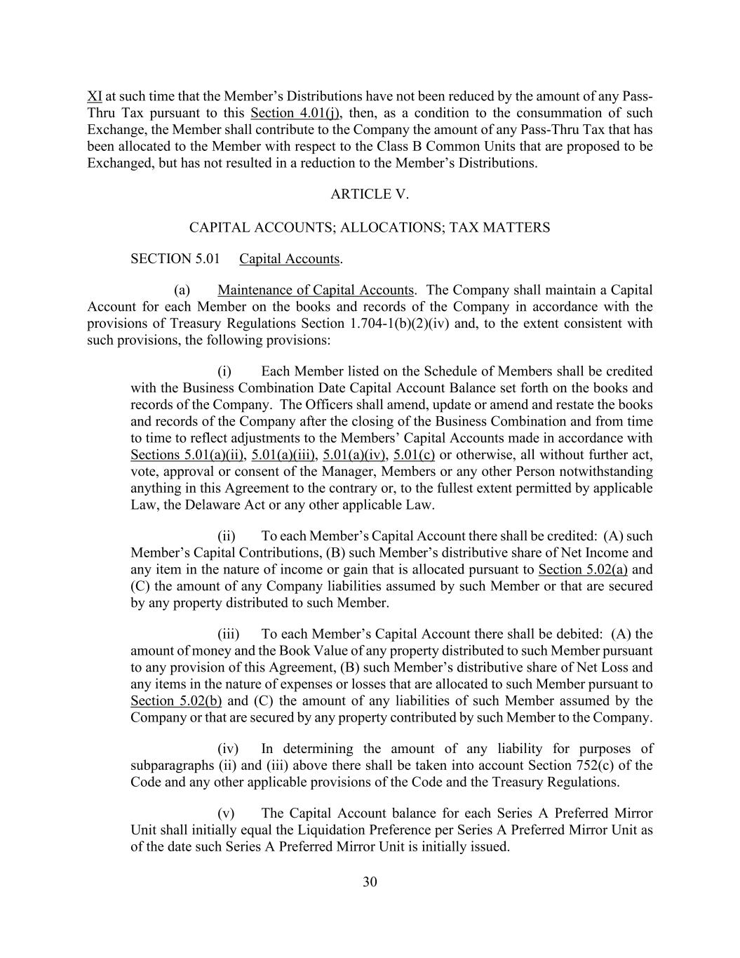 30 XI at such time that the Member’s Distributions have not been reduced by the amount of any Pass- Thru Tax pursuant to this Section 4.01(j), then, as a condition to the consummation of such Exchange, the Member shall contribute to the Company the amount of any Pass-Thru Tax that has been allocated to the Member with respect to the Class B Common Units that are proposed to be Exchanged, but has not resulted in a reduction to the Member’s Distributions. ARTICLE V. CAPITAL ACCOUNTS; ALLOCATIONS; TAX MATTERS SECTION 5.01 Capital Accounts. (a) Maintenance of Capital Accounts. The Company shall maintain a Capital Account for each Member on the books and records of the Company in accordance with the provisions of Treasury Regulations Section 1.704-1(b)(2)(iv) and, to the extent consistent with such provisions, the following provisions: (i) Each Member listed on the Schedule of Members shall be credited with the Business Combination Date Capital Account Balance set forth on the books and records of the Company. The Officers shall amend, update or amend and restate the books and records of the Company after the closing of the Business Combination and from time to time to reflect adjustments to the Members’ Capital Accounts made in accordance with Sections 5.01(a)(ii), 5.01(a)(iii), 5.01(a)(iv), 5.01(c) or otherwise, all without further act, vote, approval or consent of the Manager, Members or any other Person notwithstanding anything in this Agreement to the contrary or, to the fullest extent permitted by applicable Law, the Delaware Act or any other applicable Law. (ii) To each Member’s Capital Account there shall be credited: (A) such Member’s Capital Contributions, (B) such Member’s distributive share of Net Income and any item in the nature of income or gain that is allocated pursuant to Section 5.02(a) and (C) the amount of any Company liabilities assumed by such Member or that are secured by any property distributed to such Member. (iii) To each Member’s Capital Account there shall be debited: (A) the amount of money and the Book Value of any property distributed to such Member pursuant to any provision of this Agreement, (B) such Member’s distributive share of Net Loss and any items in the nature of expenses or losses that are allocated to such Member pursuant to Section 5.02(b) and (C) the amount of any liabilities of such Member assumed by the Company or that are secured by any property contributed by such Member to the Company. (iv) In determining the amount of any liability for purposes of subparagraphs (ii) and (iii) above there shall be taken into account Section 752(c) of the Code and any other applicable provisions of the Code and the Treasury Regulations. (v) The Capital Account balance for each Series A Preferred Mirror Unit shall initially equal the Liquidation Preference per Series A Preferred Mirror Unit as of the date such Series A Preferred Mirror Unit is initially issued.