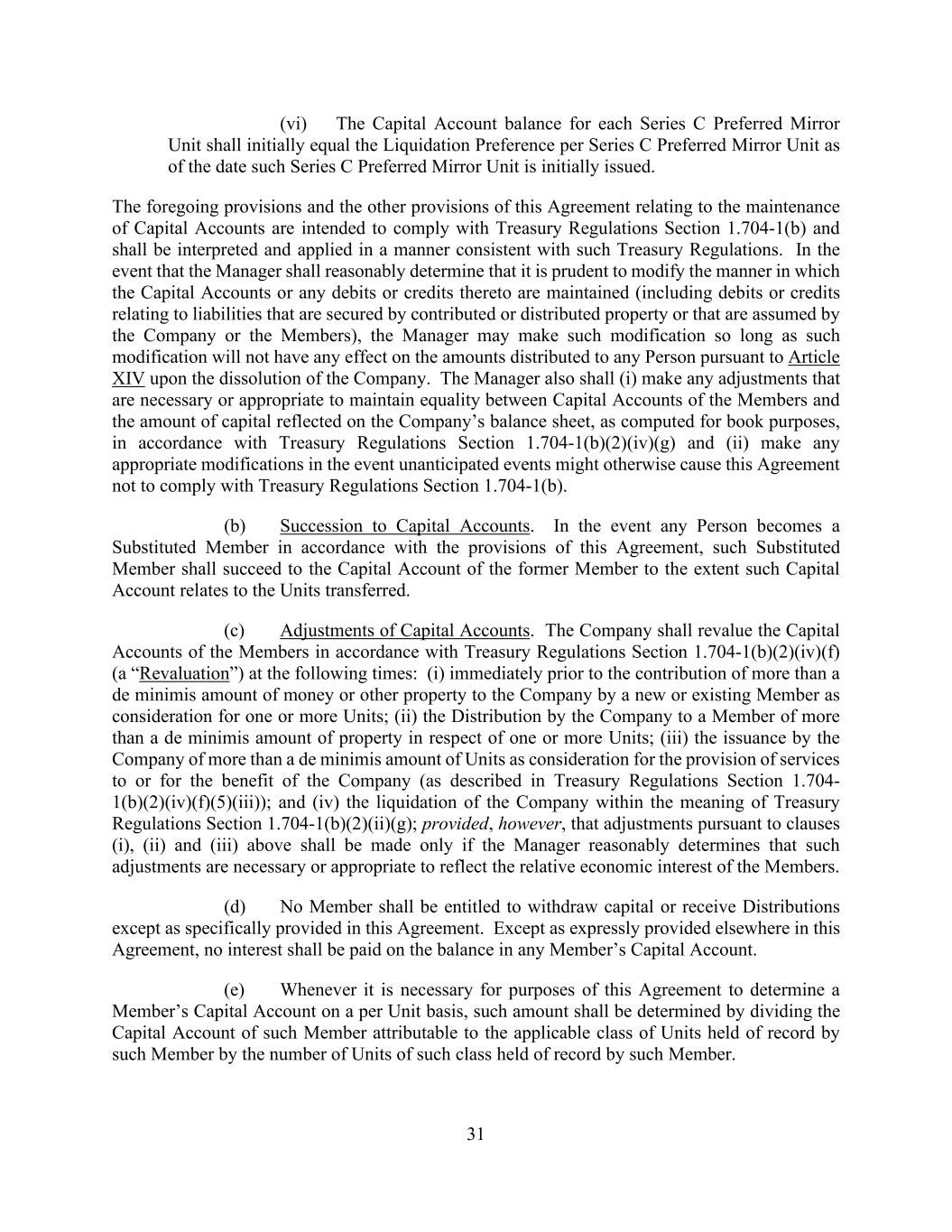 31 (vi) The Capital Account balance for each Series C Preferred Mirror Unit shall initially equal the Liquidation Preference per Series C Preferred Mirror Unit as of the date such Series C Preferred Mirror Unit is initially issued. The foregoing provisions and the other provisions of this Agreement relating to the maintenance of Capital Accounts are intended to comply with Treasury Regulations Section 1.704-1(b) and shall be interpreted and applied in a manner consistent with such Treasury Regulations. In the event that the Manager shall reasonably determine that it is prudent to modify the manner in which the Capital Accounts or any debits or credits thereto are maintained (including debits or credits relating to liabilities that are secured by contributed or distributed property or that are assumed by the Company or the Members), the Manager may make such modification so long as such modification will not have any effect on the amounts distributed to any Person pursuant to Article XIV upon the dissolution of the Company. The Manager also shall (i) make any adjustments that are necessary or appropriate to maintain equality between Capital Accounts of the Members and the amount of capital reflected on the Company’s balance sheet, as computed for book purposes, in accordance with Treasury Regulations Section 1.704-1(b)(2)(iv)(g) and (ii) make any appropriate modifications in the event unanticipated events might otherwise cause this Agreement not to comply with Treasury Regulations Section 1.704-1(b). (b) Succession to Capital Accounts. In the event any Person becomes a Substituted Member in accordance with the provisions of this Agreement, such Substituted Member shall succeed to the Capital Account of the former Member to the extent such Capital Account relates to the Units transferred. (c) Adjustments of Capital Accounts. The Company shall revalue the Capital Accounts of the Members in accordance with Treasury Regulations Section 1.704-1(b)(2)(iv)(f) (a “Revaluation”) at the following times: (i) immediately prior to the contribution of more than a de minimis amount of money or other property to the Company by a new or existing Member as consideration for one or more Units; (ii) the Distribution by the Company to a Member of more than a de minimis amount of property in respect of one or more Units; (iii) the issuance by the Company of more than a de minimis amount of Units as consideration for the provision of services to or for the benefit of the Company (as described in Treasury Regulations Section 1.704- 1(b)(2)(iv)(f)(5)(iii)); and (iv) the liquidation of the Company within the meaning of Treasury Regulations Section 1.704-1(b)(2)(ii)(g); provided, however, that adjustments pursuant to clauses (i), (ii) and (iii) above shall be made only if the Manager reasonably determines that such adjustments are necessary or appropriate to reflect the relative economic interest of the Members. (d) No Member shall be entitled to withdraw capital or receive Distributions except as specifically provided in this Agreement. Except as expressly provided elsewhere in this Agreement, no interest shall be paid on the balance in any Member’s Capital Account. (e) Whenever it is necessary for purposes of this Agreement to determine a Member’s Capital Account on a per Unit basis, such amount shall be determined by dividing the Capital Account of such Member attributable to the applicable class of Units held of record by such Member by the number of Units of such class held of record by such Member.