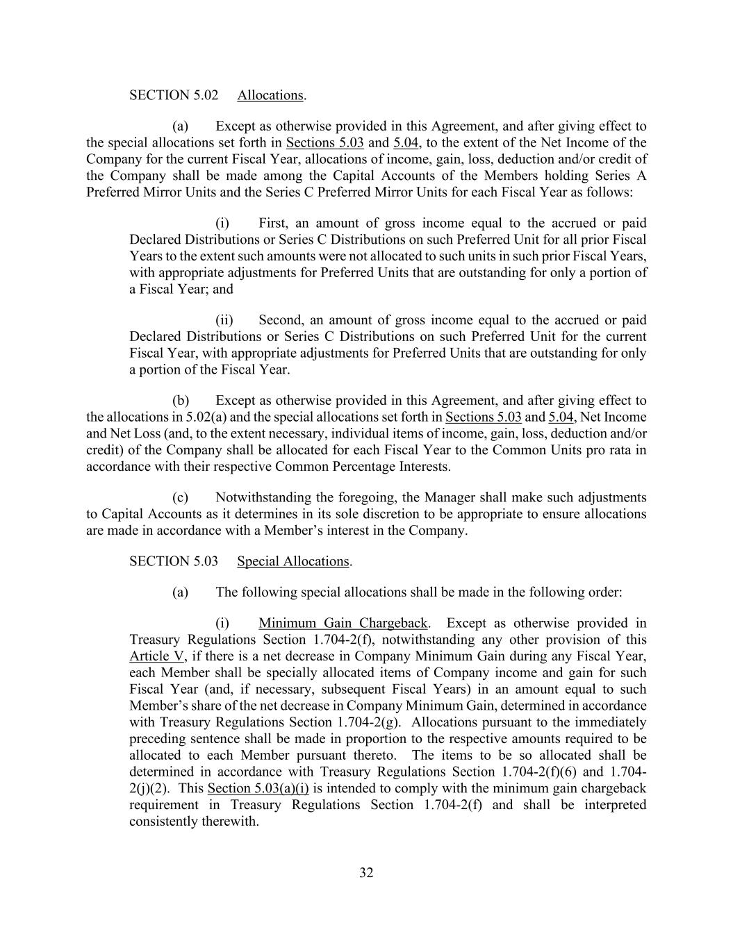 32 SECTION 5.02 Allocations. (a) Except as otherwise provided in this Agreement, and after giving effect to the special allocations set forth in Sections 5.03 and 5.04, to the extent of the Net Income of the Company for the current Fiscal Year, allocations of income, gain, loss, deduction and/or credit of the Company shall be made among the Capital Accounts of the Members holding Series A Preferred Mirror Units and the Series C Preferred Mirror Units for each Fiscal Year as follows: (i) First, an amount of gross income equal to the accrued or paid Declared Distributions or Series C Distributions on such Preferred Unit for all prior Fiscal Years to the extent such amounts were not allocated to such units in such prior Fiscal Years, with appropriate adjustments for Preferred Units that are outstanding for only a portion of a Fiscal Year; and (ii) Second, an amount of gross income equal to the accrued or paid Declared Distributions or Series C Distributions on such Preferred Unit for the current Fiscal Year, with appropriate adjustments for Preferred Units that are outstanding for only a portion of the Fiscal Year. (b) Except as otherwise provided in this Agreement, and after giving effect to the allocations in 5.02(a) and the special allocations set forth in Sections 5.03 and 5.04, Net Income and Net Loss (and, to the extent necessary, individual items of income, gain, loss, deduction and/or credit) of the Company shall be allocated for each Fiscal Year to the Common Units pro rata in accordance with their respective Common Percentage Interests. (c) Notwithstanding the foregoing, the Manager shall make such adjustments to Capital Accounts as it determines in its sole discretion to be appropriate to ensure allocations are made in accordance with a Member’s interest in the Company. SECTION 5.03 Special Allocations. (a) The following special allocations shall be made in the following order: (i) Minimum Gain Chargeback. Except as otherwise provided in Treasury Regulations Section 1.704-2(f), notwithstanding any other provision of this Article V, if there is a net decrease in Company Minimum Gain during any Fiscal Year, each Member shall be specially allocated items of Company income and gain for such Fiscal Year (and, if necessary, subsequent Fiscal Years) in an amount equal to such Member’s share of the net decrease in Company Minimum Gain, determined in accordance with Treasury Regulations Section 1.704-2(g). Allocations pursuant to the immediately preceding sentence shall be made in proportion to the respective amounts required to be allocated to each Member pursuant thereto. The items to be so allocated shall be determined in accordance with Treasury Regulations Section 1.704-2(f)(6) and 1.704- 2(j)(2). This Section 5.03(a)(i) is intended to comply with the minimum gain chargeback requirement in Treasury Regulations Section 1.704-2(f) and shall be interpreted consistently therewith.