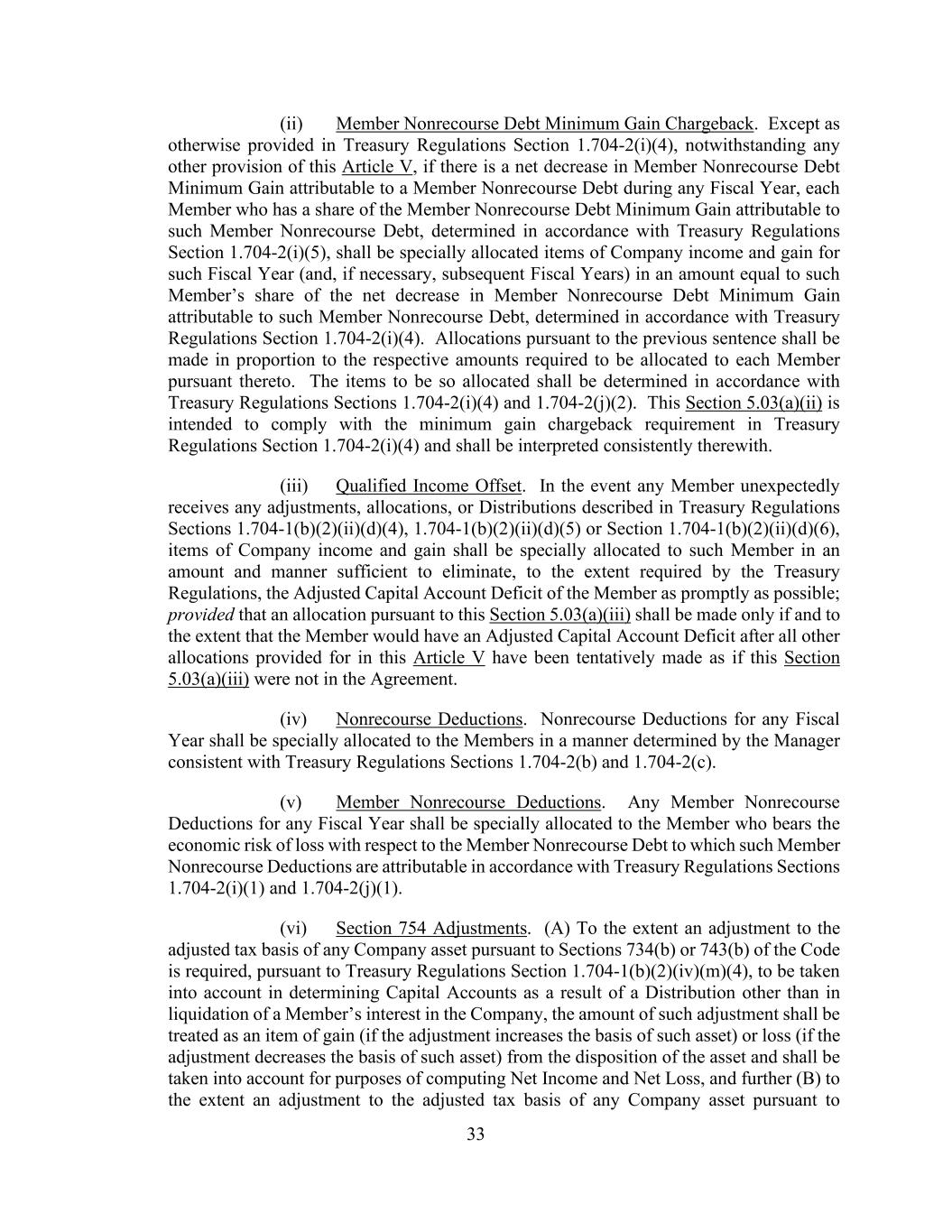 33 (ii) Member Nonrecourse Debt Minimum Gain Chargeback. Except as otherwise provided in Treasury Regulations Section 1.704-2(i)(4), notwithstanding any other provision of this Article V, if there is a net decrease in Member Nonrecourse Debt Minimum Gain attributable to a Member Nonrecourse Debt during any Fiscal Year, each Member who has a share of the Member Nonrecourse Debt Minimum Gain attributable to such Member Nonrecourse Debt, determined in accordance with Treasury Regulations Section 1.704-2(i)(5), shall be specially allocated items of Company income and gain for such Fiscal Year (and, if necessary, subsequent Fiscal Years) in an amount equal to such Member’s share of the net decrease in Member Nonrecourse Debt Minimum Gain attributable to such Member Nonrecourse Debt, determined in accordance with Treasury Regulations Section 1.704-2(i)(4). Allocations pursuant to the previous sentence shall be made in proportion to the respective amounts required to be allocated to each Member pursuant thereto. The items to be so allocated shall be determined in accordance with Treasury Regulations Sections 1.704-2(i)(4) and 1.704-2(j)(2). This Section 5.03(a)(ii) is intended to comply with the minimum gain chargeback requirement in Treasury Regulations Section 1.704-2(i)(4) and shall be interpreted consistently therewith. (iii) Qualified Income Offset. In the event any Member unexpectedly receives any adjustments, allocations, or Distributions described in Treasury Regulations Sections 1.704-1(b)(2)(ii)(d)(4), 1.704-1(b)(2)(ii)(d)(5) or Section 1.704-1(b)(2)(ii)(d)(6), items of Company income and gain shall be specially allocated to such Member in an amount and manner sufficient to eliminate, to the extent required by the Treasury Regulations, the Adjusted Capital Account Deficit of the Member as promptly as possible; provided that an allocation pursuant to this Section 5.03(a)(iii) shall be made only if and to the extent that the Member would have an Adjusted Capital Account Deficit after all other allocations provided for in this Article V have been tentatively made as if this Section 5.03(a)(iii) were not in the Agreement. (iv) Nonrecourse Deductions. Nonrecourse Deductions for any Fiscal Year shall be specially allocated to the Members in a manner determined by the Manager consistent with Treasury Regulations Sections 1.704-2(b) and 1.704-2(c). (v) Member Nonrecourse Deductions. Any Member Nonrecourse Deductions for any Fiscal Year shall be specially allocated to the Member who bears the economic risk of loss with respect to the Member Nonrecourse Debt to which such Member Nonrecourse Deductions are attributable in accordance with Treasury Regulations Sections 1.704-2(i)(1) and 1.704-2(j)(1). (vi) Section 754 Adjustments. (A) To the extent an adjustment to the adjusted tax basis of any Company asset pursuant to Sections 734(b) or 743(b) of the Code is required, pursuant to Treasury Regulations Section 1.704-1(b)(2)(iv)(m)(4), to be taken into account in determining Capital Accounts as a result of a Distribution other than in liquidation of a Member’s interest in the Company, the amount of such adjustment shall be treated as an item of gain (if the adjustment increases the basis of such asset) or loss (if the adjustment decreases the basis of such asset) from the disposition of the asset and shall be taken into account for purposes of computing Net Income and Net Loss, and further (B) to the extent an adjustment to the adjusted tax basis of any Company asset pursuant to