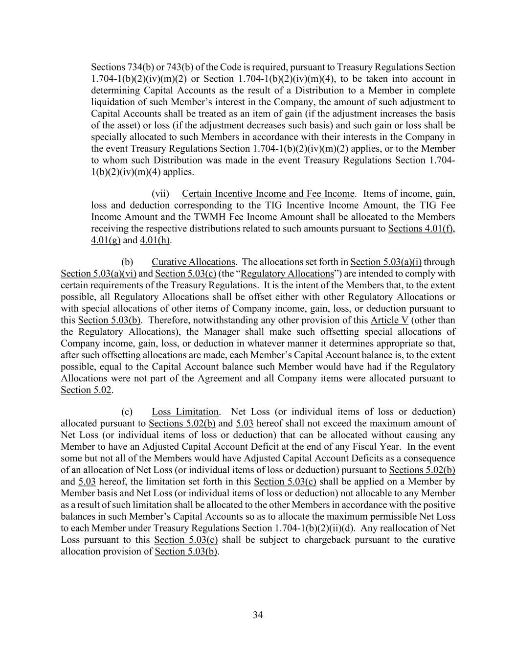34 Sections 734(b) or 743(b) of the Code is required, pursuant to Treasury Regulations Section 1.704-1(b)(2)(iv)(m)(2) or Section 1.704-1(b)(2)(iv)(m)(4), to be taken into account in determining Capital Accounts as the result of a Distribution to a Member in complete liquidation of such Member’s interest in the Company, the amount of such adjustment to Capital Accounts shall be treated as an item of gain (if the adjustment increases the basis of the asset) or loss (if the adjustment decreases such basis) and such gain or loss shall be specially allocated to such Members in accordance with their interests in the Company in the event Treasury Regulations Section 1.704-1(b)(2)(iv)(m)(2) applies, or to the Member to whom such Distribution was made in the event Treasury Regulations Section 1.704- 1(b)(2)(iv)(m)(4) applies. (vii) Certain Incentive Income and Fee Income. Items of income, gain, loss and deduction corresponding to the TIG Incentive Income Amount, the TIG Fee Income Amount and the TWMH Fee Income Amount shall be allocated to the Members receiving the respective distributions related to such amounts pursuant to Sections 4.01(f), 4.01(g) and 4.01(h). (b) Curative Allocations. The allocations set forth in Section 5.03(a)(i) through Section 5.03(a)(vi) and Section 5.03(c) (the “Regulatory Allocations”) are intended to comply with certain requirements of the Treasury Regulations. It is the intent of the Members that, to the extent possible, all Regulatory Allocations shall be offset either with other Regulatory Allocations or with special allocations of other items of Company income, gain, loss, or deduction pursuant to this Section 5.03(b). Therefore, notwithstanding any other provision of this Article V (other than the Regulatory Allocations), the Manager shall make such offsetting special allocations of Company income, gain, loss, or deduction in whatever manner it determines appropriate so that, after such offsetting allocations are made, each Member’s Capital Account balance is, to the extent possible, equal to the Capital Account balance such Member would have had if the Regulatory Allocations were not part of the Agreement and all Company items were allocated pursuant to Section 5.02. (c) Loss Limitation. Net Loss (or individual items of loss or deduction) allocated pursuant to Sections 5.02(b) and 5.03 hereof shall not exceed the maximum amount of Net Loss (or individual items of loss or deduction) that can be allocated without causing any Member to have an Adjusted Capital Account Deficit at the end of any Fiscal Year. In the event some but not all of the Members would have Adjusted Capital Account Deficits as a consequence of an allocation of Net Loss (or individual items of loss or deduction) pursuant to Sections 5.02(b) and 5.03 hereof, the limitation set forth in this Section 5.03(c) shall be applied on a Member by Member basis and Net Loss (or individual items of loss or deduction) not allocable to any Member as a result of such limitation shall be allocated to the other Members in accordance with the positive balances in such Member’s Capital Accounts so as to allocate the maximum permissible Net Loss to each Member under Treasury Regulations Section 1.704-1(b)(2)(ii)(d). Any reallocation of Net Loss pursuant to this Section 5.03(c) shall be subject to chargeback pursuant to the curative allocation provision of Section 5.03(b).