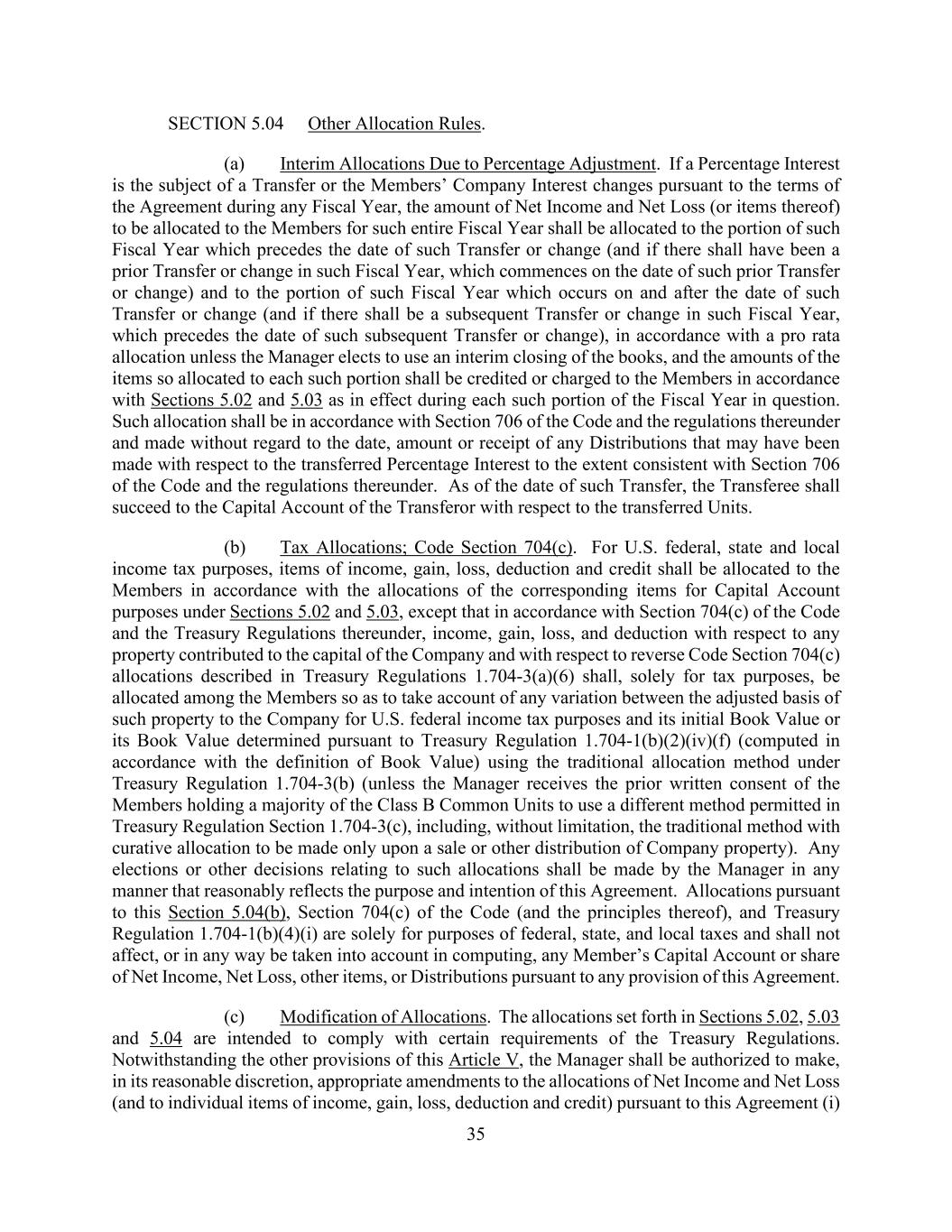 35 SECTION 5.04 Other Allocation Rules. (a) Interim Allocations Due to Percentage Adjustment. If a Percentage Interest is the subject of a Transfer or the Members’ Company Interest changes pursuant to the terms of the Agreement during any Fiscal Year, the amount of Net Income and Net Loss (or items thereof) to be allocated to the Members for such entire Fiscal Year shall be allocated to the portion of such Fiscal Year which precedes the date of such Transfer or change (and if there shall have been a prior Transfer or change in such Fiscal Year, which commences on the date of such prior Transfer or change) and to the portion of such Fiscal Year which occurs on and after the date of such Transfer or change (and if there shall be a subsequent Transfer or change in such Fiscal Year, which precedes the date of such subsequent Transfer or change), in accordance with a pro rata allocation unless the Manager elects to use an interim closing of the books, and the amounts of the items so allocated to each such portion shall be credited or charged to the Members in accordance with Sections 5.02 and 5.03 as in effect during each such portion of the Fiscal Year in question. Such allocation shall be in accordance with Section 706 of the Code and the regulations thereunder and made without regard to the date, amount or receipt of any Distributions that may have been made with respect to the transferred Percentage Interest to the extent consistent with Section 706 of the Code and the regulations thereunder. As of the date of such Transfer, the Transferee shall succeed to the Capital Account of the Transferor with respect to the transferred Units. (b) Tax Allocations; Code Section 704(c). For U.S. federal, state and local income tax purposes, items of income, gain, loss, deduction and credit shall be allocated to the Members in accordance with the allocations of the corresponding items for Capital Account purposes under Sections 5.02 and 5.03, except that in accordance with Section 704(c) of the Code and the Treasury Regulations thereunder, income, gain, loss, and deduction with respect to any property contributed to the capital of the Company and with respect to reverse Code Section 704(c) allocations described in Treasury Regulations 1.704-3(a)(6) shall, solely for tax purposes, be allocated among the Members so as to take account of any variation between the adjusted basis of such property to the Company for U.S. federal income tax purposes and its initial Book Value or its Book Value determined pursuant to Treasury Regulation 1.704-1(b)(2)(iv)(f) (computed in accordance with the definition of Book Value) using the traditional allocation method under Treasury Regulation 1.704-3(b) (unless the Manager receives the prior written consent of the Members holding a majority of the Class B Common Units to use a different method permitted in Treasury Regulation Section 1.704-3(c), including, without limitation, the traditional method with curative allocation to be made only upon a sale or other distribution of Company property). Any elections or other decisions relating to such allocations shall be made by the Manager in any manner that reasonably reflects the purpose and intention of this Agreement. Allocations pursuant to this Section 5.04(b), Section 704(c) of the Code (and the principles thereof), and Treasury Regulation 1.704-1(b)(4)(i) are solely for purposes of federal, state, and local taxes and shall not affect, or in any way be taken into account in computing, any Member’s Capital Account or share of Net Income, Net Loss, other items, or Distributions pursuant to any provision of this Agreement. (c) Modification of Allocations. The allocations set forth in Sections 5.02, 5.03 and 5.04 are intended to comply with certain requirements of the Treasury Regulations. Notwithstanding the other provisions of this Article V, the Manager shall be authorized to make, in its reasonable discretion, appropriate amendments to the allocations of Net Income and Net Loss (and to individual items of income, gain, loss, deduction and credit) pursuant to this Agreement (i)
