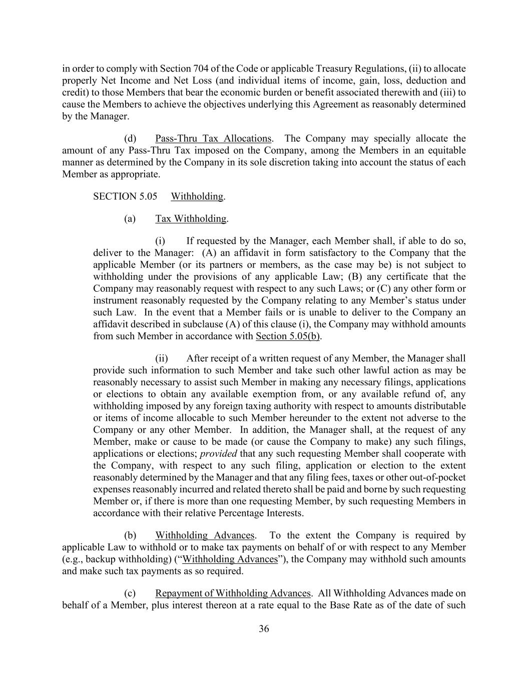 36 in order to comply with Section 704 of the Code or applicable Treasury Regulations, (ii) to allocate properly Net Income and Net Loss (and individual items of income, gain, loss, deduction and credit) to those Members that bear the economic burden or benefit associated therewith and (iii) to cause the Members to achieve the objectives underlying this Agreement as reasonably determined by the Manager. (d) Pass-Thru Tax Allocations. The Company may specially allocate the amount of any Pass-Thru Tax imposed on the Company, among the Members in an equitable manner as determined by the Company in its sole discretion taking into account the status of each Member as appropriate. SECTION 5.05 Withholding. (a) Tax Withholding. (i) If requested by the Manager, each Member shall, if able to do so, deliver to the Manager: (A) an affidavit in form satisfactory to the Company that the applicable Member (or its partners or members, as the case may be) is not subject to withholding under the provisions of any applicable Law; (B) any certificate that the Company may reasonably request with respect to any such Laws; or (C) any other form or instrument reasonably requested by the Company relating to any Member’s status under such Law. In the event that a Member fails or is unable to deliver to the Company an affidavit described in subclause (A) of this clause (i), the Company may withhold amounts from such Member in accordance with Section 5.05(b). (ii) After receipt of a written request of any Member, the Manager shall provide such information to such Member and take such other lawful action as may be reasonably necessary to assist such Member in making any necessary filings, applications or elections to obtain any available exemption from, or any available refund of, any withholding imposed by any foreign taxing authority with respect to amounts distributable or items of income allocable to such Member hereunder to the extent not adverse to the Company or any other Member. In addition, the Manager shall, at the request of any Member, make or cause to be made (or cause the Company to make) any such filings, applications or elections; provided that any such requesting Member shall cooperate with the Company, with respect to any such filing, application or election to the extent reasonably determined by the Manager and that any filing fees, taxes or other out-of-pocket expenses reasonably incurred and related thereto shall be paid and borne by such requesting Member or, if there is more than one requesting Member, by such requesting Members in accordance with their relative Percentage Interests. (b) Withholding Advances. To the extent the Company is required by applicable Law to withhold or to make tax payments on behalf of or with respect to any Member (e.g., backup withholding) (“Withholding Advances”), the Company may withhold such amounts and make such tax payments as so required. (c) Repayment of Withholding Advances. All Withholding Advances made on behalf of a Member, plus interest thereon at a rate equal to the Base Rate as of the date of such