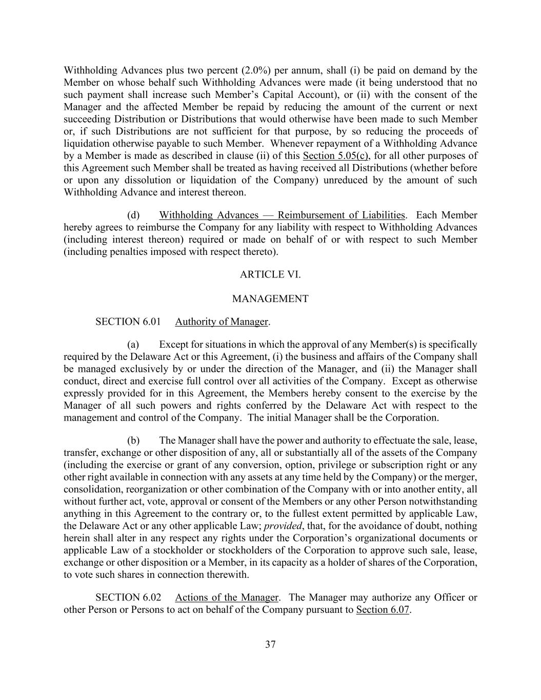 37 Withholding Advances plus two percent (2.0%) per annum, shall (i) be paid on demand by the Member on whose behalf such Withholding Advances were made (it being understood that no such payment shall increase such Member’s Capital Account), or (ii) with the consent of the Manager and the affected Member be repaid by reducing the amount of the current or next succeeding Distribution or Distributions that would otherwise have been made to such Member or, if such Distributions are not sufficient for that purpose, by so reducing the proceeds of liquidation otherwise payable to such Member. Whenever repayment of a Withholding Advance by a Member is made as described in clause (ii) of this Section 5.05(c), for all other purposes of this Agreement such Member shall be treated as having received all Distributions (whether before or upon any dissolution or liquidation of the Company) unreduced by the amount of such Withholding Advance and interest thereon. (d) Withholding Advances — Reimbursement of Liabilities. Each Member hereby agrees to reimburse the Company for any liability with respect to Withholding Advances (including interest thereon) required or made on behalf of or with respect to such Member (including penalties imposed with respect thereto). ARTICLE VI. MANAGEMENT SECTION 6.01 Authority of Manager. (a) Except for situations in which the approval of any Member(s) is specifically required by the Delaware Act or this Agreement, (i) the business and affairs of the Company shall be managed exclusively by or under the direction of the Manager, and (ii) the Manager shall conduct, direct and exercise full control over all activities of the Company. Except as otherwise expressly provided for in this Agreement, the Members hereby consent to the exercise by the Manager of all such powers and rights conferred by the Delaware Act with respect to the management and control of the Company. The initial Manager shall be the Corporation. (b) The Manager shall have the power and authority to effectuate the sale, lease, transfer, exchange or other disposition of any, all or substantially all of the assets of the Company (including the exercise or grant of any conversion, option, privilege or subscription right or any other right available in connection with any assets at any time held by the Company) or the merger, consolidation, reorganization or other combination of the Company with or into another entity, all without further act, vote, approval or consent of the Members or any other Person notwithstanding anything in this Agreement to the contrary or, to the fullest extent permitted by applicable Law, the Delaware Act or any other applicable Law; provided, that, for the avoidance of doubt, nothing herein shall alter in any respect any rights under the Corporation’s organizational documents or applicable Law of a stockholder or stockholders of the Corporation to approve such sale, lease, exchange or other disposition or a Member, in its capacity as a holder of shares of the Corporation, to vote such shares in connection therewith. SECTION 6.02 Actions of the Manager. The Manager may authorize any Officer or other Person or Persons to act on behalf of the Company pursuant to Section 6.07.