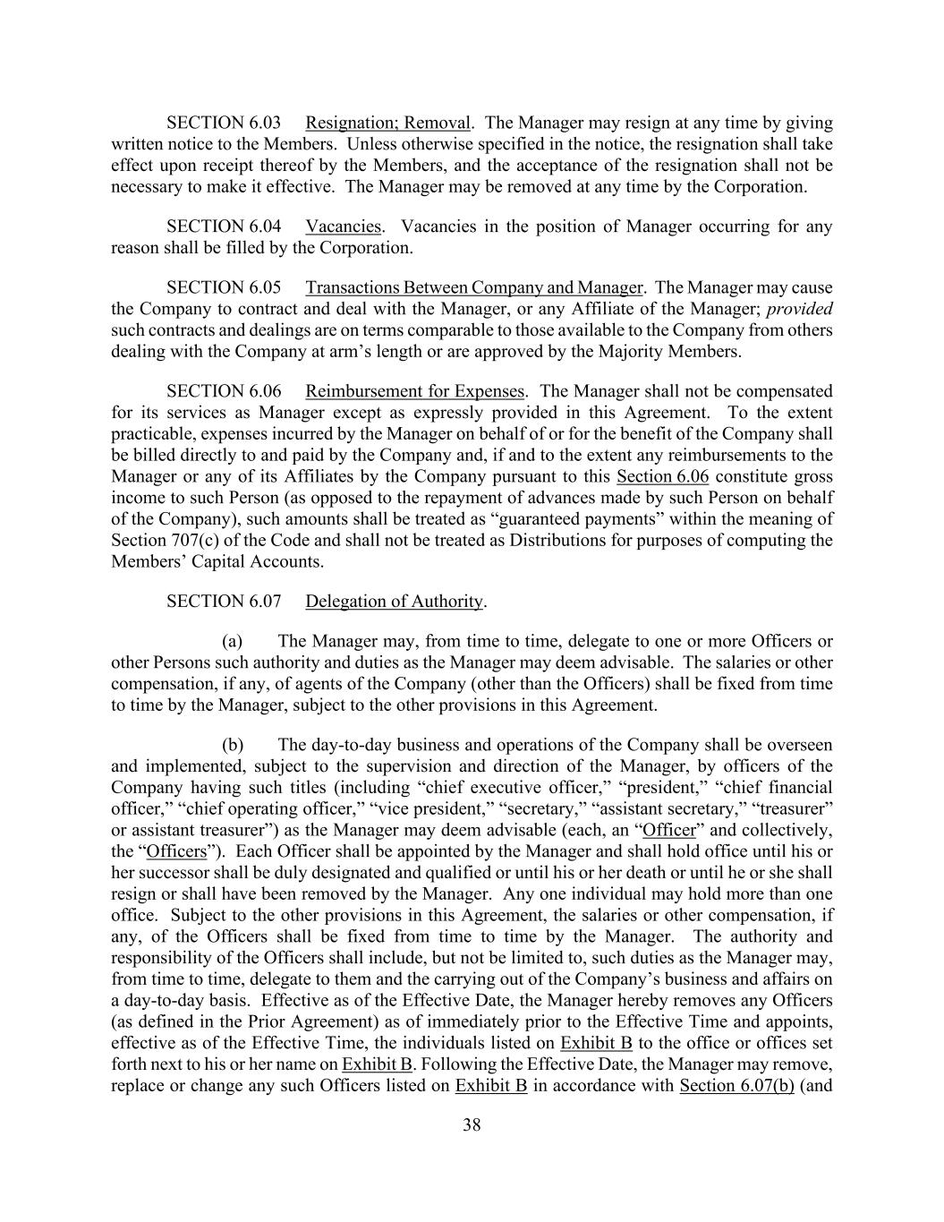 38 SECTION 6.03 Resignation; Removal. The Manager may resign at any time by giving written notice to the Members. Unless otherwise specified in the notice, the resignation shall take effect upon receipt thereof by the Members, and the acceptance of the resignation shall not be necessary to make it effective. The Manager may be removed at any time by the Corporation. SECTION 6.04 Vacancies. Vacancies in the position of Manager occurring for any reason shall be filled by the Corporation. SECTION 6.05 Transactions Between Company and Manager. The Manager may cause the Company to contract and deal with the Manager, or any Affiliate of the Manager; provided such contracts and dealings are on terms comparable to those available to the Company from others dealing with the Company at arm’s length or are approved by the Majority Members. SECTION 6.06 Reimbursement for Expenses. The Manager shall not be compensated for its services as Manager except as expressly provided in this Agreement. To the extent practicable, expenses incurred by the Manager on behalf of or for the benefit of the Company shall be billed directly to and paid by the Company and, if and to the extent any reimbursements to the Manager or any of its Affiliates by the Company pursuant to this Section 6.06 constitute gross income to such Person (as opposed to the repayment of advances made by such Person on behalf of the Company), such amounts shall be treated as “guaranteed payments” within the meaning of Section 707(c) of the Code and shall not be treated as Distributions for purposes of computing the Members’ Capital Accounts. SECTION 6.07 Delegation of Authority. (a) The Manager may, from time to time, delegate to one or more Officers or other Persons such authority and duties as the Manager may deem advisable. The salaries or other compensation, if any, of agents of the Company (other than the Officers) shall be fixed from time to time by the Manager, subject to the other provisions in this Agreement. (b) The day-to-day business and operations of the Company shall be overseen and implemented, subject to the supervision and direction of the Manager, by officers of the Company having such titles (including “chief executive officer,” “president,” “chief financial officer,” “chief operating officer,” “vice president,” “secretary,” “assistant secretary,” “treasurer” or assistant treasurer”) as the Manager may deem advisable (each, an “Officer” and collectively, the “Officers”). Each Officer shall be appointed by the Manager and shall hold office until his or her successor shall be duly designated and qualified or until his or her death or until he or she shall resign or shall have been removed by the Manager. Any one individual may hold more than one office. Subject to the other provisions in this Agreement, the salaries or other compensation, if any, of the Officers shall be fixed from time to time by the Manager. The authority and responsibility of the Officers shall include, but not be limited to, such duties as the Manager may, from time to time, delegate to them and the carrying out of the Company’s business and affairs on a day-to-day basis. Effective as of the Effective Date, the Manager hereby removes any Officers (as defined in the Prior Agreement) as of immediately prior to the Effective Time and appoints, effective as of the Effective Time, the individuals listed on Exhibit B to the office or offices set forth next to his or her name on Exhibit B. Following the Effective Date, the Manager may remove, replace or change any such Officers listed on Exhibit B in accordance with Section 6.07(b) (and