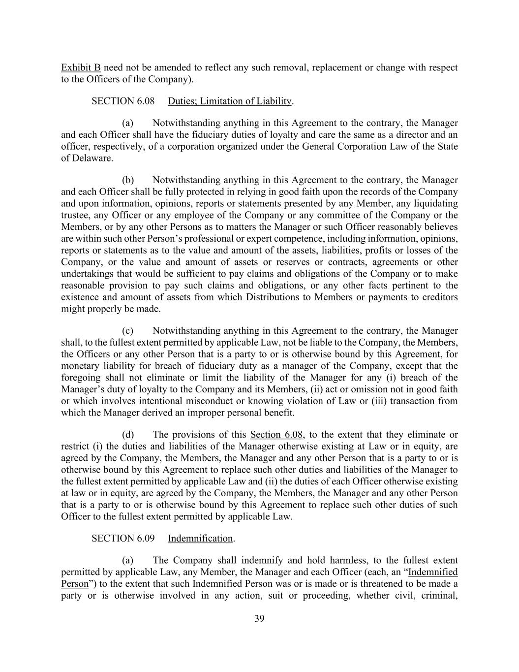 39 Exhibit B need not be amended to reflect any such removal, replacement or change with respect to the Officers of the Company). SECTION 6.08 Duties; Limitation of Liability. (a) Notwithstanding anything in this Agreement to the contrary, the Manager and each Officer shall have the fiduciary duties of loyalty and care the same as a director and an officer, respectively, of a corporation organized under the General Corporation Law of the State of Delaware. (b) Notwithstanding anything in this Agreement to the contrary, the Manager and each Officer shall be fully protected in relying in good faith upon the records of the Company and upon information, opinions, reports or statements presented by any Member, any liquidating trustee, any Officer or any employee of the Company or any committee of the Company or the Members, or by any other Persons as to matters the Manager or such Officer reasonably believes are within such other Person’s professional or expert competence, including information, opinions, reports or statements as to the value and amount of the assets, liabilities, profits or losses of the Company, or the value and amount of assets or reserves or contracts, agreements or other undertakings that would be sufficient to pay claims and obligations of the Company or to make reasonable provision to pay such claims and obligations, or any other facts pertinent to the existence and amount of assets from which Distributions to Members or payments to creditors might properly be made. (c) Notwithstanding anything in this Agreement to the contrary, the Manager shall, to the fullest extent permitted by applicable Law, not be liable to the Company, the Members, the Officers or any other Person that is a party to or is otherwise bound by this Agreement, for monetary liability for breach of fiduciary duty as a manager of the Company, except that the foregoing shall not eliminate or limit the liability of the Manager for any (i) breach of the Manager’s duty of loyalty to the Company and its Members, (ii) act or omission not in good faith or which involves intentional misconduct or knowing violation of Law or (iii) transaction from which the Manager derived an improper personal benefit. (d) The provisions of this Section 6.08, to the extent that they eliminate or restrict (i) the duties and liabilities of the Manager otherwise existing at Law or in equity, are agreed by the Company, the Members, the Manager and any other Person that is a party to or is otherwise bound by this Agreement to replace such other duties and liabilities of the Manager to the fullest extent permitted by applicable Law and (ii) the duties of each Officer otherwise existing at law or in equity, are agreed by the Company, the Members, the Manager and any other Person that is a party to or is otherwise bound by this Agreement to replace such other duties of such Officer to the fullest extent permitted by applicable Law. SECTION 6.09 Indemnification. (a) The Company shall indemnify and hold harmless, to the fullest extent permitted by applicable Law, any Member, the Manager and each Officer (each, an “Indemnified Person”) to the extent that such Indemnified Person was or is made or is threatened to be made a party or is otherwise involved in any action, suit or proceeding, whether civil, criminal,