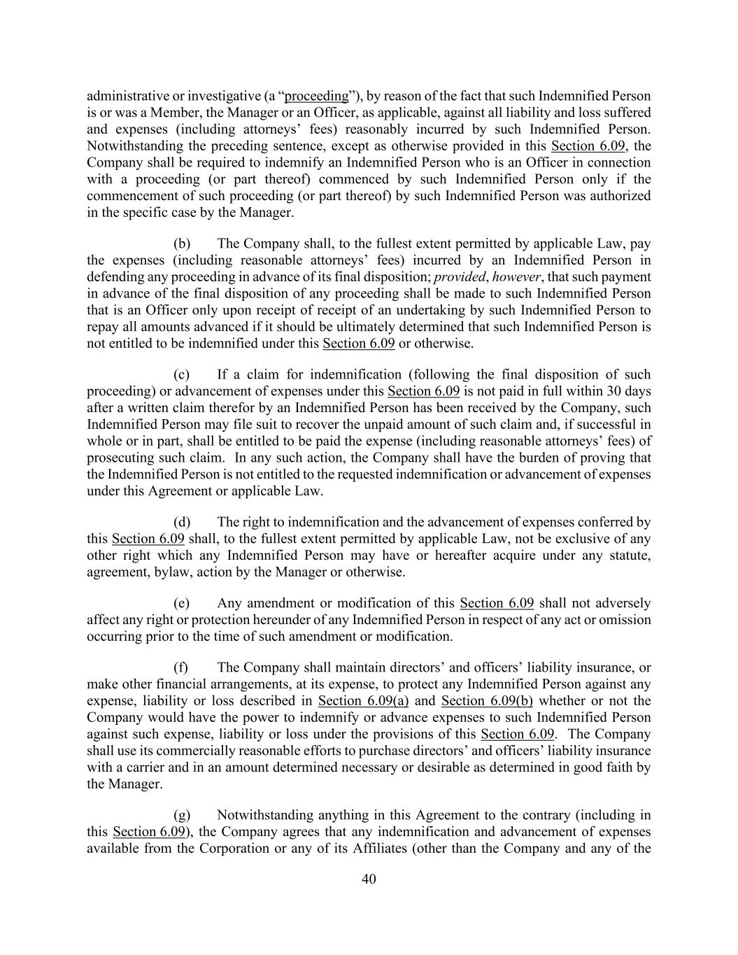 40 administrative or investigative (a “proceeding”), by reason of the fact that such Indemnified Person is or was a Member, the Manager or an Officer, as applicable, against all liability and loss suffered and expenses (including attorneys’ fees) reasonably incurred by such Indemnified Person. Notwithstanding the preceding sentence, except as otherwise provided in this Section 6.09, the Company shall be required to indemnify an Indemnified Person who is an Officer in connection with a proceeding (or part thereof) commenced by such Indemnified Person only if the commencement of such proceeding (or part thereof) by such Indemnified Person was authorized in the specific case by the Manager. (b) The Company shall, to the fullest extent permitted by applicable Law, pay the expenses (including reasonable attorneys’ fees) incurred by an Indemnified Person in defending any proceeding in advance of its final disposition; provided, however, that such payment in advance of the final disposition of any proceeding shall be made to such Indemnified Person that is an Officer only upon receipt of receipt of an undertaking by such Indemnified Person to repay all amounts advanced if it should be ultimately determined that such Indemnified Person is not entitled to be indemnified under this Section 6.09 or otherwise. (c) If a claim for indemnification (following the final disposition of such proceeding) or advancement of expenses under this Section 6.09 is not paid in full within 30 days after a written claim therefor by an Indemnified Person has been received by the Company, such Indemnified Person may file suit to recover the unpaid amount of such claim and, if successful in whole or in part, shall be entitled to be paid the expense (including reasonable attorneys’ fees) of prosecuting such claim. In any such action, the Company shall have the burden of proving that the Indemnified Person is not entitled to the requested indemnification or advancement of expenses under this Agreement or applicable Law. (d) The right to indemnification and the advancement of expenses conferred by this Section 6.09 shall, to the fullest extent permitted by applicable Law, not be exclusive of any other right which any Indemnified Person may have or hereafter acquire under any statute, agreement, bylaw, action by the Manager or otherwise. (e) Any amendment or modification of this Section 6.09 shall not adversely affect any right or protection hereunder of any Indemnified Person in respect of any act or omission occurring prior to the time of such amendment or modification. (f) The Company shall maintain directors’ and officers’ liability insurance, or make other financial arrangements, at its expense, to protect any Indemnified Person against any expense, liability or loss described in Section 6.09(a) and Section 6.09(b) whether or not the Company would have the power to indemnify or advance expenses to such Indemnified Person against such expense, liability or loss under the provisions of this Section 6.09. The Company shall use its commercially reasonable efforts to purchase directors’ and officers’ liability insurance with a carrier and in an amount determined necessary or desirable as determined in good faith by the Manager. (g) Notwithstanding anything in this Agreement to the contrary (including in this Section 6.09), the Company agrees that any indemnification and advancement of expenses available from the Corporation or any of its Affiliates (other than the Company and any of the