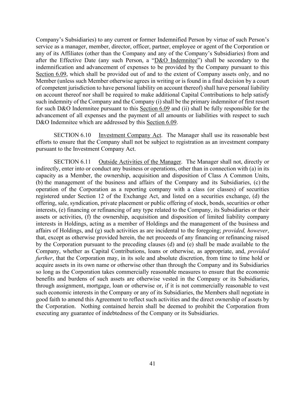 41 Company’s Subsidiaries) to any current or former Indemnified Person by virtue of such Person’s service as a manager, member, director, officer, partner, employee or agent of the Corporation or any of its Affiliates (other than the Company and any of the Company’s Subsidiaries) from and after the Effective Date (any such Person, a “D&O Indemnitee”) shall be secondary to the indemnification and advancement of expenses to be provided by the Company pursuant to this Section 6.09, which shall be provided out of and to the extent of Company assets only, and no Member (unless such Member otherwise agrees in writing or is found in a final decision by a court of competent jurisdiction to have personal liability on account thereof) shall have personal liability on account thereof nor shall be required to make additional Capital Contributions to help satisfy such indemnity of the Company and the Company (i) shall be the primary indemnitor of first resort for such D&O Indemnitee pursuant to this Section 6.09 and (ii) shall be fully responsible for the advancement of all expenses and the payment of all amounts or liabilities with respect to such D&O Indemnitee which are addressed by this Section 6.09. SECTION 6.10 Investment Company Act. The Manager shall use its reasonable best efforts to ensure that the Company shall not be subject to registration as an investment company pursuant to the Investment Company Act. SECTION 6.11 Outside Activities of the Manager. The Manager shall not, directly or indirectly, enter into or conduct any business or operations, other than in connection with (a) in its capacity as a Member, the ownership, acquisition and disposition of Class A Common Units, (b) the management of the business and affairs of the Company and its Subsidiaries, (c) the operation of the Corporation as a reporting company with a class (or classes) of securities registered under Section 12 of the Exchange Act, and listed on a securities exchange, (d) the offering, sale, syndication, private placement or public offering of stock, bonds, securities or other interests, (e) financing or refinancing of any type related to the Company, its Subsidiaries or their assets or activities, (f) the ownership, acquisition and disposition of limited liability company interests in Holdings, acting as a member of Holdings and the management of the business and affairs of Holdings, and (g) such activities as are incidental to the foregoing; provided, however, that, except as otherwise provided herein, the net proceeds of any financing or refinancing raised by the Corporation pursuant to the preceding clauses (d) and (e) shall be made available to the Company, whether as Capital Contributions, loans or otherwise, as appropriate, and, provided further, that the Corporation may, in its sole and absolute discretion, from time to time hold or acquire assets in its own name or otherwise other than through the Company and its Subsidiaries so long as the Corporation takes commercially reasonable measures to ensure that the economic benefits and burdens of such assets are otherwise vested in the Company or its Subsidiaries, through assignment, mortgage, loan or otherwise or, if it is not commercially reasonable to vest such economic interests in the Company or any of its Subsidiaries, the Members shall negotiate in good faith to amend this Agreement to reflect such activities and the direct ownership of assets by the Corporation. Nothing contained herein shall be deemed to prohibit the Corporation from executing any guarantee of indebtedness of the Company or its Subsidiaries.