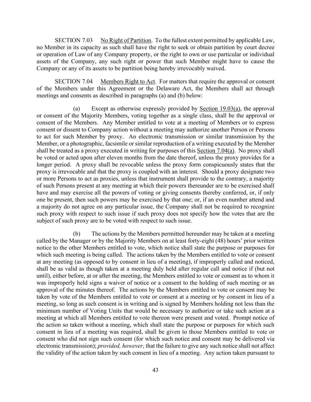 43 SECTION 7.03 No Right of Partition. To the fullest extent permitted by applicable Law, no Member in its capacity as such shall have the right to seek or obtain partition by court decree or operation of Law of any Company property, or the right to own or use particular or individual assets of the Company, any such right or power that such Member might have to cause the Company or any of its assets to be partition being hereby irrevocably waived. SECTION 7.04 Members Right to Act. For matters that require the approval or consent of the Members under this Agreement or the Delaware Act, the Members shall act through meetings and consents as described in paragraphs (a) and (b) below: (a) Except as otherwise expressly provided by Section 19.03(a), the approval or consent of the Majority Members, voting together as a single class, shall be the approval or consent of the Members. Any Member entitled to vote at a meeting of Members or to express consent or dissent to Company action without a meeting may authorize another Person or Persons to act for such Member by proxy. An electronic transmission or similar transmission by the Member, or a photographic, facsimile or similar reproduction of a writing executed by the Member shall be treated as a proxy executed in writing for purposes of this Section 7.04(a). No proxy shall be voted or acted upon after eleven months from the date thereof, unless the proxy provides for a longer period. A proxy shall be revocable unless the proxy form conspicuously states that the proxy is irrevocable and that the proxy is coupled with an interest. Should a proxy designate two or more Persons to act as proxies, unless that instrument shall provide to the contrary, a majority of such Persons present at any meeting at which their powers thereunder are to be exercised shall have and may exercise all the powers of voting or giving consents thereby conferred, or, if only one be present, then such powers may be exercised by that one; or, if an even number attend and a majority do not agree on any particular issue, the Company shall not be required to recognize such proxy with respect to such issue if such proxy does not specify how the votes that are the subject of such proxy are to be voted with respect to such issue. (b) The actions by the Members permitted hereunder may be taken at a meeting called by the Manager or by the Majority Members on at least forty-eight (48) hours’ prior written notice to the other Members entitled to vote, which notice shall state the purpose or purposes for which such meeting is being called. The actions taken by the Members entitled to vote or consent at any meeting (as opposed to by consent in lieu of a meeting), if improperly called and noticed, shall be as valid as though taken at a meeting duly held after regular call and notice if (but not until), either before, at or after the meeting, the Members entitled to vote or consent as to whom it was improperly held signs a waiver of notice or a consent to the holding of such meeting or an approval of the minutes thereof. The actions by the Members entitled to vote or consent may be taken by vote of the Members entitled to vote or consent at a meeting or by consent in lieu of a meeting, so long as such consent is in writing and is signed by Members holding not less than the minimum number of Voting Units that would be necessary to authorize or take such action at a meeting at which all Members entitled to vote thereon were present and voted. Prompt notice of the action so taken without a meeting, which shall state the purpose or purposes for which such consent in lieu of a meeting was required, shall be given to those Members entitled to vote or consent who did not sign such consent (for which such notice and consent may be delivered via electronic transmission); provided, however, that the failure to give any such notice shall not affect the validity of the action taken by such consent in lieu of a meeting. Any action taken pursuant to