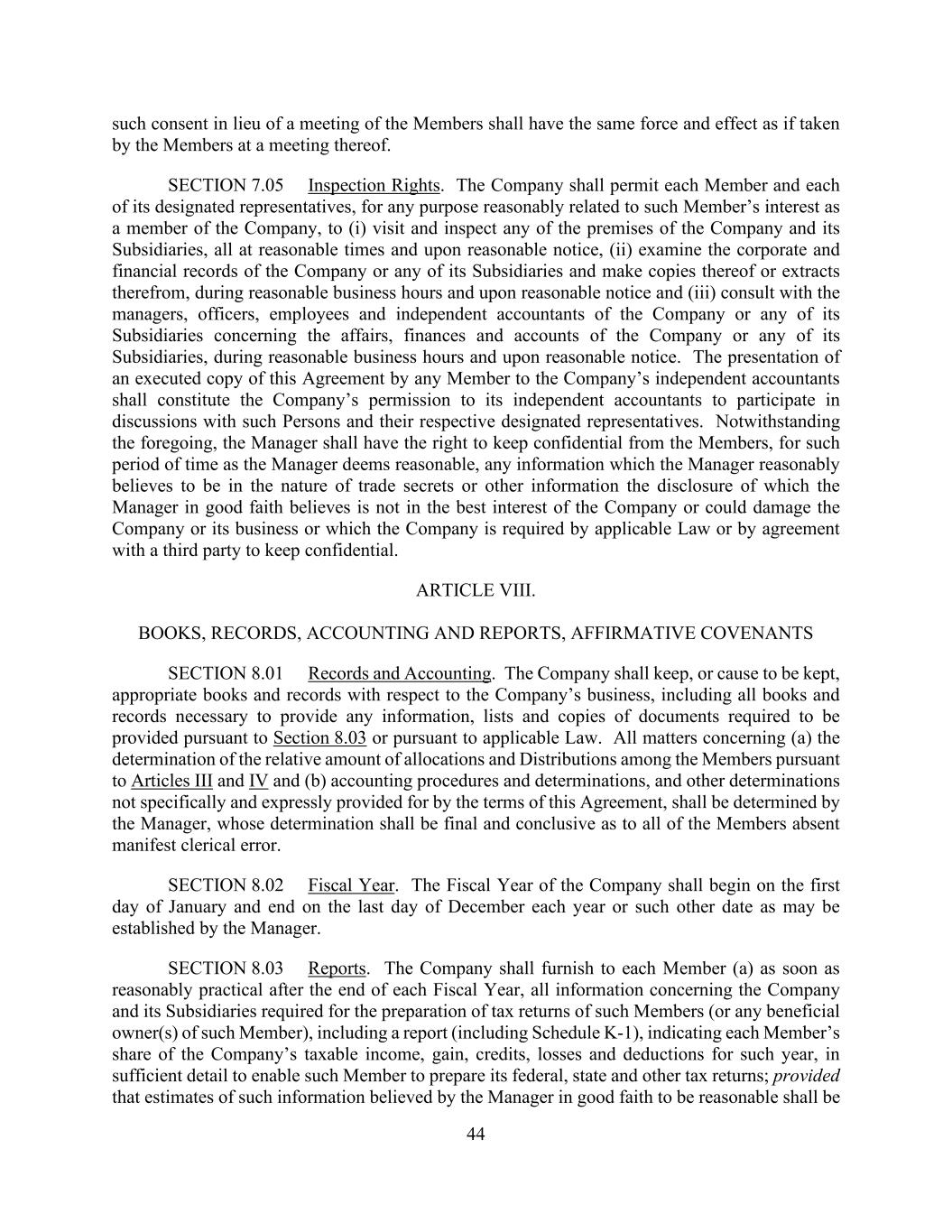 44 such consent in lieu of a meeting of the Members shall have the same force and effect as if taken by the Members at a meeting thereof. SECTION 7.05 Inspection Rights. The Company shall permit each Member and each of its designated representatives, for any purpose reasonably related to such Member’s interest as a member of the Company, to (i) visit and inspect any of the premises of the Company and its Subsidiaries, all at reasonable times and upon reasonable notice, (ii) examine the corporate and financial records of the Company or any of its Subsidiaries and make copies thereof or extracts therefrom, during reasonable business hours and upon reasonable notice and (iii) consult with the managers, officers, employees and independent accountants of the Company or any of its Subsidiaries concerning the affairs, finances and accounts of the Company or any of its Subsidiaries, during reasonable business hours and upon reasonable notice. The presentation of an executed copy of this Agreement by any Member to the Company’s independent accountants shall constitute the Company’s permission to its independent accountants to participate in discussions with such Persons and their respective designated representatives. Notwithstanding the foregoing, the Manager shall have the right to keep confidential from the Members, for such period of time as the Manager deems reasonable, any information which the Manager reasonably believes to be in the nature of trade secrets or other information the disclosure of which the Manager in good faith believes is not in the best interest of the Company or could damage the Company or its business or which the Company is required by applicable Law or by agreement with a third party to keep confidential. ARTICLE VIII. BOOKS, RECORDS, ACCOUNTING AND REPORTS, AFFIRMATIVE COVENANTS SECTION 8.01 Records and Accounting. The Company shall keep, or cause to be kept, appropriate books and records with respect to the Company’s business, including all books and records necessary to provide any information, lists and copies of documents required to be provided pursuant to Section 8.03 or pursuant to applicable Law. All matters concerning (a) the determination of the relative amount of allocations and Distributions among the Members pursuant to Articles III and IV and (b) accounting procedures and determinations, and other determinations not specifically and expressly provided for by the terms of this Agreement, shall be determined by the Manager, whose determination shall be final and conclusive as to all of the Members absent manifest clerical error. SECTION 8.02 Fiscal Year. The Fiscal Year of the Company shall begin on the first day of January and end on the last day of December each year or such other date as may be established by the Manager. SECTION 8.03 Reports. The Company shall furnish to each Member (a) as soon as reasonably practical after the end of each Fiscal Year, all information concerning the Company and its Subsidiaries required for the preparation of tax returns of such Members (or any beneficial owner(s) of such Member), including a report (including Schedule K-1), indicating each Member’s share of the Company’s taxable income, gain, credits, losses and deductions for such year, in sufficient detail to enable such Member to prepare its federal, state and other tax returns; provided that estimates of such information believed by the Manager in good faith to be reasonable shall be