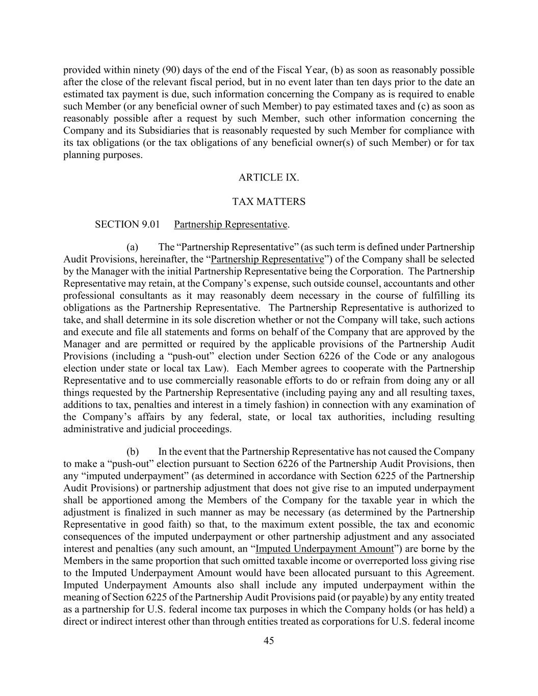 45 provided within ninety (90) days of the end of the Fiscal Year, (b) as soon as reasonably possible after the close of the relevant fiscal period, but in no event later than ten days prior to the date an estimated tax payment is due, such information concerning the Company as is required to enable such Member (or any beneficial owner of such Member) to pay estimated taxes and (c) as soon as reasonably possible after a request by such Member, such other information concerning the Company and its Subsidiaries that is reasonably requested by such Member for compliance with its tax obligations (or the tax obligations of any beneficial owner(s) of such Member) or for tax planning purposes. ARTICLE IX. TAX MATTERS SECTION 9.01 Partnership Representative. (a) The “Partnership Representative” (as such term is defined under Partnership Audit Provisions, hereinafter, the “Partnership Representative”) of the Company shall be selected by the Manager with the initial Partnership Representative being the Corporation. The Partnership Representative may retain, at the Company’s expense, such outside counsel, accountants and other professional consultants as it may reasonably deem necessary in the course of fulfilling its obligations as the Partnership Representative. The Partnership Representative is authorized to take, and shall determine in its sole discretion whether or not the Company will take, such actions and execute and file all statements and forms on behalf of the Company that are approved by the Manager and are permitted or required by the applicable provisions of the Partnership Audit Provisions (including a “push-out” election under Section 6226 of the Code or any analogous election under state or local tax Law). Each Member agrees to cooperate with the Partnership Representative and to use commercially reasonable efforts to do or refrain from doing any or all things requested by the Partnership Representative (including paying any and all resulting taxes, additions to tax, penalties and interest in a timely fashion) in connection with any examination of the Company’s affairs by any federal, state, or local tax authorities, including resulting administrative and judicial proceedings. (b) In the event that the Partnership Representative has not caused the Company to make a “push-out” election pursuant to Section 6226 of the Partnership Audit Provisions, then any “imputed underpayment” (as determined in accordance with Section 6225 of the Partnership Audit Provisions) or partnership adjustment that does not give rise to an imputed underpayment shall be apportioned among the Members of the Company for the taxable year in which the adjustment is finalized in such manner as may be necessary (as determined by the Partnership Representative in good faith) so that, to the maximum extent possible, the tax and economic consequences of the imputed underpayment or other partnership adjustment and any associated interest and penalties (any such amount, an “Imputed Underpayment Amount”) are borne by the Members in the same proportion that such omitted taxable income or overreported loss giving rise to the Imputed Underpayment Amount would have been allocated pursuant to this Agreement. Imputed Underpayment Amounts also shall include any imputed underpayment within the meaning of Section 6225 of the Partnership Audit Provisions paid (or payable) by any entity treated as a partnership for U.S. federal income tax purposes in which the Company holds (or has held) a direct or indirect interest other than through entities treated as corporations for U.S. federal income