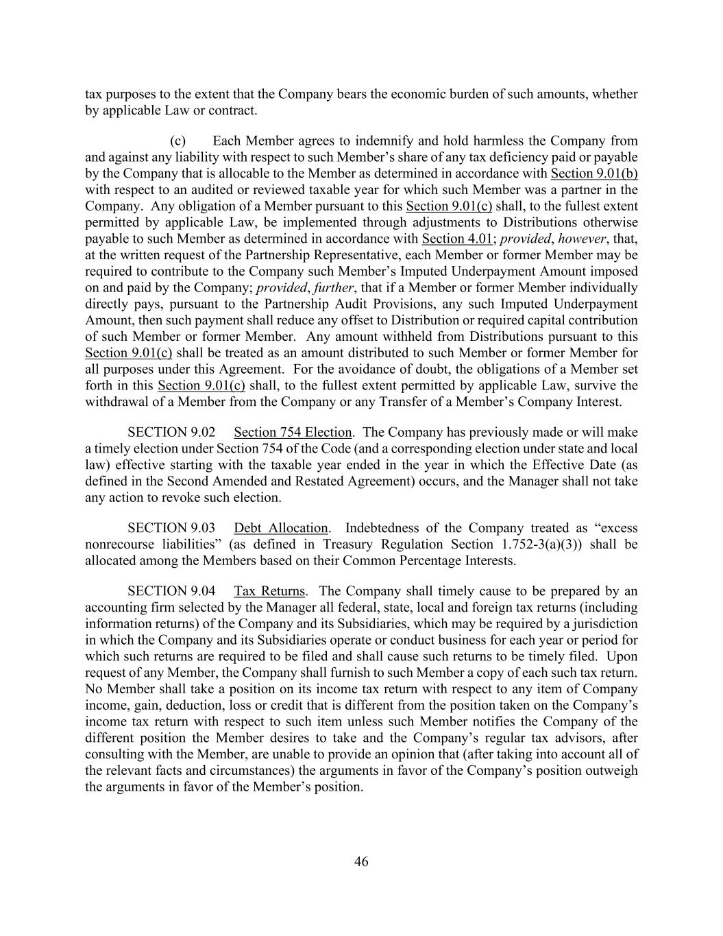 46 tax purposes to the extent that the Company bears the economic burden of such amounts, whether by applicable Law or contract. (c) Each Member agrees to indemnify and hold harmless the Company from and against any liability with respect to such Member’s share of any tax deficiency paid or payable by the Company that is allocable to the Member as determined in accordance with Section 9.01(b) with respect to an audited or reviewed taxable year for which such Member was a partner in the Company. Any obligation of a Member pursuant to this Section 9.01(c) shall, to the fullest extent permitted by applicable Law, be implemented through adjustments to Distributions otherwise payable to such Member as determined in accordance with Section 4.01; provided, however, that, at the written request of the Partnership Representative, each Member or former Member may be required to contribute to the Company such Member’s Imputed Underpayment Amount imposed on and paid by the Company; provided, further, that if a Member or former Member individually directly pays, pursuant to the Partnership Audit Provisions, any such Imputed Underpayment Amount, then such payment shall reduce any offset to Distribution or required capital contribution of such Member or former Member. Any amount withheld from Distributions pursuant to this Section 9.01(c) shall be treated as an amount distributed to such Member or former Member for all purposes under this Agreement. For the avoidance of doubt, the obligations of a Member set forth in this Section 9.01(c) shall, to the fullest extent permitted by applicable Law, survive the withdrawal of a Member from the Company or any Transfer of a Member’s Company Interest. SECTION 9.02 Section 754 Election. The Company has previously made or will make a timely election under Section 754 of the Code (and a corresponding election under state and local law) effective starting with the taxable year ended in the year in which the Effective Date (as defined in the Second Amended and Restated Agreement) occurs, and the Manager shall not take any action to revoke such election. SECTION 9.03 Debt Allocation. Indebtedness of the Company treated as “excess nonrecourse liabilities” (as defined in Treasury Regulation Section 1.752-3(a)(3)) shall be allocated among the Members based on their Common Percentage Interests. SECTION 9.04 Tax Returns. The Company shall timely cause to be prepared by an accounting firm selected by the Manager all federal, state, local and foreign tax returns (including information returns) of the Company and its Subsidiaries, which may be required by a jurisdiction in which the Company and its Subsidiaries operate or conduct business for each year or period for which such returns are required to be filed and shall cause such returns to be timely filed. Upon request of any Member, the Company shall furnish to such Member a copy of each such tax return. No Member shall take a position on its income tax return with respect to any item of Company income, gain, deduction, loss or credit that is different from the position taken on the Company’s income tax return with respect to such item unless such Member notifies the Company of the different position the Member desires to take and the Company’s regular tax advisors, after consulting with the Member, are unable to provide an opinion that (after taking into account all of the relevant facts and circumstances) the arguments in favor of the Company’s position outweigh the arguments in favor of the Member’s position.