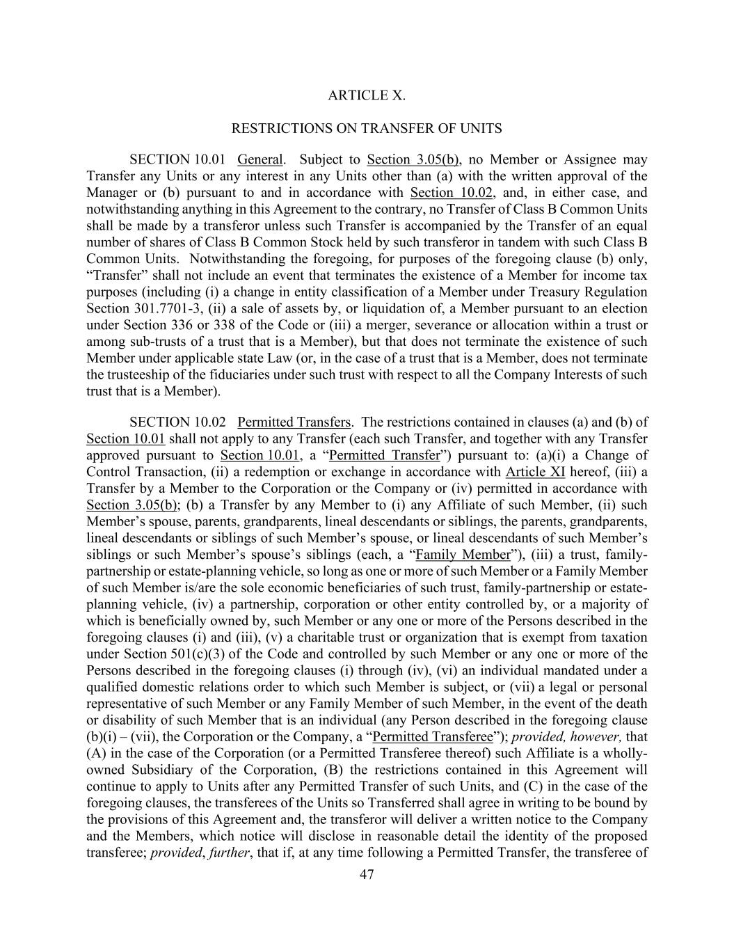 47 ARTICLE X. RESTRICTIONS ON TRANSFER OF UNITS SECTION 10.01 General. Subject to Section 3.05(b), no Member or Assignee may Transfer any Units or any interest in any Units other than (a) with the written approval of the Manager or (b) pursuant to and in accordance with Section 10.02, and, in either case, and notwithstanding anything in this Agreement to the contrary, no Transfer of Class B Common Units shall be made by a transferor unless such Transfer is accompanied by the Transfer of an equal number of shares of Class B Common Stock held by such transferor in tandem with such Class B Common Units. Notwithstanding the foregoing, for purposes of the foregoing clause (b) only, “Transfer” shall not include an event that terminates the existence of a Member for income tax purposes (including (i) a change in entity classification of a Member under Treasury Regulation Section 301.7701-3, (ii) a sale of assets by, or liquidation of, a Member pursuant to an election under Section 336 or 338 of the Code or (iii) a merger, severance or allocation within a trust or among sub-trusts of a trust that is a Member), but that does not terminate the existence of such Member under applicable state Law (or, in the case of a trust that is a Member, does not terminate the trusteeship of the fiduciaries under such trust with respect to all the Company Interests of such trust that is a Member). SECTION 10.02 Permitted Transfers. The restrictions contained in clauses (a) and (b) of Section 10.01 shall not apply to any Transfer (each such Transfer, and together with any Transfer approved pursuant to Section 10.01, a “Permitted Transfer”) pursuant to: (a)(i) a Change of Control Transaction, (ii) a redemption or exchange in accordance with Article XI hereof, (iii) a Transfer by a Member to the Corporation or the Company or (iv) permitted in accordance with Section 3.05(b); (b) a Transfer by any Member to (i) any Affiliate of such Member, (ii) such Member’s spouse, parents, grandparents, lineal descendants or siblings, the parents, grandparents, lineal descendants or siblings of such Member’s spouse, or lineal descendants of such Member’s siblings or such Member’s spouse’s siblings (each, a “Family Member”), (iii) a trust, family- partnership or estate-planning vehicle, so long as one or more of such Member or a Family Member of such Member is/are the sole economic beneficiaries of such trust, family-partnership or estate- planning vehicle, (iv) a partnership, corporation or other entity controlled by, or a majority of which is beneficially owned by, such Member or any one or more of the Persons described in the foregoing clauses (i) and (iii), (v) a charitable trust or organization that is exempt from taxation under Section 501(c)(3) of the Code and controlled by such Member or any one or more of the Persons described in the foregoing clauses (i) through (iv), (vi) an individual mandated under a qualified domestic relations order to which such Member is subject, or (vii) a legal or personal representative of such Member or any Family Member of such Member, in the event of the death or disability of such Member that is an individual (any Person described in the foregoing clause (b)(i) – (vii), the Corporation or the Company, a “Permitted Transferee”); provided, however, that (A) in the case of the Corporation (or a Permitted Transferee thereof) such Affiliate is a wholly- owned Subsidiary of the Corporation, (B) the restrictions contained in this Agreement will continue to apply to Units after any Permitted Transfer of such Units, and (C) in the case of the foregoing clauses, the transferees of the Units so Transferred shall agree in writing to be bound by the provisions of this Agreement and, the transferor will deliver a written notice to the Company and the Members, which notice will disclose in reasonable detail the identity of the proposed transferee; provided, further, that if, at any time following a Permitted Transfer, the transferee of