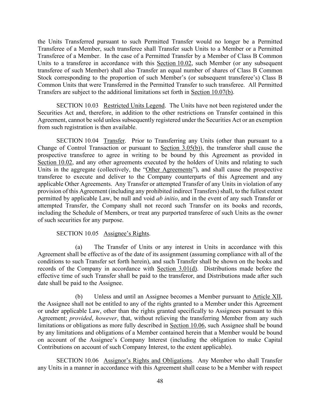 48 the Units Transferred pursuant to such Permitted Transfer would no longer be a Permitted Transferee of a Member, such transferee shall Transfer such Units to a Member or a Permitted Transferee of a Member. In the case of a Permitted Transfer by a Member of Class B Common Units to a transferee in accordance with this Section 10.02, such Member (or any subsequent transferee of such Member) shall also Transfer an equal number of shares of Class B Common Stock corresponding to the proportion of such Member’s (or subsequent transferee’s) Class B Common Units that were Transferred in the Permitted Transfer to such transferee. All Permitted Transfers are subject to the additional limitations set forth in Section 10.07(b). SECTION 10.03 Restricted Units Legend. The Units have not been registered under the Securities Act and, therefore, in addition to the other restrictions on Transfer contained in this Agreement, cannot be sold unless subsequently registered under the Securities Act or an exemption from such registration is then available. SECTION 10.04 Transfer. Prior to Transferring any Units (other than pursuant to a Change of Control Transaction or pursuant to Section 3.05(b)), the transferor shall cause the prospective transferee to agree in writing to be bound by this Agreement as provided in Section 10.02, and any other agreements executed by the holders of Units and relating to such Units in the aggregate (collectively, the “Other Agreements”), and shall cause the prospective transferee to execute and deliver to the Company counterparts of this Agreement and any applicable Other Agreements. Any Transfer or attempted Transfer of any Units in violation of any provision of this Agreement (including any prohibited indirect Transfers) shall, to the fullest extent permitted by applicable Law, be null and void ab initio, and in the event of any such Transfer or attempted Transfer, the Company shall not record such Transfer on its books and records, including the Schedule of Members, or treat any purported transferee of such Units as the owner of such securities for any purpose. SECTION 10.05 Assignee’s Rights. (a) The Transfer of Units or any interest in Units in accordance with this Agreement shall be effective as of the date of its assignment (assuming compliance with all of the conditions to such Transfer set forth herein), and such Transfer shall be shown on the books and records of the Company in accordance with Section 3.01(d). Distributions made before the effective time of such Transfer shall be paid to the transferor, and Distributions made after such date shall be paid to the Assignee. (b) Unless and until an Assignee becomes a Member pursuant to Article XII, the Assignee shall not be entitled to any of the rights granted to a Member under this Agreement or under applicable Law, other than the rights granted specifically to Assignees pursuant to this Agreement; provided, however, that, without relieving the transferring Member from any such limitations or obligations as more fully described in Section 10.06, such Assignee shall be bound by any limitations and obligations of a Member contained herein that a Member would be bound on account of the Assignee’s Company Interest (including the obligation to make Capital Contributions on account of such Company Interest, to the extent applicable). SECTION 10.06 Assignor’s Rights and Obligations. Any Member who shall Transfer any Units in a manner in accordance with this Agreement shall cease to be a Member with respect