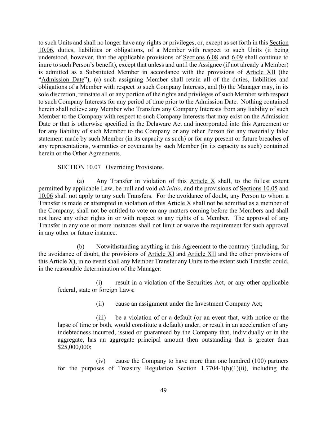 49 to such Units and shall no longer have any rights or privileges, or, except as set forth in this Section 10.06, duties, liabilities or obligations, of a Member with respect to such Units (it being understood, however, that the applicable provisions of Sections 6.08 and 6.09 shall continue to inure to such Person’s benefit), except that unless and until the Assignee (if not already a Member) is admitted as a Substituted Member in accordance with the provisions of Article XII (the “Admission Date”), (a) such assigning Member shall retain all of the duties, liabilities and obligations of a Member with respect to such Company Interests, and (b) the Manager may, in its sole discretion, reinstate all or any portion of the rights and privileges of such Member with respect to such Company Interests for any period of time prior to the Admission Date. Nothing contained herein shall relieve any Member who Transfers any Company Interests from any liability of such Member to the Company with respect to such Company Interests that may exist on the Admission Date or that is otherwise specified in the Delaware Act and incorporated into this Agreement or for any liability of such Member to the Company or any other Person for any materially false statement made by such Member (in its capacity as such) or for any present or future breaches of any representations, warranties or covenants by such Member (in its capacity as such) contained herein or the Other Agreements. SECTION 10.07 Overriding Provisions. (a) Any Transfer in violation of this Article X shall, to the fullest extent permitted by applicable Law, be null and void ab initio, and the provisions of Sections 10.05 and 10.06 shall not apply to any such Transfers. For the avoidance of doubt, any Person to whom a Transfer is made or attempted in violation of this Article X shall not be admitted as a member of the Company, shall not be entitled to vote on any matters coming before the Members and shall not have any other rights in or with respect to any rights of a Member. The approval of any Transfer in any one or more instances shall not limit or waive the requirement for such approval in any other or future instance. (b) Notwithstanding anything in this Agreement to the contrary (including, for the avoidance of doubt, the provisions of Article XI and Article XII and the other provisions of this Article X), in no event shall any Member Transfer any Units to the extent such Transfer could, in the reasonable determination of the Manager: (i) result in a violation of the Securities Act, or any other applicable federal, state or foreign Laws; (ii) cause an assignment under the Investment Company Act; (iii) be a violation of or a default (or an event that, with notice or the lapse of time or both, would constitute a default) under, or result in an acceleration of any indebtedness incurred, issued or guaranteed by the Company that, individually or in the aggregate, has an aggregate principal amount then outstanding that is greater than $25,000,000; (iv) cause the Company to have more than one hundred (100) partners for the purposes of Treasury Regulation Section 1.7704-1(h)(1)(ii), including the
