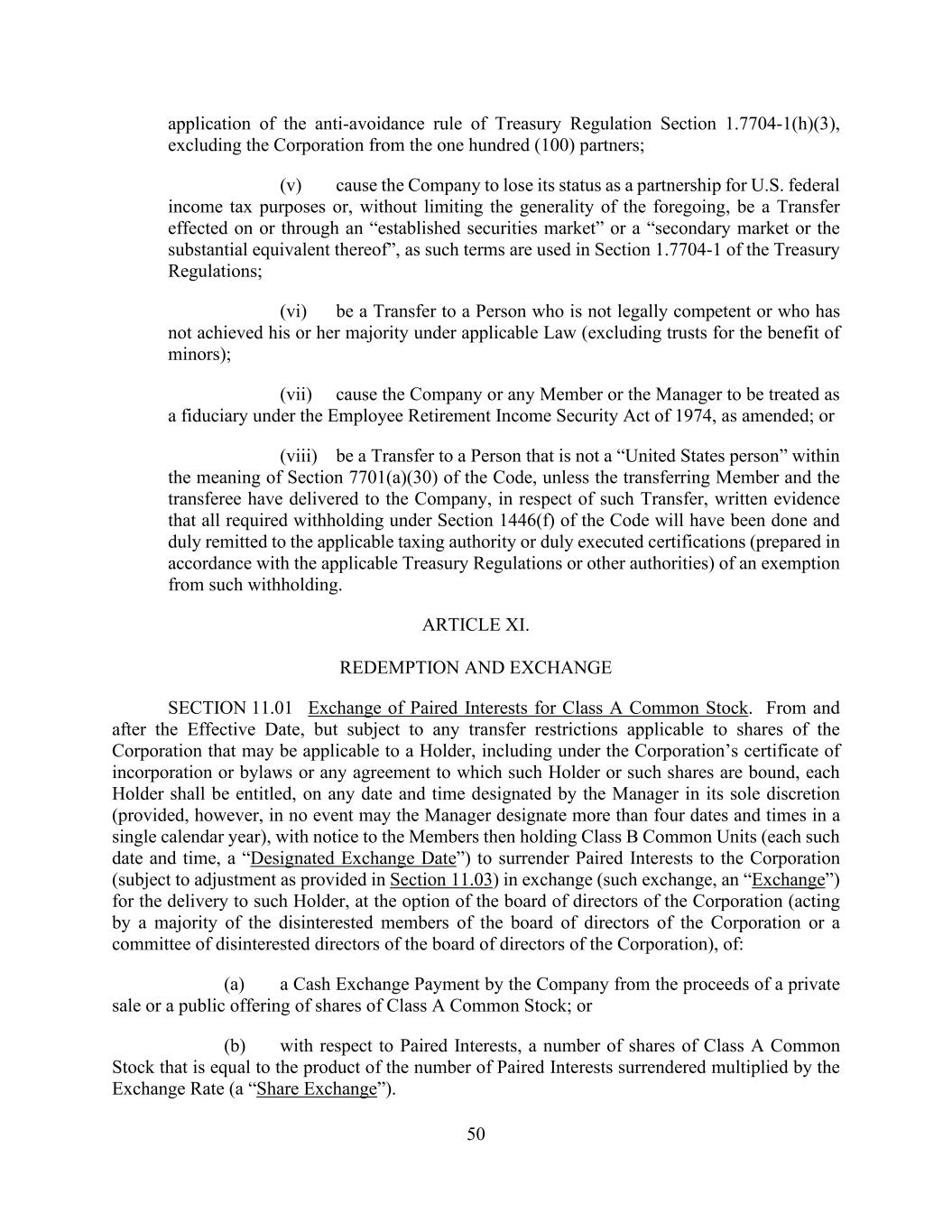 50 application of the anti-avoidance rule of Treasury Regulation Section 1.7704-1(h)(3), excluding the Corporation from the one hundred (100) partners; (v) cause the Company to lose its status as a partnership for U.S. federal income tax purposes or, without limiting the generality of the foregoing, be a Transfer effected on or through an “established securities market” or a “secondary market or the substantial equivalent thereof”, as such terms are used in Section 1.7704-1 of the Treasury Regulations; (vi) be a Transfer to a Person who is not legally competent or who has not achieved his or her majority under applicable Law (excluding trusts for the benefit of minors); (vii) cause the Company or any Member or the Manager to be treated as a fiduciary under the Employee Retirement Income Security Act of 1974, as amended; or (viii) be a Transfer to a Person that is not a “United States person” within the meaning of Section 7701(a)(30) of the Code, unless the transferring Member and the transferee have delivered to the Company, in respect of such Transfer, written evidence that all required withholding under Section 1446(f) of the Code will have been done and duly remitted to the applicable taxing authority or duly executed certifications (prepared in accordance with the applicable Treasury Regulations or other authorities) of an exemption from such withholding. ARTICLE XI. REDEMPTION AND EXCHANGE SECTION 11.01 Exchange of Paired Interests for Class A Common Stock. From and after the Effective Date, but subject to any transfer restrictions applicable to shares of the Corporation that may be applicable to a Holder, including under the Corporation’s certificate of incorporation or bylaws or any agreement to which such Holder or such shares are bound, each Holder shall be entitled, on any date and time designated by the Manager in its sole discretion (provided, however, in no event may the Manager designate more than four dates and times in a single calendar year), with notice to the Members then holding Class B Common Units (each such date and time, a “Designated Exchange Date”) to surrender Paired Interests to the Corporation (subject to adjustment as provided in Section 11.03) in exchange (such exchange, an “Exchange”) for the delivery to such Holder, at the option of the board of directors of the Corporation (acting by a majority of the disinterested members of the board of directors of the Corporation or a committee of disinterested directors of the board of directors of the Corporation), of: (a) a Cash Exchange Payment by the Company from the proceeds of a private sale or a public offering of shares of Class A Common Stock; or (b) with respect to Paired Interests, a number of shares of Class A Common Stock that is equal to the product of the number of Paired Interests surrendered multiplied by the Exchange Rate (a “Share Exchange”).