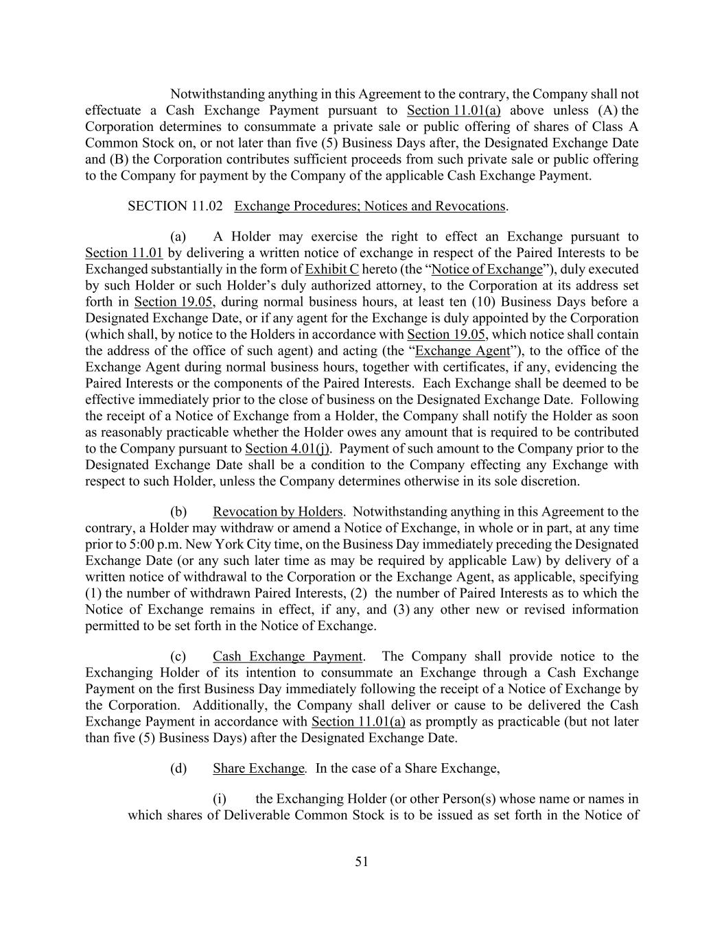 51 Notwithstanding anything in this Agreement to the contrary, the Company shall not effectuate a Cash Exchange Payment pursuant to Section 11.01(a) above unless (A) the Corporation determines to consummate a private sale or public offering of shares of Class A Common Stock on, or not later than five (5) Business Days after, the Designated Exchange Date and (B) the Corporation contributes sufficient proceeds from such private sale or public offering to the Company for payment by the Company of the applicable Cash Exchange Payment. SECTION 11.02 Exchange Procedures; Notices and Revocations. (a) A Holder may exercise the right to effect an Exchange pursuant to Section 11.01 by delivering a written notice of exchange in respect of the Paired Interests to be Exchanged substantially in the form of Exhibit C hereto (the “Notice of Exchange”), duly executed by such Holder or such Holder’s duly authorized attorney, to the Corporation at its address set forth in Section 19.05, during normal business hours, at least ten (10) Business Days before a Designated Exchange Date, or if any agent for the Exchange is duly appointed by the Corporation (which shall, by notice to the Holders in accordance with Section 19.05, which notice shall contain the address of the office of such agent) and acting (the “Exchange Agent”), to the office of the Exchange Agent during normal business hours, together with certificates, if any, evidencing the Paired Interests or the components of the Paired Interests. Each Exchange shall be deemed to be effective immediately prior to the close of business on the Designated Exchange Date. Following the receipt of a Notice of Exchange from a Holder, the Company shall notify the Holder as soon as reasonably practicable whether the Holder owes any amount that is required to be contributed to the Company pursuant to Section 4.01(j). Payment of such amount to the Company prior to the Designated Exchange Date shall be a condition to the Company effecting any Exchange with respect to such Holder, unless the Company determines otherwise in its sole discretion. (b) Revocation by Holders. Notwithstanding anything in this Agreement to the contrary, a Holder may withdraw or amend a Notice of Exchange, in whole or in part, at any time prior to 5:00 p.m. New York City time, on the Business Day immediately preceding the Designated Exchange Date (or any such later time as may be required by applicable Law) by delivery of a written notice of withdrawal to the Corporation or the Exchange Agent, as applicable, specifying (1) the number of withdrawn Paired Interests, (2) the number of Paired Interests as to which the Notice of Exchange remains in effect, if any, and (3) any other new or revised information permitted to be set forth in the Notice of Exchange. (c) Cash Exchange Payment. The Company shall provide notice to the Exchanging Holder of its intention to consummate an Exchange through a Cash Exchange Payment on the first Business Day immediately following the receipt of a Notice of Exchange by the Corporation. Additionally, the Company shall deliver or cause to be delivered the Cash Exchange Payment in accordance with Section 11.01(a) as promptly as practicable (but not later than five (5) Business Days) after the Designated Exchange Date. (d) Share Exchange. In the case of a Share Exchange, (i) the Exchanging Holder (or other Person(s) whose name or names in which shares of Deliverable Common Stock is to be issued as set forth in the Notice of