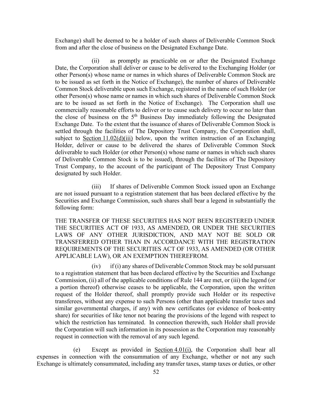 52 Exchange) shall be deemed to be a holder of such shares of Deliverable Common Stock from and after the close of business on the Designated Exchange Date. (ii) as promptly as practicable on or after the Designated Exchange Date, the Corporation shall deliver or cause to be delivered to the Exchanging Holder (or other Person(s) whose name or names in which shares of Deliverable Common Stock are to be issued as set forth in the Notice of Exchange), the number of shares of Deliverable Common Stock deliverable upon such Exchange, registered in the name of such Holder (or other Person(s) whose name or names in which such shares of Deliverable Common Stock are to be issued as set forth in the Notice of Exchange). The Corporation shall use commercially reasonable efforts to deliver or to cause such delivery to occur no later than the close of business on the 5th Business Day immediately following the Designated Exchange Date. To the extent that the issuance of shares of Deliverable Common Stock is settled through the facilities of The Depository Trust Company, the Corporation shall, subject to Section 11.02(d)(iii) below, upon the written instruction of an Exchanging Holder, deliver or cause to be delivered the shares of Deliverable Common Stock deliverable to such Holder (or other Person(s) whose name or names in which such shares of Deliverable Common Stock is to be issued), through the facilities of The Depository Trust Company, to the account of the participant of The Depository Trust Company designated by such Holder. (iii) If shares of Deliverable Common Stock issued upon an Exchange are not issued pursuant to a registration statement that has been declared effective by the Securities and Exchange Commission, such shares shall bear a legend in substantially the following form: THE TRANSFER OF THESE SECURITIES HAS NOT BEEN REGISTERED UNDER THE SECURITIES ACT OF 1933, AS AMENDED, OR UNDER THE SECURITIES LAWS OF ANY OTHER JURISDICTION, AND MAY NOT BE SOLD OR TRANSFERRED OTHER THAN IN ACCORDANCE WITH THE REGISTRATION REQUIREMENTS OF THE SECURITIES ACT OF 1933, AS AMENDED (OR OTHER APPLICABLE LAW), OR AN EXEMPTION THEREFROM. (iv) if (i) any shares of Deliverable Common Stock may be sold pursuant to a registration statement that has been declared effective by the Securities and Exchange Commission, (ii) all of the applicable conditions of Rule 144 are met, or (iii) the legend (or a portion thereof) otherwise ceases to be applicable, the Corporation, upon the written request of the Holder thereof, shall promptly provide such Holder or its respective transferees, without any expense to such Persons (other than applicable transfer taxes and similar governmental charges, if any) with new certificates (or evidence of book-entry share) for securities of like tenor not bearing the provisions of the legend with respect to which the restriction has terminated. In connection therewith, such Holder shall provide the Corporation will such information in its possession as the Corporation may reasonably request in connection with the removal of any such legend. (e) Except as provided in Section 4.01(i), the Corporation shall bear all expenses in connection with the consummation of any Exchange, whether or not any such Exchange is ultimately consummated, including any transfer taxes, stamp taxes or duties, or other