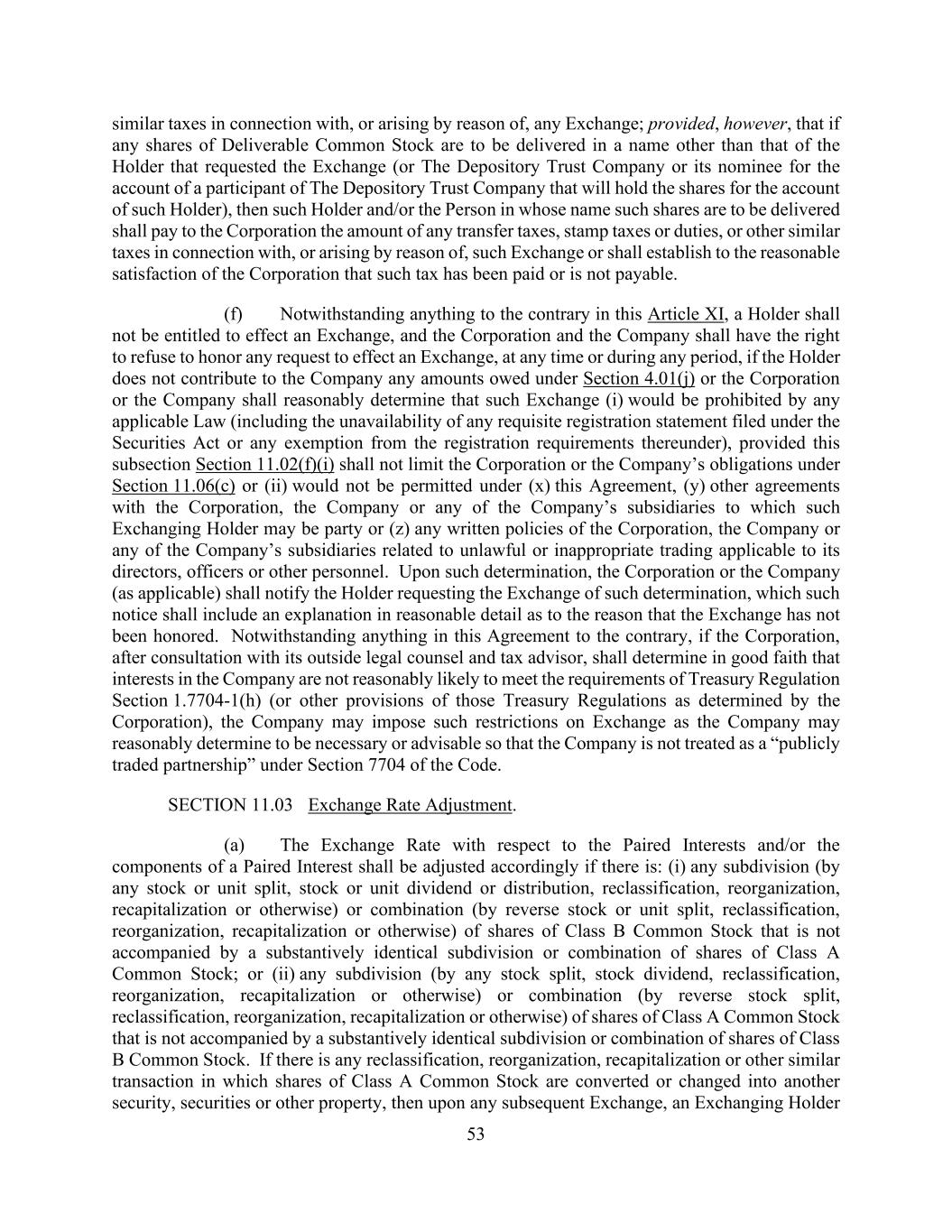 53 similar taxes in connection with, or arising by reason of, any Exchange; provided, however, that if any shares of Deliverable Common Stock are to be delivered in a name other than that of the Holder that requested the Exchange (or The Depository Trust Company or its nominee for the account of a participant of The Depository Trust Company that will hold the shares for the account of such Holder), then such Holder and/or the Person in whose name such shares are to be delivered shall pay to the Corporation the amount of any transfer taxes, stamp taxes or duties, or other similar taxes in connection with, or arising by reason of, such Exchange or shall establish to the reasonable satisfaction of the Corporation that such tax has been paid or is not payable. (f) Notwithstanding anything to the contrary in this Article XI, a Holder shall not be entitled to effect an Exchange, and the Corporation and the Company shall have the right to refuse to honor any request to effect an Exchange, at any time or during any period, if the Holder does not contribute to the Company any amounts owed under Section 4.01(j) or the Corporation or the Company shall reasonably determine that such Exchange (i) would be prohibited by any applicable Law (including the unavailability of any requisite registration statement filed under the Securities Act or any exemption from the registration requirements thereunder), provided this subsection Section 11.02(f)(i) shall not limit the Corporation or the Company’s obligations under Section 11.06(c) or (ii) would not be permitted under (x) this Agreement, (y) other agreements with the Corporation, the Company or any of the Company’s subsidiaries to which such Exchanging Holder may be party or (z) any written policies of the Corporation, the Company or any of the Company’s subsidiaries related to unlawful or inappropriate trading applicable to its directors, officers or other personnel. Upon such determination, the Corporation or the Company (as applicable) shall notify the Holder requesting the Exchange of such determination, which such notice shall include an explanation in reasonable detail as to the reason that the Exchange has not been honored. Notwithstanding anything in this Agreement to the contrary, if the Corporation, after consultation with its outside legal counsel and tax advisor, shall determine in good faith that interests in the Company are not reasonably likely to meet the requirements of Treasury Regulation Section 1.7704-1(h) (or other provisions of those Treasury Regulations as determined by the Corporation), the Company may impose such restrictions on Exchange as the Company may reasonably determine to be necessary or advisable so that the Company is not treated as a “publicly traded partnership” under Section 7704 of the Code. SECTION 11.03 Exchange Rate Adjustment. (a) The Exchange Rate with respect to the Paired Interests and/or the components of a Paired Interest shall be adjusted accordingly if there is: (i) any subdivision (by any stock or unit split, stock or unit dividend or distribution, reclassification, reorganization, recapitalization or otherwise) or combination (by reverse stock or unit split, reclassification, reorganization, recapitalization or otherwise) of shares of Class B Common Stock that is not accompanied by a substantively identical subdivision or combination of shares of Class A Common Stock; or (ii) any subdivision (by any stock split, stock dividend, reclassification, reorganization, recapitalization or otherwise) or combination (by reverse stock split, reclassification, reorganization, recapitalization or otherwise) of shares of Class A Common Stock that is not accompanied by a substantively identical subdivision or combination of shares of Class B Common Stock. If there is any reclassification, reorganization, recapitalization or other similar transaction in which shares of Class A Common Stock are converted or changed into another security, securities or other property, then upon any subsequent Exchange, an Exchanging Holder