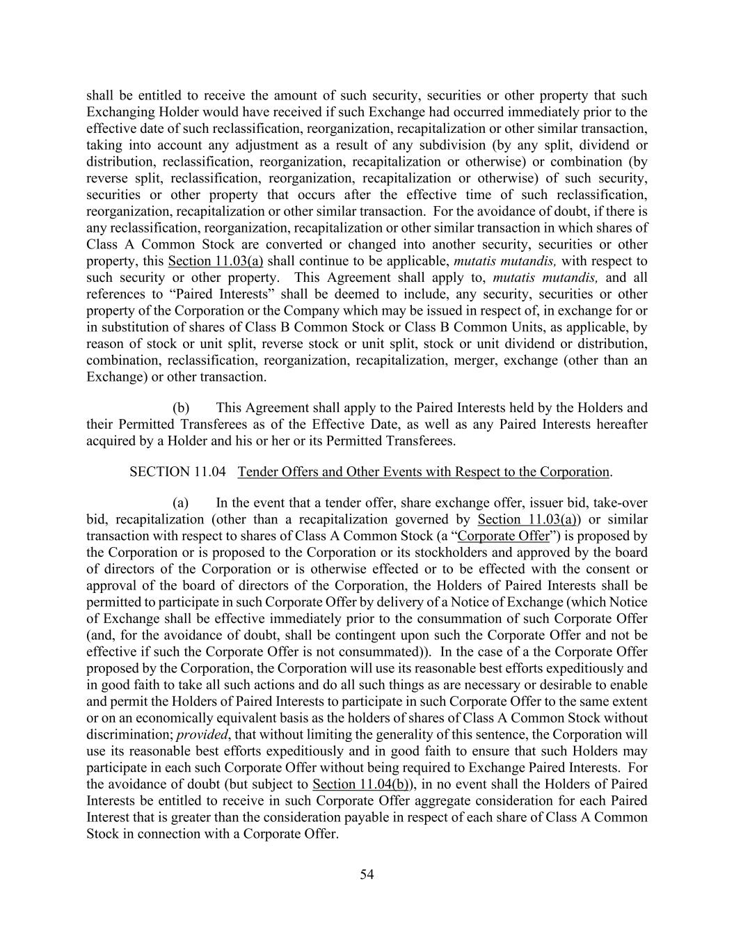 54 shall be entitled to receive the amount of such security, securities or other property that such Exchanging Holder would have received if such Exchange had occurred immediately prior to the effective date of such reclassification, reorganization, recapitalization or other similar transaction, taking into account any adjustment as a result of any subdivision (by any split, dividend or distribution, reclassification, reorganization, recapitalization or otherwise) or combination (by reverse split, reclassification, reorganization, recapitalization or otherwise) of such security, securities or other property that occurs after the effective time of such reclassification, reorganization, recapitalization or other similar transaction. For the avoidance of doubt, if there is any reclassification, reorganization, recapitalization or other similar transaction in which shares of Class A Common Stock are converted or changed into another security, securities or other property, this Section 11.03(a) shall continue to be applicable, mutatis mutandis, with respect to such security or other property. This Agreement shall apply to, mutatis mutandis, and all references to “Paired Interests” shall be deemed to include, any security, securities or other property of the Corporation or the Company which may be issued in respect of, in exchange for or in substitution of shares of Class B Common Stock or Class B Common Units, as applicable, by reason of stock or unit split, reverse stock or unit split, stock or unit dividend or distribution, combination, reclassification, reorganization, recapitalization, merger, exchange (other than an Exchange) or other transaction. (b) This Agreement shall apply to the Paired Interests held by the Holders and their Permitted Transferees as of the Effective Date, as well as any Paired Interests hereafter acquired by a Holder and his or her or its Permitted Transferees. SECTION 11.04 Tender Offers and Other Events with Respect to the Corporation. (a) In the event that a tender offer, share exchange offer, issuer bid, take-over bid, recapitalization (other than a recapitalization governed by Section 11.03(a)) or similar transaction with respect to shares of Class A Common Stock (a “Corporate Offer”) is proposed by the Corporation or is proposed to the Corporation or its stockholders and approved by the board of directors of the Corporation or is otherwise effected or to be effected with the consent or approval of the board of directors of the Corporation, the Holders of Paired Interests shall be permitted to participate in such Corporate Offer by delivery of a Notice of Exchange (which Notice of Exchange shall be effective immediately prior to the consummation of such Corporate Offer (and, for the avoidance of doubt, shall be contingent upon such the Corporate Offer and not be effective if such the Corporate Offer is not consummated)). In the case of a the Corporate Offer proposed by the Corporation, the Corporation will use its reasonable best efforts expeditiously and in good faith to take all such actions and do all such things as are necessary or desirable to enable and permit the Holders of Paired Interests to participate in such Corporate Offer to the same extent or on an economically equivalent basis as the holders of shares of Class A Common Stock without discrimination; provided, that without limiting the generality of this sentence, the Corporation will use its reasonable best efforts expeditiously and in good faith to ensure that such Holders may participate in each such Corporate Offer without being required to Exchange Paired Interests. For the avoidance of doubt (but subject to Section 11.04(b)), in no event shall the Holders of Paired Interests be entitled to receive in such Corporate Offer aggregate consideration for each Paired Interest that is greater than the consideration payable in respect of each share of Class A Common Stock in connection with a Corporate Offer.