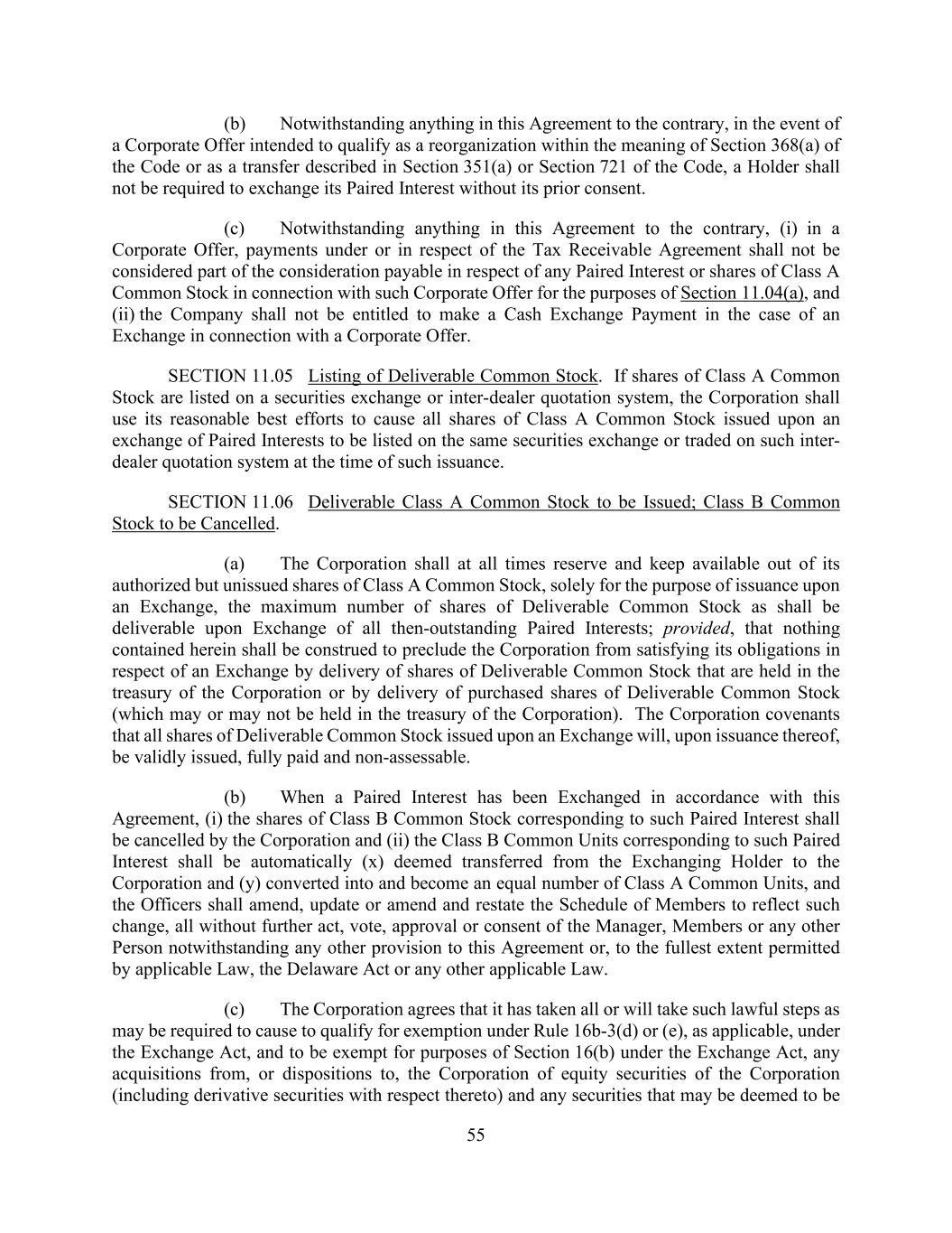 55 (b) Notwithstanding anything in this Agreement to the contrary, in the event of a Corporate Offer intended to qualify as a reorganization within the meaning of Section 368(a) of the Code or as a transfer described in Section 351(a) or Section 721 of the Code, a Holder shall not be required to exchange its Paired Interest without its prior consent. (c) Notwithstanding anything in this Agreement to the contrary, (i) in a Corporate Offer, payments under or in respect of the Tax Receivable Agreement shall not be considered part of the consideration payable in respect of any Paired Interest or shares of Class A Common Stock in connection with such Corporate Offer for the purposes of Section 11.04(a), and (ii) the Company shall not be entitled to make a Cash Exchange Payment in the case of an Exchange in connection with a Corporate Offer. SECTION 11.05 Listing of Deliverable Common Stock. If shares of Class A Common Stock are listed on a securities exchange or inter-dealer quotation system, the Corporation shall use its reasonable best efforts to cause all shares of Class A Common Stock issued upon an exchange of Paired Interests to be listed on the same securities exchange or traded on such inter- dealer quotation system at the time of such issuance. SECTION 11.06 Deliverable Class A Common Stock to be Issued; Class B Common Stock to be Cancelled. (a) The Corporation shall at all times reserve and keep available out of its authorized but unissued shares of Class A Common Stock, solely for the purpose of issuance upon an Exchange, the maximum number of shares of Deliverable Common Stock as shall be deliverable upon Exchange of all then-outstanding Paired Interests; provided, that nothing contained herein shall be construed to preclude the Corporation from satisfying its obligations in respect of an Exchange by delivery of shares of Deliverable Common Stock that are held in the treasury of the Corporation or by delivery of purchased shares of Deliverable Common Stock (which may or may not be held in the treasury of the Corporation). The Corporation covenants that all shares of Deliverable Common Stock issued upon an Exchange will, upon issuance thereof, be validly issued, fully paid and non-assessable. (b) When a Paired Interest has been Exchanged in accordance with this Agreement, (i) the shares of Class B Common Stock corresponding to such Paired Interest shall be cancelled by the Corporation and (ii) the Class B Common Units corresponding to such Paired Interest shall be automatically (x) deemed transferred from the Exchanging Holder to the Corporation and (y) converted into and become an equal number of Class A Common Units, and the Officers shall amend, update or amend and restate the Schedule of Members to reflect such change, all without further act, vote, approval or consent of the Manager, Members or any other Person notwithstanding any other provision to this Agreement or, to the fullest extent permitted by applicable Law, the Delaware Act or any other applicable Law. (c) The Corporation agrees that it has taken all or will take such lawful steps as may be required to cause to qualify for exemption under Rule 16b-3(d) or (e), as applicable, under the Exchange Act, and to be exempt for purposes of Section 16(b) under the Exchange Act, any acquisitions from, or dispositions to, the Corporation of equity securities of the Corporation (including derivative securities with respect thereto) and any securities that may be deemed to be