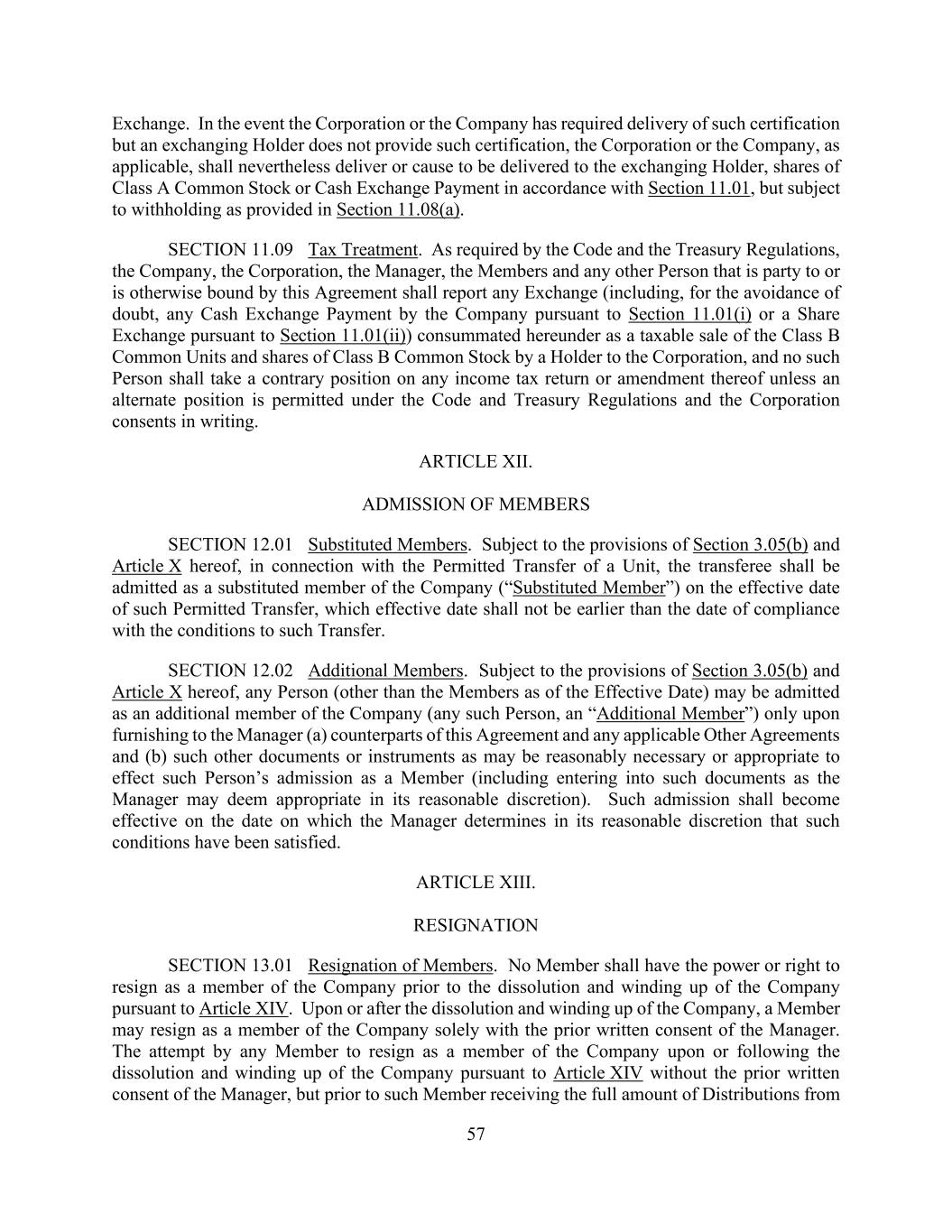 57 Exchange. In the event the Corporation or the Company has required delivery of such certification but an exchanging Holder does not provide such certification, the Corporation or the Company, as applicable, shall nevertheless deliver or cause to be delivered to the exchanging Holder, shares of Class A Common Stock or Cash Exchange Payment in accordance with Section 11.01, but subject to withholding as provided in Section 11.08(a). SECTION 11.09 Tax Treatment. As required by the Code and the Treasury Regulations, the Company, the Corporation, the Manager, the Members and any other Person that is party to or is otherwise bound by this Agreement shall report any Exchange (including, for the avoidance of doubt, any Cash Exchange Payment by the Company pursuant to Section 11.01(i) or a Share Exchange pursuant to Section 11.01(ii)) consummated hereunder as a taxable sale of the Class B Common Units and shares of Class B Common Stock by a Holder to the Corporation, and no such Person shall take a contrary position on any income tax return or amendment thereof unless an alternate position is permitted under the Code and Treasury Regulations and the Corporation consents in writing. ARTICLE XII. ADMISSION OF MEMBERS SECTION 12.01 Substituted Members. Subject to the provisions of Section 3.05(b) and Article X hereof, in connection with the Permitted Transfer of a Unit, the transferee shall be admitted as a substituted member of the Company (“Substituted Member”) on the effective date of such Permitted Transfer, which effective date shall not be earlier than the date of compliance with the conditions to such Transfer. SECTION 12.02 Additional Members. Subject to the provisions of Section 3.05(b) and Article X hereof, any Person (other than the Members as of the Effective Date) may be admitted as an additional member of the Company (any such Person, an “Additional Member”) only upon furnishing to the Manager (a) counterparts of this Agreement and any applicable Other Agreements and (b) such other documents or instruments as may be reasonably necessary or appropriate to effect such Person’s admission as a Member (including entering into such documents as the Manager may deem appropriate in its reasonable discretion). Such admission shall become effective on the date on which the Manager determines in its reasonable discretion that such conditions have been satisfied. ARTICLE XIII. RESIGNATION SECTION 13.01 Resignation of Members. No Member shall have the power or right to resign as a member of the Company prior to the dissolution and winding up of the Company pursuant to Article XIV. Upon or after the dissolution and winding up of the Company, a Member may resign as a member of the Company solely with the prior written consent of the Manager. The attempt by any Member to resign as a member of the Company upon or following the dissolution and winding up of the Company pursuant to Article XIV without the prior written consent of the Manager, but prior to such Member receiving the full amount of Distributions from