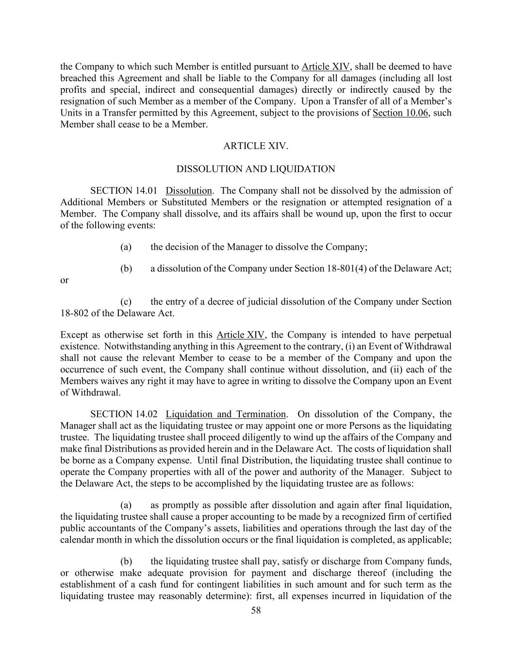 58 the Company to which such Member is entitled pursuant to Article XIV, shall be deemed to have breached this Agreement and shall be liable to the Company for all damages (including all lost profits and special, indirect and consequential damages) directly or indirectly caused by the resignation of such Member as a member of the Company. Upon a Transfer of all of a Member’s Units in a Transfer permitted by this Agreement, subject to the provisions of Section 10.06, such Member shall cease to be a Member. ARTICLE XIV. DISSOLUTION AND LIQUIDATION SECTION 14.01 Dissolution. The Company shall not be dissolved by the admission of Additional Members or Substituted Members or the resignation or attempted resignation of a Member. The Company shall dissolve, and its affairs shall be wound up, upon the first to occur of the following events: (a) the decision of the Manager to dissolve the Company; (b) a dissolution of the Company under Section 18-801(4) of the Delaware Act; or (c) the entry of a decree of judicial dissolution of the Company under Section 18-802 of the Delaware Act. Except as otherwise set forth in this Article XIV, the Company is intended to have perpetual existence. Notwithstanding anything in this Agreement to the contrary, (i) an Event of Withdrawal shall not cause the relevant Member to cease to be a member of the Company and upon the occurrence of such event, the Company shall continue without dissolution, and (ii) each of the Members waives any right it may have to agree in writing to dissolve the Company upon an Event of Withdrawal. SECTION 14.02 Liquidation and Termination. On dissolution of the Company, the Manager shall act as the liquidating trustee or may appoint one or more Persons as the liquidating trustee. The liquidating trustee shall proceed diligently to wind up the affairs of the Company and make final Distributions as provided herein and in the Delaware Act. The costs of liquidation shall be borne as a Company expense. Until final Distribution, the liquidating trustee shall continue to operate the Company properties with all of the power and authority of the Manager. Subject to the Delaware Act, the steps to be accomplished by the liquidating trustee are as follows: (a) as promptly as possible after dissolution and again after final liquidation, the liquidating trustee shall cause a proper accounting to be made by a recognized firm of certified public accountants of the Company’s assets, liabilities and operations through the last day of the calendar month in which the dissolution occurs or the final liquidation is completed, as applicable; (b) the liquidating trustee shall pay, satisfy or discharge from Company funds, or otherwise make adequate provision for payment and discharge thereof (including the establishment of a cash fund for contingent liabilities in such amount and for such term as the liquidating trustee may reasonably determine): first, all expenses incurred in liquidation of the