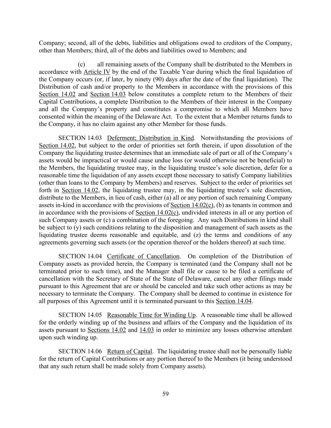 59 Company; second, all of the debts, liabilities and obligations owed to creditors of the Company, other than Members; third, all of the debts and liabilities owed to Members; and (c) all remaining assets of the Company shall be distributed to the Members in accordance with Article IV by the end of the Taxable Year during which the final liquidation of the Company occurs (or, if later, by ninety (90) days after the date of the final liquidation). The Distribution of cash and/or property to the Members in accordance with the provisions of this Section 14.02 and Section 14.03 below constitutes a complete return to the Members of their Capital Contributions, a complete Distribution to the Members of their interest in the Company and all the Company’s property and constitutes a compromise to which all Members have consented within the meaning of the Delaware Act. To the extent that a Member returns funds to the Company, it has no claim against any other Member for those funds. SECTION 14.03 Deferment; Distribution in Kind. Notwithstanding the provisions of Section 14.02, but subject to the order of priorities set forth therein, if upon dissolution of the Company the liquidating trustee determines that an immediate sale of part or all of the Company’s assets would be impractical or would cause undue loss (or would otherwise not be beneficial) to the Members, the liquidating trustee may, in the liquidating trustee’s sole discretion, defer for a reasonable time the liquidation of any assets except those necessary to satisfy Company liabilities (other than loans to the Company by Members) and reserves. Subject to the order of priorities set forth in Section 14.02, the liquidating trustee may, in the liquidating trustee’s sole discretion, distribute to the Members, in lieu of cash, either (a) all or any portion of such remaining Company assets in-kind in accordance with the provisions of Section 14.02(c), (b) as tenants in common and in accordance with the provisions of Section 14.02(c), undivided interests in all or any portion of such Company assets or (c) a combination of the foregoing. Any such Distributions in kind shall be subject to (y) such conditions relating to the disposition and management of such assets as the liquidating trustee deems reasonable and equitable, and (z) the terms and conditions of any agreements governing such assets (or the operation thereof or the holders thereof) at such time. SECTION 14.04 Certificate of Cancellation. On completion of the Distribution of Company assets as provided herein, the Company is terminated (and the Company shall not be terminated prior to such time), and the Manager shall file or cause to be filed a certificate of cancellation with the Secretary of State of the State of Delaware, cancel any other filings made pursuant to this Agreement that are or should be canceled and take such other actions as may be necessary to terminate the Company. The Company shall be deemed to continue in existence for all purposes of this Agreement until it is terminated pursuant to this Section 14.04. SECTION 14.05 Reasonable Time for Winding Up. A reasonable time shall be allowed for the orderly winding up of the business and affairs of the Company and the liquidation of its assets pursuant to Sections 14.02 and 14.03 in order to minimize any losses otherwise attendant upon such winding up. SECTION 14.06 Return of Capital. The liquidating trustee shall not be personally liable for the return of Capital Contributions or any portion thereof to the Members (it being understood that any such return shall be made solely from Company assets).