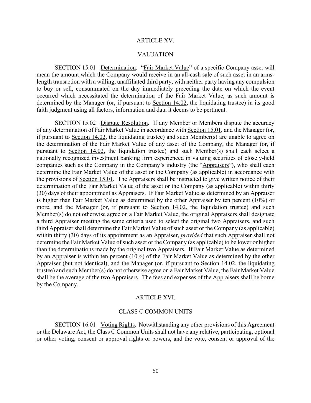 60 ARTICLE XV. VALUATION SECTION 15.01 Determination. “Fair Market Value” of a specific Company asset will mean the amount which the Company would receive in an all-cash sale of such asset in an arms- length transaction with a willing, unaffiliated third party, with neither party having any compulsion to buy or sell, consummated on the day immediately preceding the date on which the event occurred which necessitated the determination of the Fair Market Value, as such amount is determined by the Manager (or, if pursuant to Section 14.02, the liquidating trustee) in its good faith judgment using all factors, information and data it deems to be pertinent. SECTION 15.02 Dispute Resolution. If any Member or Members dispute the accuracy of any determination of Fair Market Value in accordance with Section 15.01, and the Manager (or, if pursuant to Section 14.02, the liquidating trustee) and such Member(s) are unable to agree on the determination of the Fair Market Value of any asset of the Company, the Manager (or, if pursuant to Section 14.02, the liquidation trustee) and such Member(s) shall each select a nationally recognized investment banking firm experienced in valuing securities of closely-held companies such as the Company in the Company’s industry (the “Appraisers”), who shall each determine the Fair Market Value of the asset or the Company (as applicable) in accordance with the provisions of Section 15.01. The Appraisers shall be instructed to give written notice of their determination of the Fair Market Value of the asset or the Company (as applicable) within thirty (30) days of their appointment as Appraisers. If Fair Market Value as determined by an Appraiser is higher than Fair Market Value as determined by the other Appraiser by ten percent (10%) or more, and the Manager (or, if pursuant to Section 14.02, the liquidation trustee) and such Member(s) do not otherwise agree on a Fair Market Value, the original Appraisers shall designate a third Appraiser meeting the same criteria used to select the original two Appraisers, and such third Appraiser shall determine the Fair Market Value of such asset or the Company (as applicable) within thirty (30) days of its appointment as an Appraiser, provided that such Appraiser shall not determine the Fair Market Value of such asset or the Company (as applicable) to be lower or higher than the determinations made by the original two Appraisers. If Fair Market Value as determined by an Appraiser is within ten percent (10%) of the Fair Market Value as determined by the other Appraiser (but not identical), and the Manager (or, if pursuant to Section 14.02, the liquidating trustee) and such Member(s) do not otherwise agree on a Fair Market Value, the Fair Market Value shall be the average of the two Appraisers. The fees and expenses of the Appraisers shall be borne by the Company. ARTICLE XVI. CLASS C COMMON UNITS SECTION 16.01 Voting Rights. Notwithstanding any other provisions of this Agreement or the Delaware Act, the Class C Common Units shall not have any relative, participating, optional or other voting, consent or approval rights or powers, and the vote, consent or approval of the