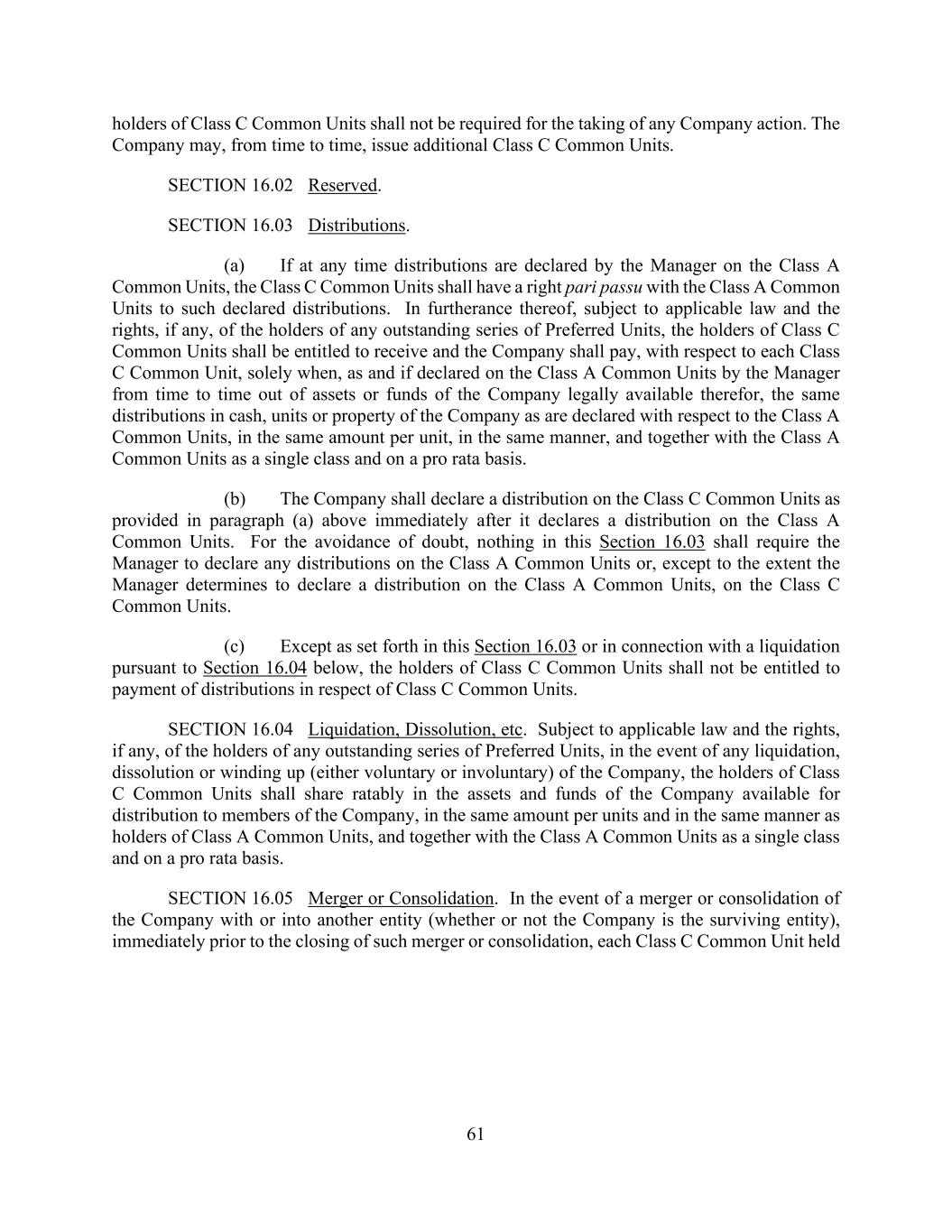 61 holders of Class C Common Units shall not be required for the taking of any Company action. The Company may, from time to time, issue additional Class C Common Units. SECTION 16.02 Reserved. SECTION 16.03 Distributions. (a) If at any time distributions are declared by the Manager on the Class A Common Units, the Class C Common Units shall have a right pari passu with the Class A Common Units to such declared distributions. In furtherance thereof, subject to applicable law and the rights, if any, of the holders of any outstanding series of Preferred Units, the holders of Class C Common Units shall be entitled to receive and the Company shall pay, with respect to each Class C Common Unit, solely when, as and if declared on the Class A Common Units by the Manager from time to time out of assets or funds of the Company legally available therefor, the same distributions in cash, units or property of the Company as are declared with respect to the Class A Common Units, in the same amount per unit, in the same manner, and together with the Class A Common Units as a single class and on a pro rata basis. (b) The Company shall declare a distribution on the Class C Common Units as provided in paragraph (a) above immediately after it declares a distribution on the Class A Common Units. For the avoidance of doubt, nothing in this Section 16.03 shall require the Manager to declare any distributions on the Class A Common Units or, except to the extent the Manager determines to declare a distribution on the Class A Common Units, on the Class C Common Units. (c) Except as set forth in this Section 16.03 or in connection with a liquidation pursuant to Section 16.04 below, the holders of Class C Common Units shall not be entitled to payment of distributions in respect of Class C Common Units. SECTION 16.04 Liquidation, Dissolution, etc. Subject to applicable law and the rights, if any, of the holders of any outstanding series of Preferred Units, in the event of any liquidation, dissolution or winding up (either voluntary or involuntary) of the Company, the holders of Class C Common Units shall share ratably in the assets and funds of the Company available for distribution to members of the Company, in the same amount per units and in the same manner as holders of Class A Common Units, and together with the Class A Common Units as a single class and on a pro rata basis. SECTION 16.05 Merger or Consolidation. In the event of a merger or consolidation of the Company with or into another entity (whether or not the Company is the surviving entity), immediately prior to the closing of such merger or consolidation, each Class C Common Unit held