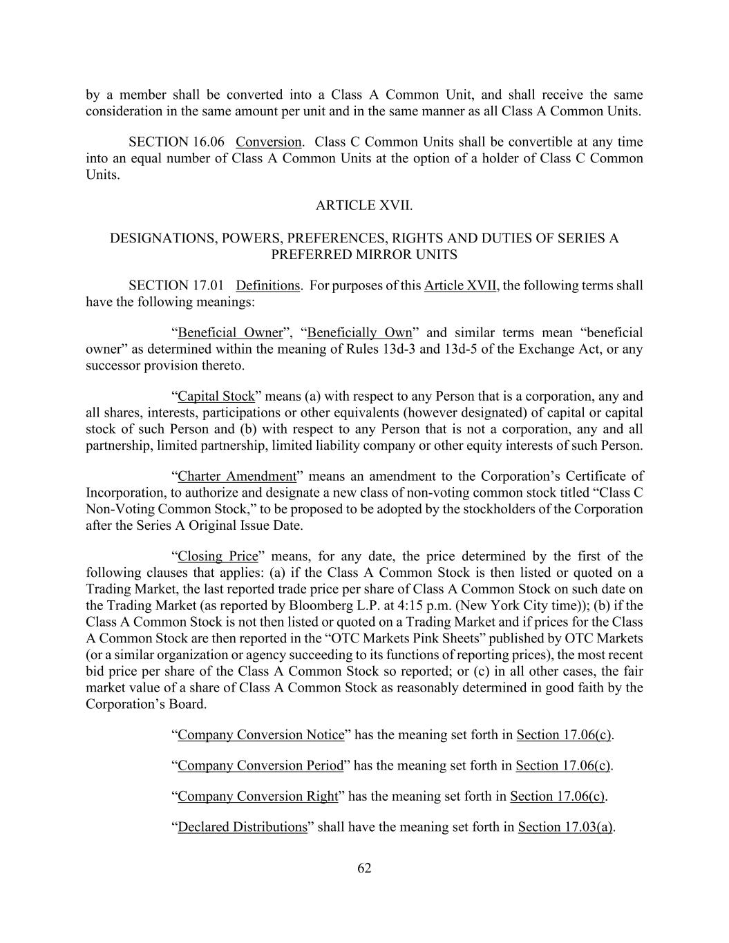 62 by a member shall be converted into a Class A Common Unit, and shall receive the same consideration in the same amount per unit and in the same manner as all Class A Common Units. SECTION 16.06 Conversion. Class C Common Units shall be convertible at any time into an equal number of Class A Common Units at the option of a holder of Class C Common Units. ARTICLE XVII. DESIGNATIONS, POWERS, PREFERENCES, RIGHTS AND DUTIES OF SERIES A PREFERRED MIRROR UNITS SECTION 17.01 Definitions. For purposes of this Article XVII, the following terms shall have the following meanings: “Beneficial Owner”, “Beneficially Own” and similar terms mean “beneficial owner” as determined within the meaning of Rules 13d-3 and 13d-5 of the Exchange Act, or any successor provision thereto. “Capital Stock” means (a) with respect to any Person that is a corporation, any and all shares, interests, participations or other equivalents (however designated) of capital or capital stock of such Person and (b) with respect to any Person that is not a corporation, any and all partnership, limited partnership, limited liability company or other equity interests of such Person. “Charter Amendment” means an amendment to the Corporation’s Certificate of Incorporation, to authorize and designate a new class of non-voting common stock titled “Class C Non-Voting Common Stock,” to be proposed to be adopted by the stockholders of the Corporation after the Series A Original Issue Date. “Closing Price” means, for any date, the price determined by the first of the following clauses that applies: (a) if the Class A Common Stock is then listed or quoted on a Trading Market, the last reported trade price per share of Class A Common Stock on such date on the Trading Market (as reported by Bloomberg L.P. at 4:15 p.m. (New York City time)); (b) if the Class A Common Stock is not then listed or quoted on a Trading Market and if prices for the Class A Common Stock are then reported in the “OTC Markets Pink Sheets” published by OTC Markets (or a similar organization or agency succeeding to its functions of reporting prices), the most recent bid price per share of the Class A Common Stock so reported; or (c) in all other cases, the fair market value of a share of Class A Common Stock as reasonably determined in good faith by the Corporation’s Board. “Company Conversion Notice” has the meaning set forth in Section 17.06(c). “Company Conversion Period” has the meaning set forth in Section 17.06(c). “Company Conversion Right” has the meaning set forth in Section 17.06(c). “Declared Distributions” shall have the meaning set forth in Section 17.03(a).