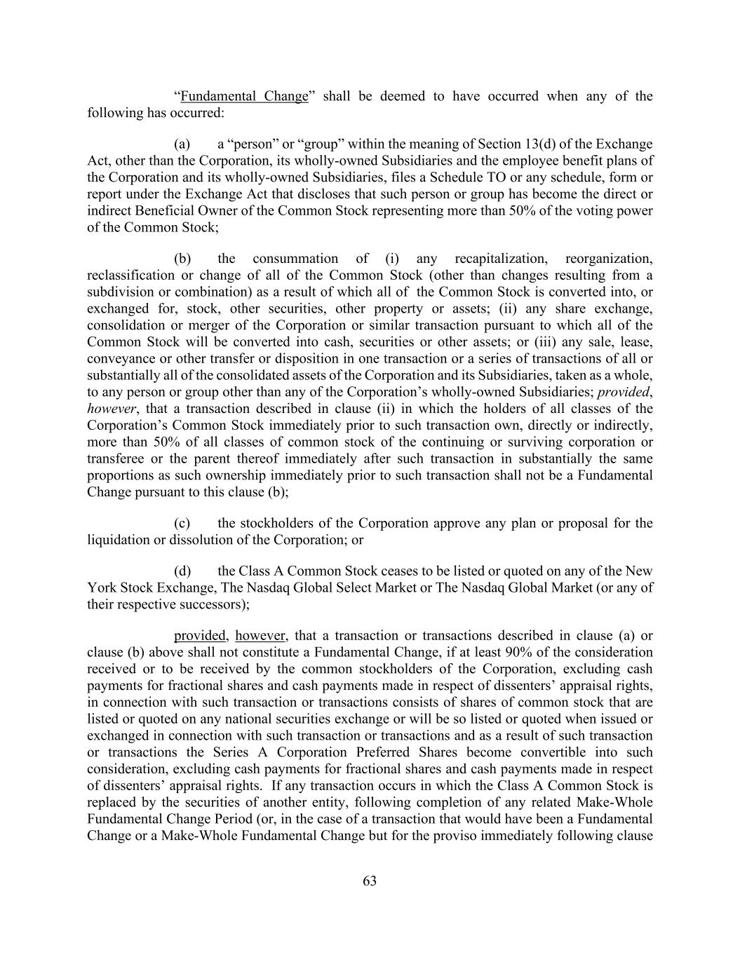 63 “Fundamental Change” shall be deemed to have occurred when any of the following has occurred: (a) a “person” or “group” within the meaning of Section 13(d) of the Exchange Act, other than the Corporation, its wholly-owned Subsidiaries and the employee benefit plans of the Corporation and its wholly-owned Subsidiaries, files a Schedule TO or any schedule, form or report under the Exchange Act that discloses that such person or group has become the direct or indirect Beneficial Owner of the Common Stock representing more than 50% of the voting power of the Common Stock; (b) the consummation of (i) any recapitalization, reorganization, reclassification or change of all of the Common Stock (other than changes resulting from a subdivision or combination) as a result of which all of the Common Stock is converted into, or exchanged for, stock, other securities, other property or assets; (ii) any share exchange, consolidation or merger of the Corporation or similar transaction pursuant to which all of the Common Stock will be converted into cash, securities or other assets; or (iii) any sale, lease, conveyance or other transfer or disposition in one transaction or a series of transactions of all or substantially all of the consolidated assets of the Corporation and its Subsidiaries, taken as a whole, to any person or group other than any of the Corporation’s wholly-owned Subsidiaries; provided, however, that a transaction described in clause (ii) in which the holders of all classes of the Corporation’s Common Stock immediately prior to such transaction own, directly or indirectly, more than 50% of all classes of common stock of the continuing or surviving corporation or transferee or the parent thereof immediately after such transaction in substantially the same proportions as such ownership immediately prior to such transaction shall not be a Fundamental Change pursuant to this clause (b); (c) the stockholders of the Corporation approve any plan or proposal for the liquidation or dissolution of the Corporation; or (d) the Class A Common Stock ceases to be listed or quoted on any of the New York Stock Exchange, The Nasdaq Global Select Market or The Nasdaq Global Market (or any of their respective successors); provided, however, that a transaction or transactions described in clause (a) or clause (b) above shall not constitute a Fundamental Change, if at least 90% of the consideration received or to be received by the common stockholders of the Corporation, excluding cash payments for fractional shares and cash payments made in respect of dissenters’ appraisal rights, in connection with such transaction or transactions consists of shares of common stock that are listed or quoted on any national securities exchange or will be so listed or quoted when issued or exchanged in connection with such transaction or transactions and as a result of such transaction or transactions the Series A Corporation Preferred Shares become convertible into such consideration, excluding cash payments for fractional shares and cash payments made in respect of dissenters’ appraisal rights. If any transaction occurs in which the Class A Common Stock is replaced by the securities of another entity, following completion of any related Make-Whole Fundamental Change Period (or, in the case of a transaction that would have been a Fundamental Change or a Make-Whole Fundamental Change but for the proviso immediately following clause