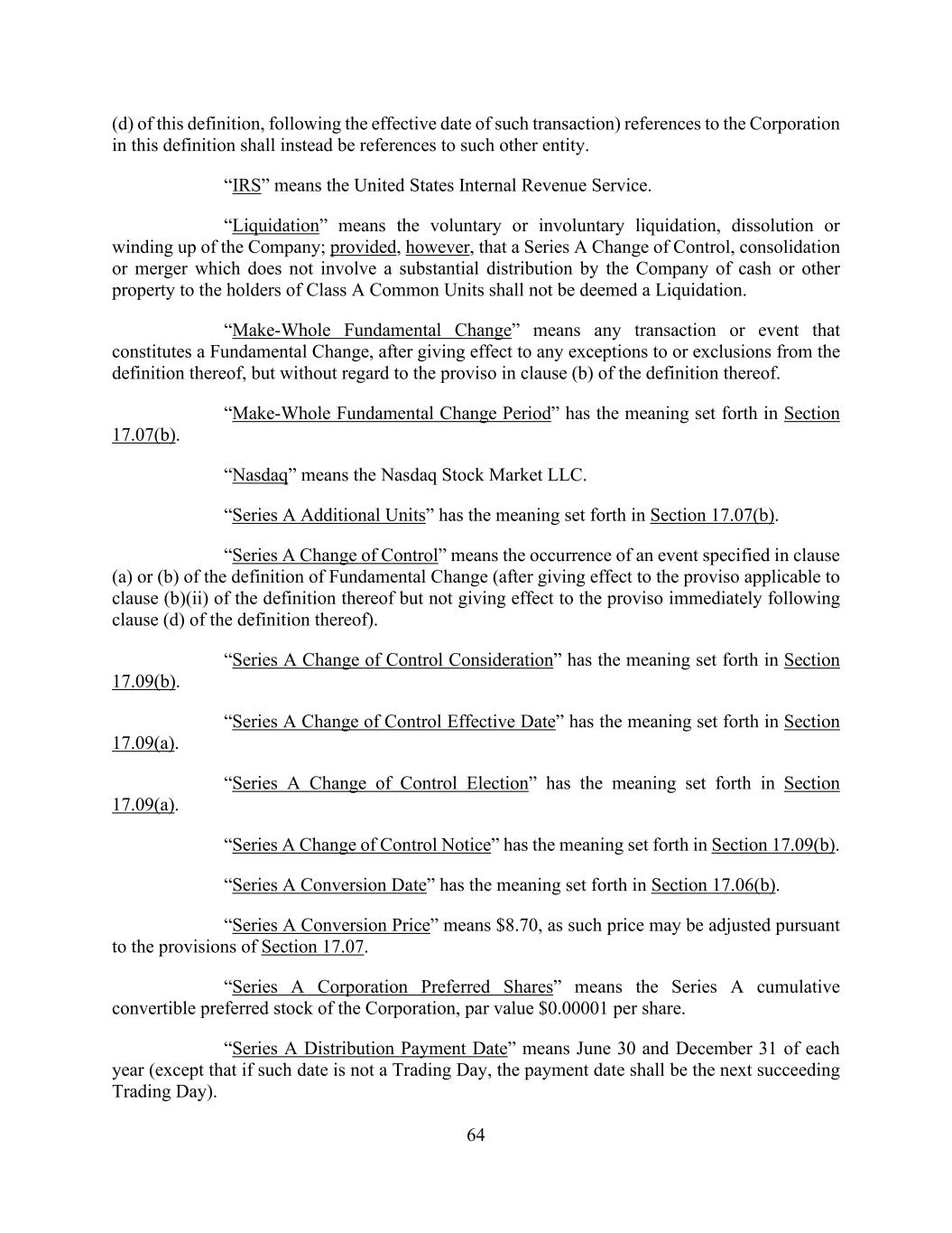 64 (d) of this definition, following the effective date of such transaction) references to the Corporation in this definition shall instead be references to such other entity. “IRS” means the United States Internal Revenue Service. “Liquidation” means the voluntary or involuntary liquidation, dissolution or winding up of the Company; provided, however, that a Series A Change of Control, consolidation or merger which does not involve a substantial distribution by the Company of cash or other property to the holders of Class A Common Units shall not be deemed a Liquidation. “Make-Whole Fundamental Change” means any transaction or event that constitutes a Fundamental Change, after giving effect to any exceptions to or exclusions from the definition thereof, but without regard to the proviso in clause (b) of the definition thereof. “Make-Whole Fundamental Change Period” has the meaning set forth in Section 17.07(b). “Nasdaq” means the Nasdaq Stock Market LLC. “Series A Additional Units” has the meaning set forth in Section 17.07(b). “Series A Change of Control” means the occurrence of an event specified in clause (a) or (b) of the definition of Fundamental Change (after giving effect to the proviso applicable to clause (b)(ii) of the definition thereof but not giving effect to the proviso immediately following clause (d) of the definition thereof). “Series A Change of Control Consideration” has the meaning set forth in Section 17.09(b). “Series A Change of Control Effective Date” has the meaning set forth in Section 17.09(a). “Series A Change of Control Election” has the meaning set forth in Section 17.09(a). “Series A Change of Control Notice” has the meaning set forth in Section 17.09(b). “Series A Conversion Date” has the meaning set forth in Section 17.06(b). “Series A Conversion Price” means $8.70, as such price may be adjusted pursuant to the provisions of Section 17.07. “Series A Corporation Preferred Shares” means the Series A cumulative convertible preferred stock of the Corporation, par value $0.00001 per share. “Series A Distribution Payment Date” means June 30 and December 31 of each year (except that if such date is not a Trading Day, the payment date shall be the next succeeding Trading Day).